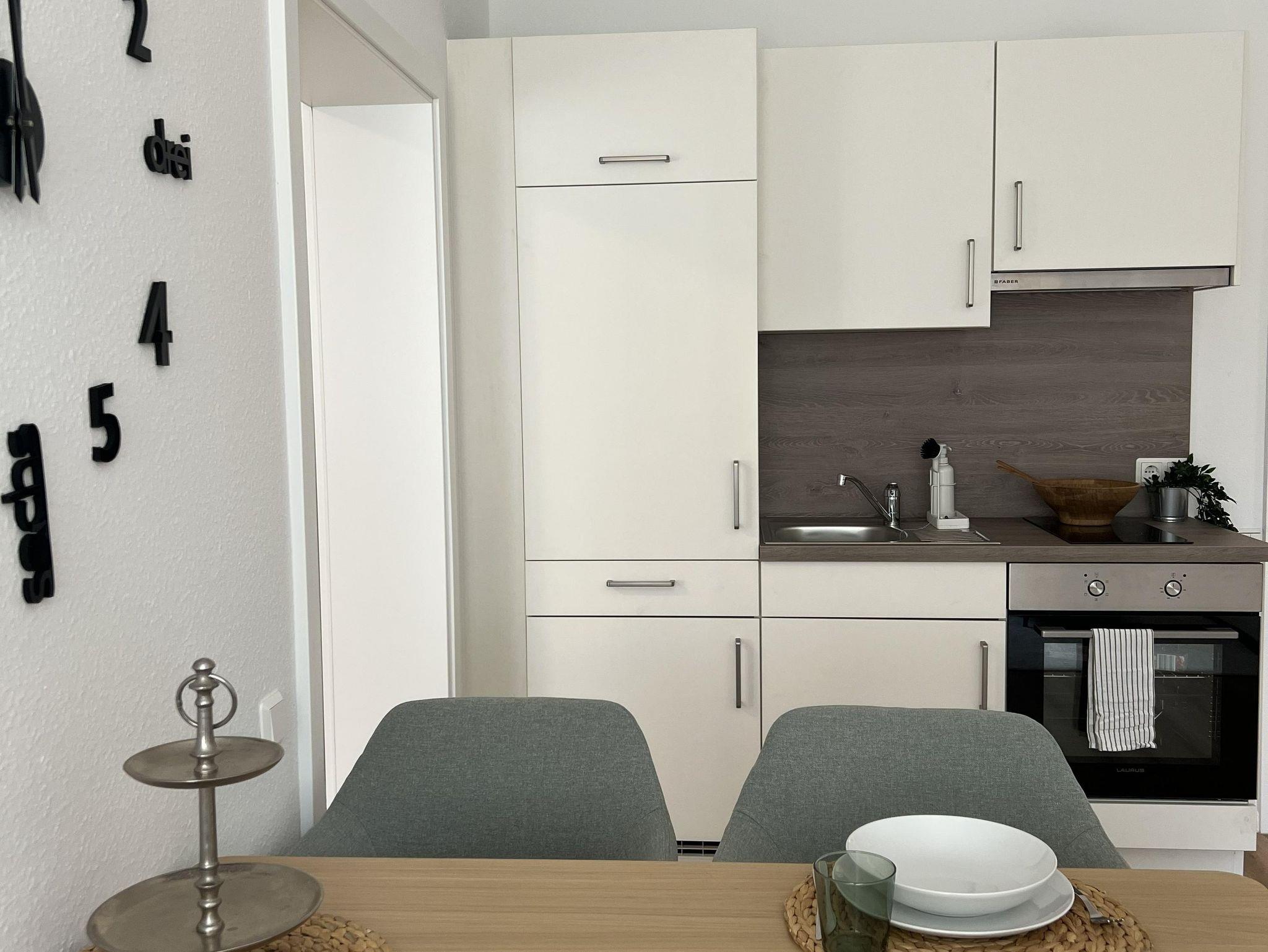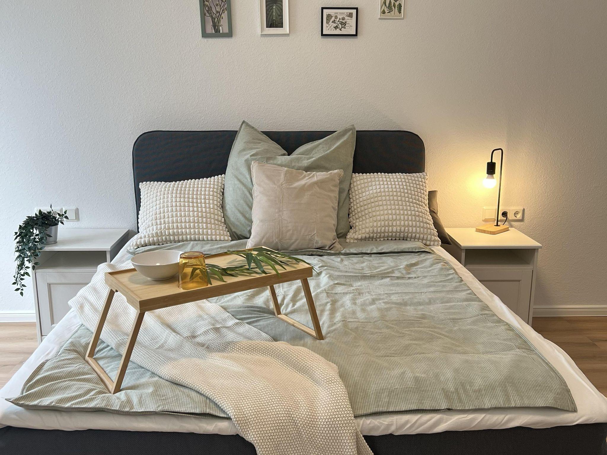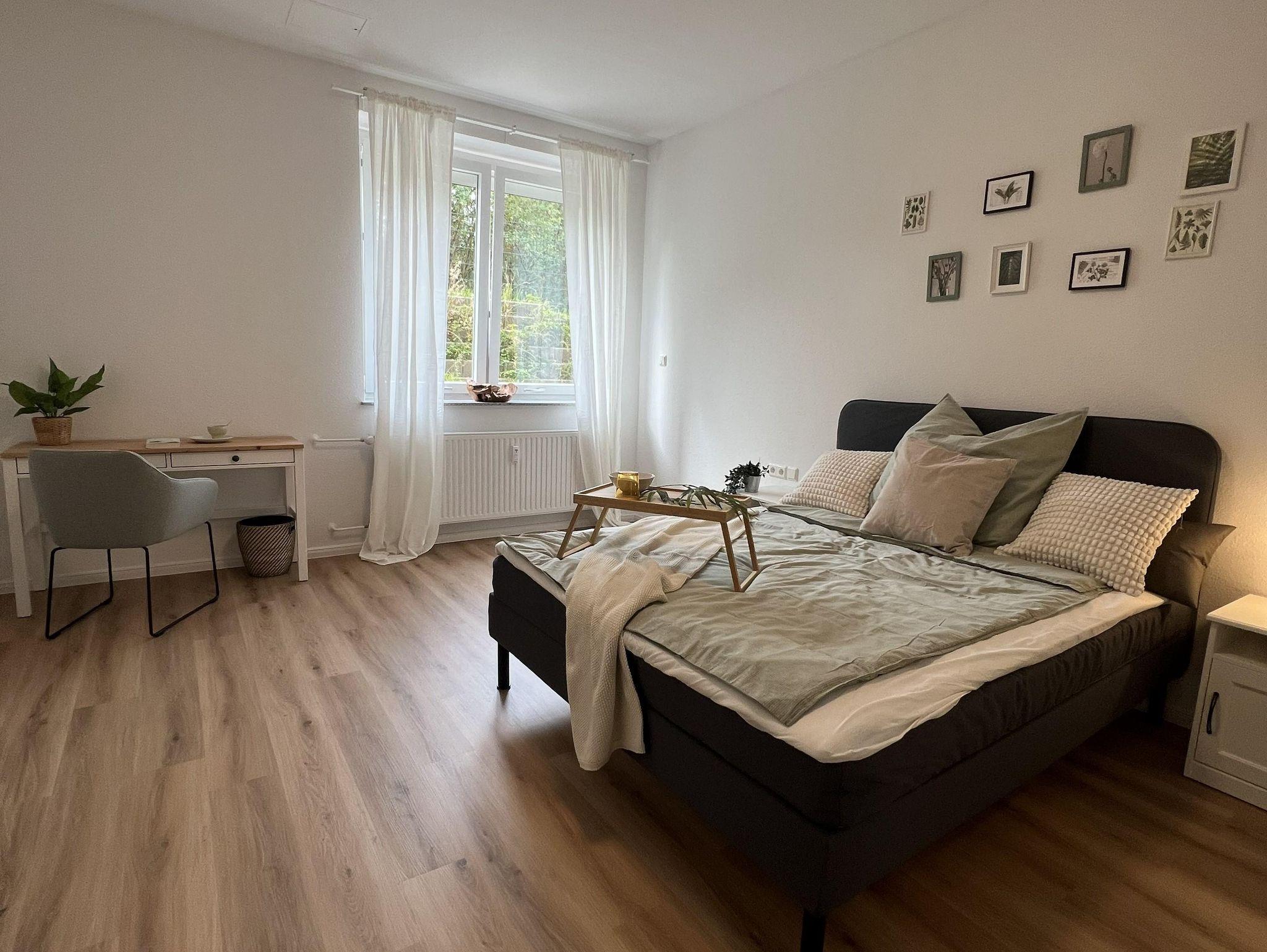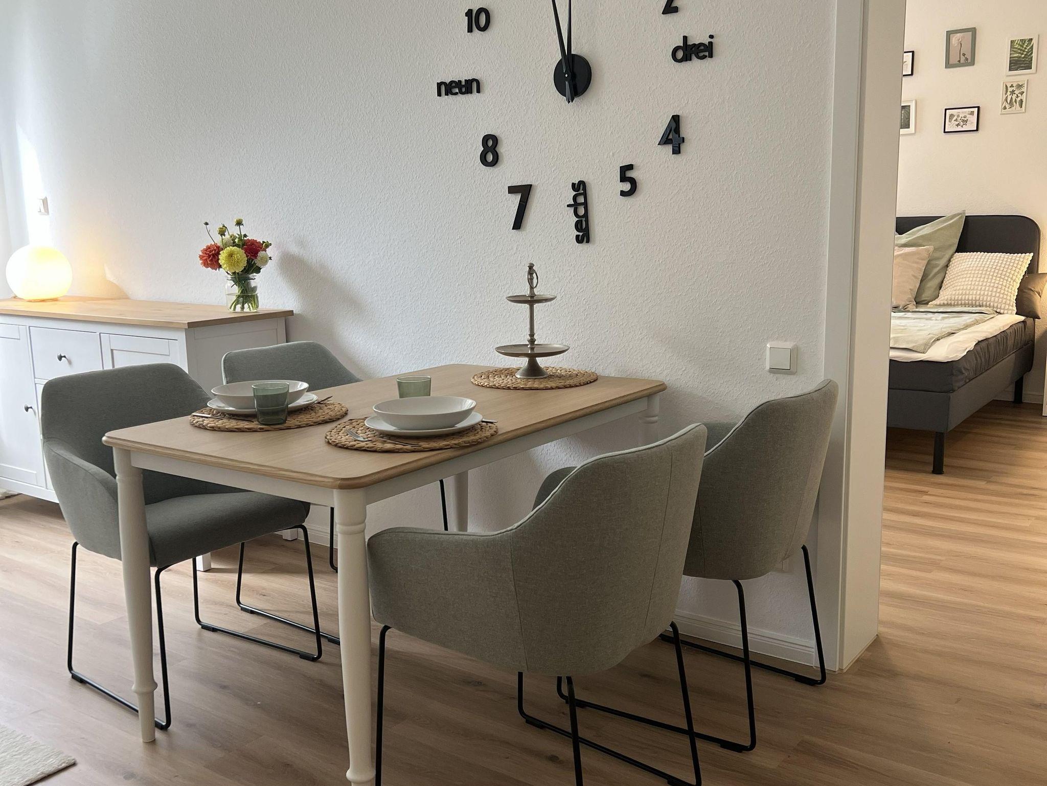 Die modern eingerichtete Ferienwohnung erstreckt sich über 69 m² und bietet ein helles Wohnzimmer mit Schlafcouch, TV und Esstisch, ein separates Schlafzimmer mit Doppelbett und Arbeitsbereich sowie eine vollständig ausgestattete Einbauküche. Das Badezimmer verfügt über eine Dusche und moderne Ausstattung. Kostenfreies WLAN ist selbstverständlich vorhanden.