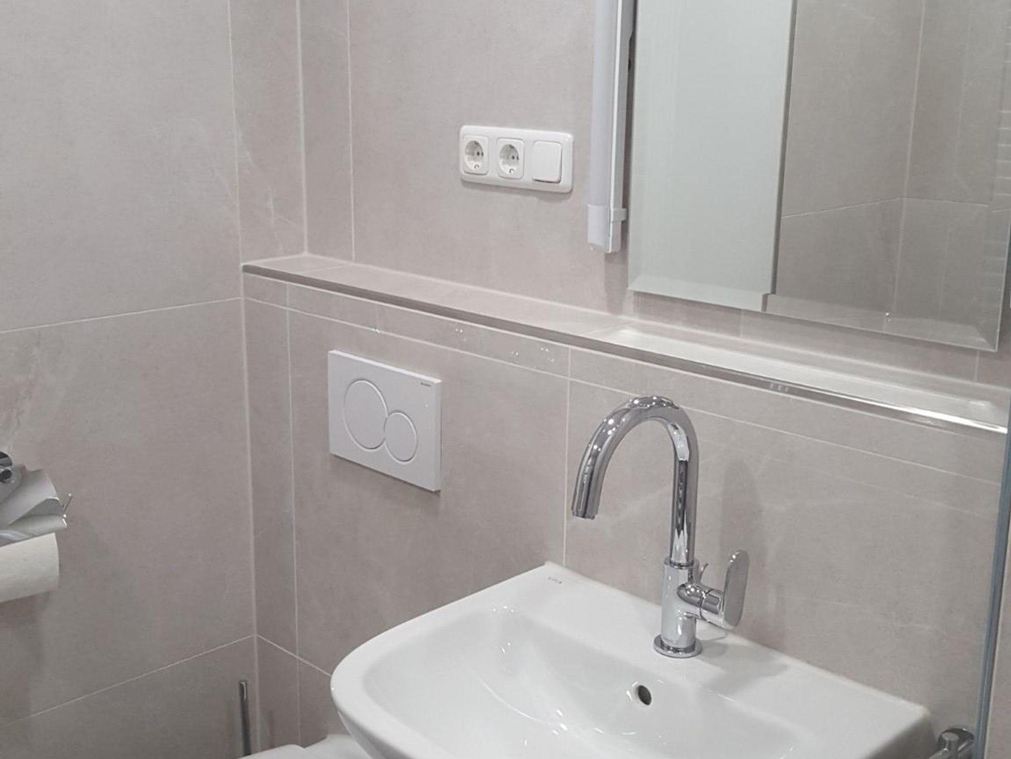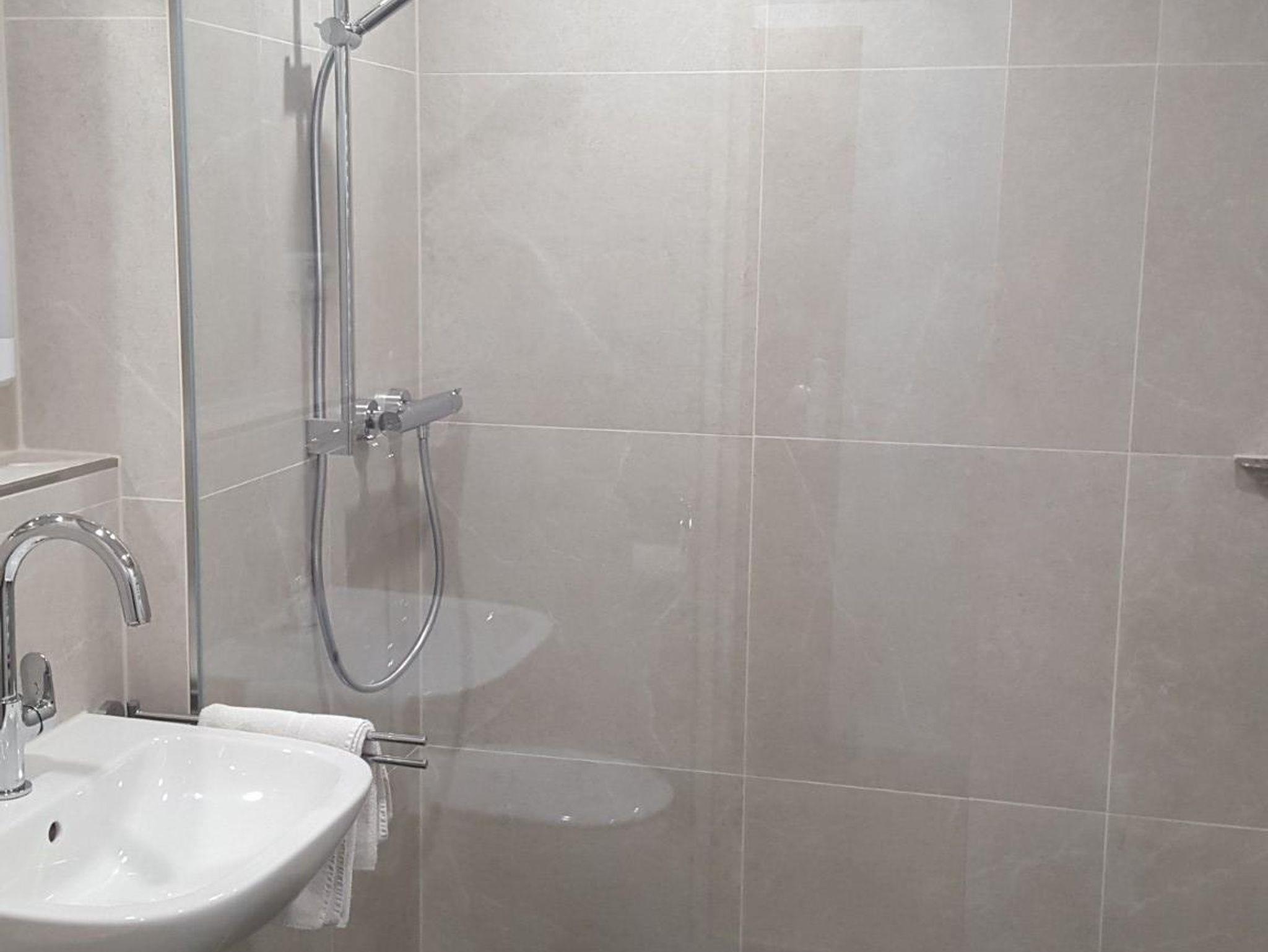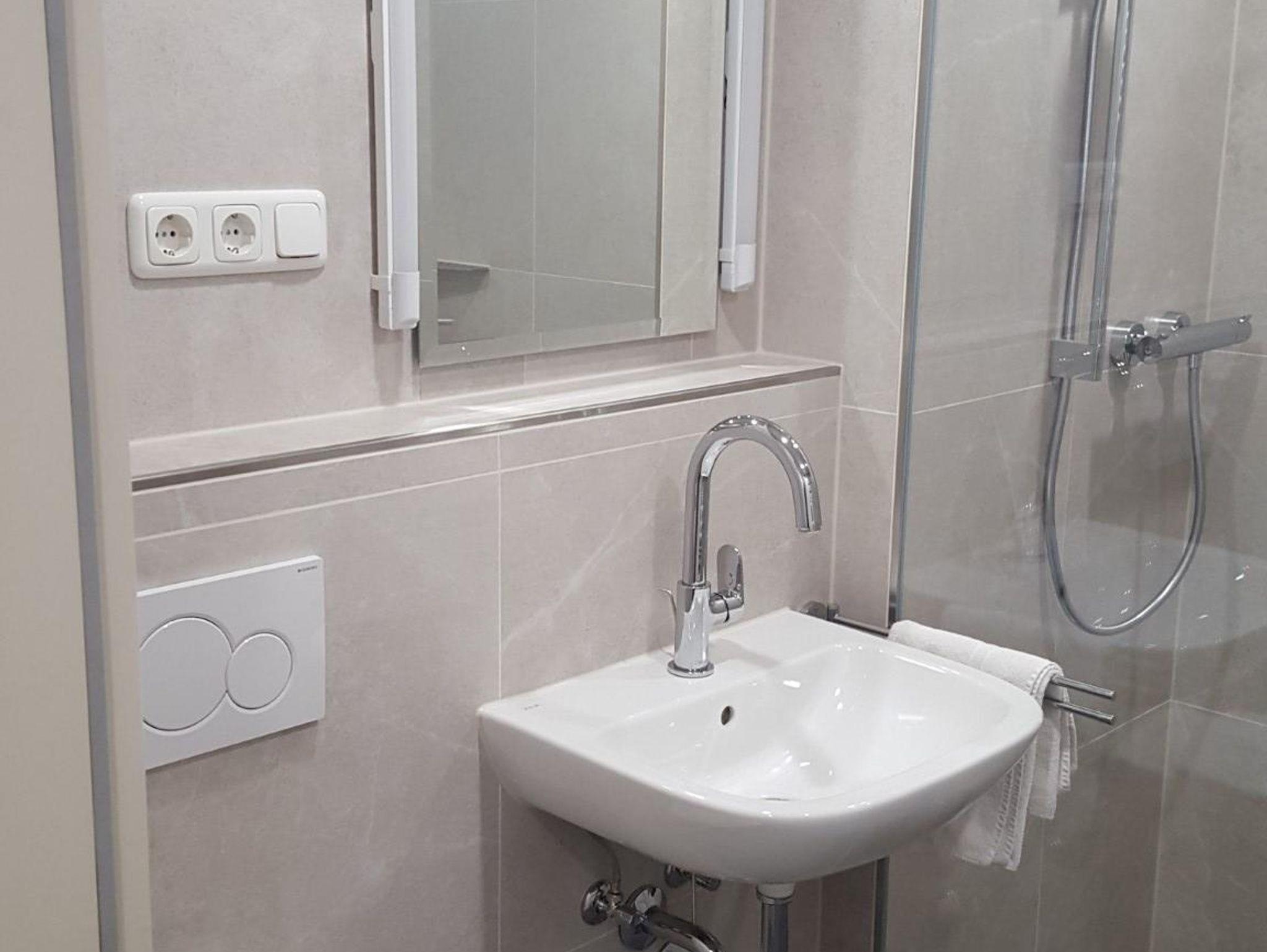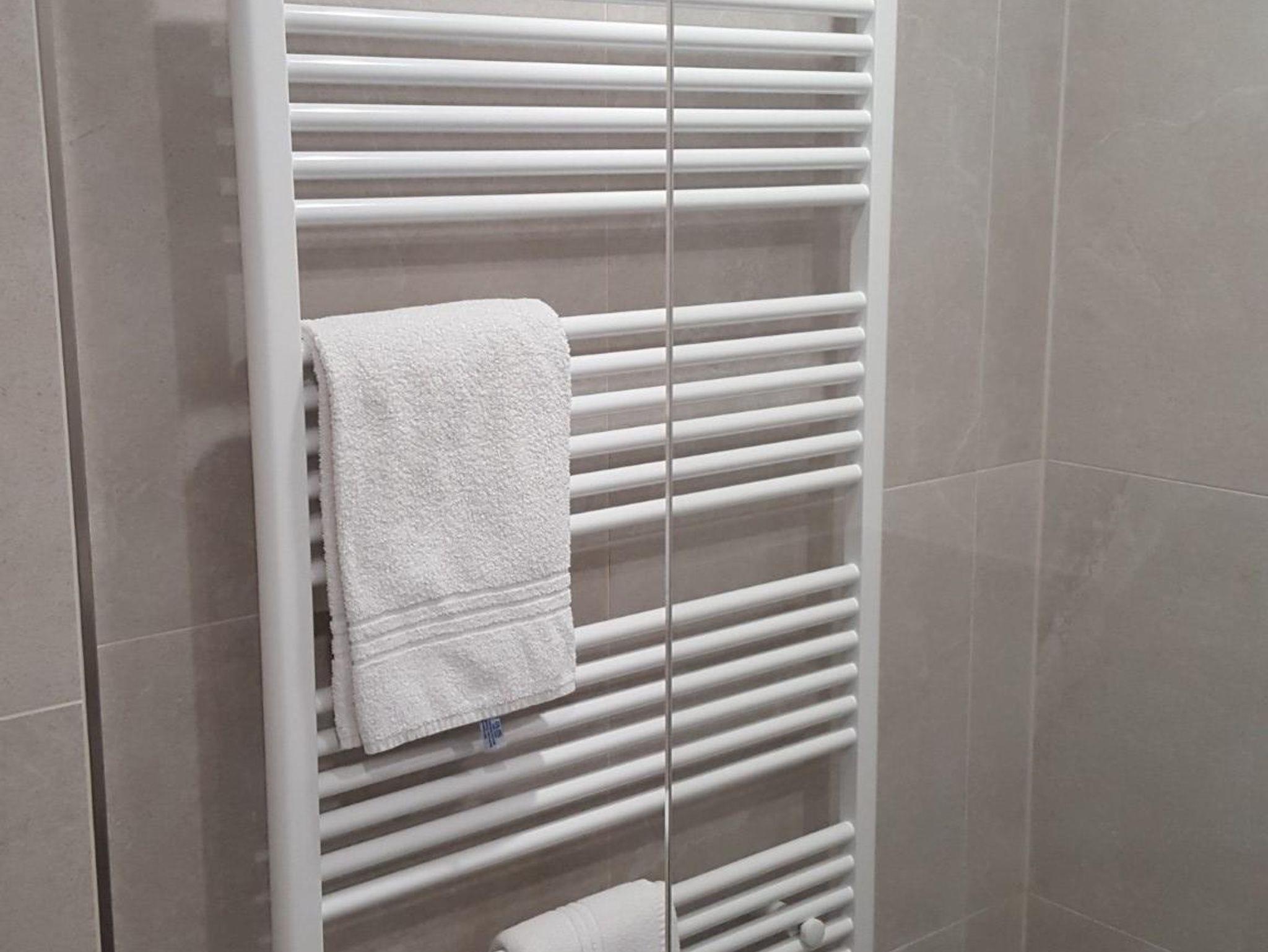 Das Bad ist komplett neu und verfügt über eine bodenebene Walk-in-Dusche mit Glaswand, WC, Waschbecken mit beleuchtetem Spiegel und großem Handtuchheizkörper. Ein Haartrockner ist vorhanden.