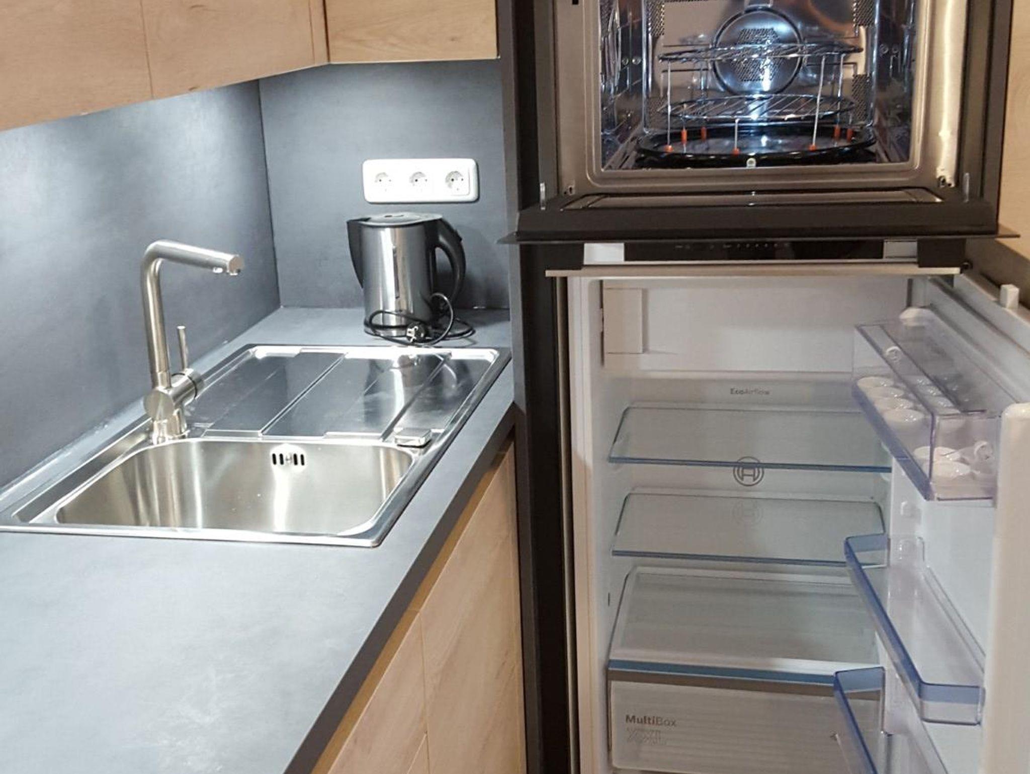 Die Einbauküche fügt sich perfekt in das Ensemble der restlichen Einbaumöbel ein. Sie ist mit einem 2-fach Induktionskochfeld, Backofen, großen Kühlschrank mit Gefrierfach, Wasserkocher, Kaffeemaschine sowie einer Grundausstattung an Töpfen, Geschirr, Besteck etc. ausgestattet.