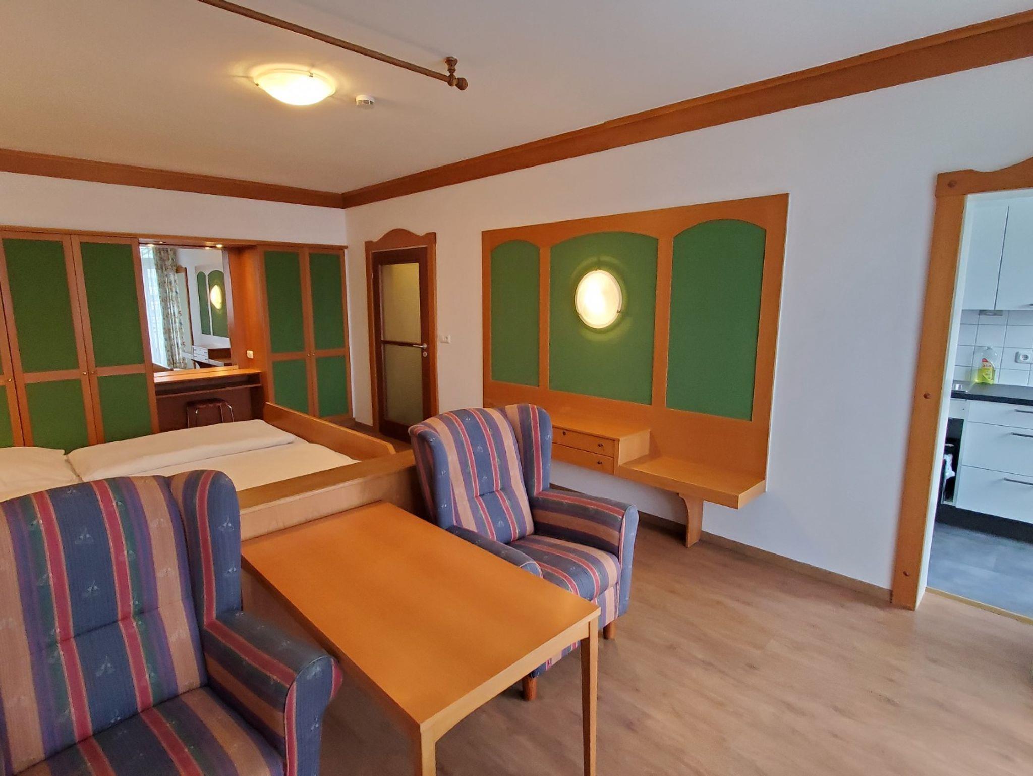 Das etwa 38 m² große Einzimmer-Apartment 304 bietet Platz für bis zu 2 Personen. Es befindet sich im 3. Stock nach Nordosten zum Parkplatz gelegen mit wunderschönem Blick auf den Staufen und Fuderheuberg sowie aufs Kirchholz und den Karlspark. Es ist mit zwei Doppelbetten (100 x 200 cm), einem gemütlichen Sitzbereich mit Ohrensesseln und Tisch, einem großen Einbauschrank, einem Sideboard und einem Schreibtisch mit Flachbild-TV ausgestattet. Steckdosen sind in großer Zahl und gut erreichbar in Bettnähe und beim Schreibtisch vorhanden. Die Küche wurde im Jahr 2020 komplett neu eingebaut. Sie ist mit einem großen Kochfeld mit Backofen, Kühlschrank mit Gefrierfach, Mikrowelle, Wasserkocher, Kaffeemaschine sowie einer Grundausstattung an Töpfen, Geschirr, Besteck etc. ausgestattet. Im Wohnraum wurde im Jahr 2024 ein neuer PVC-Boden in Eichenoptik eingebaut. Ebenfalls 2024 wurde das Bad komplett renoviert und verfügt nun über eine bodenebene Dusche. Im Vorraum befindet sich eine Garderobe sowie ein Kofferbock.