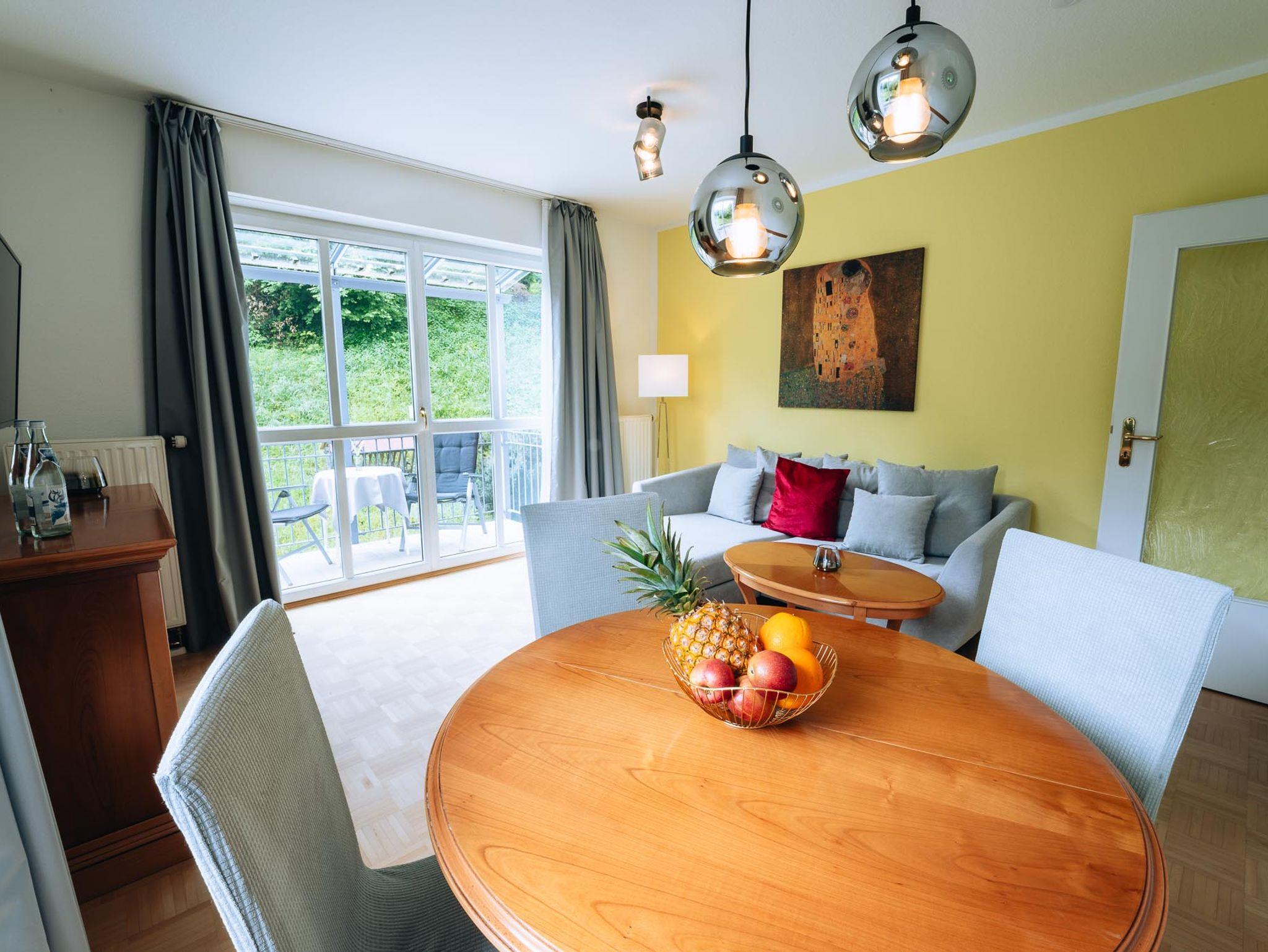 Unser schönes, gemütliches Apartement ist im klassisch- eleganten Stil eingerichtet. Die Wohnung befindet sich im 2. OG und verfügt über ein separates Schlafzimmer mit einem Doppelbett (Boxspringmatratzen - 1,80 x 2,00), ein Wohnzimmer mit Essecke, eine voll ausgestattete Küche mit Geschirrspüler, sowie ein Bad mit Dusche/WC. Von Ihrem Balkon (Ostseite) aus können Sie den Blick in die Natur genießen, wo sie mit etwas Glück manchmal Rehe oder Hasen beobachten können.