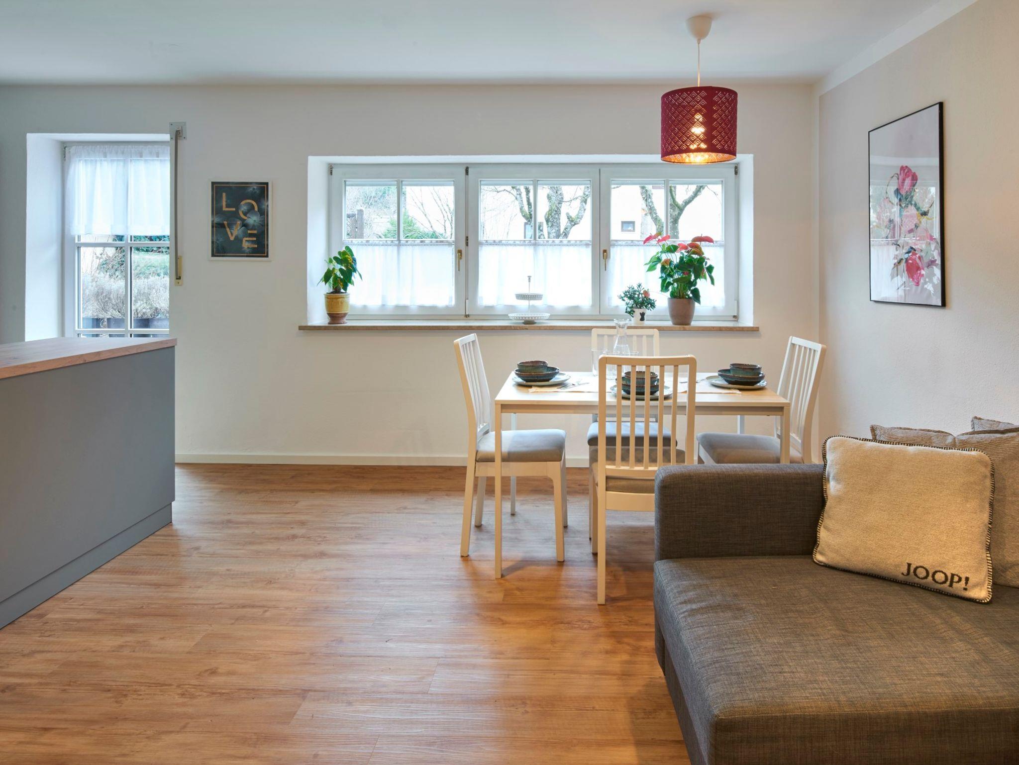 Die Wohnung ist mit ihrer Größe von 50 qm ideal für 1 - 4 Personen. Sie befindet sich im Erdgeschoss in absolut zentraler Lage in Bad Reichenhall. Genießen Sie Ihr Frühstück auf der gemütlichen Terrasse im Grünen! Im Wohnbereich befindet sich die sehr schöne Küche und der gemütliche Essbereich. Die Küche ist mit Kaffeemaschine, Wasserkocher und Toaster usw. für Ihren Aufenthalt gut ausgestattet. Im Bad haben Sie die Wahl zwischen Dusche oder Badewanne. Im Schlafzimmer ist ein Doppelbett für zwei Personen und im Wohnbereich eine Schlafcouch für 2 Personen. Wir freuen uns, wenn Sie bei uns Ihren Urlaub verbringen! Hauseigene Parkplätze nach Verfügbarkeit.