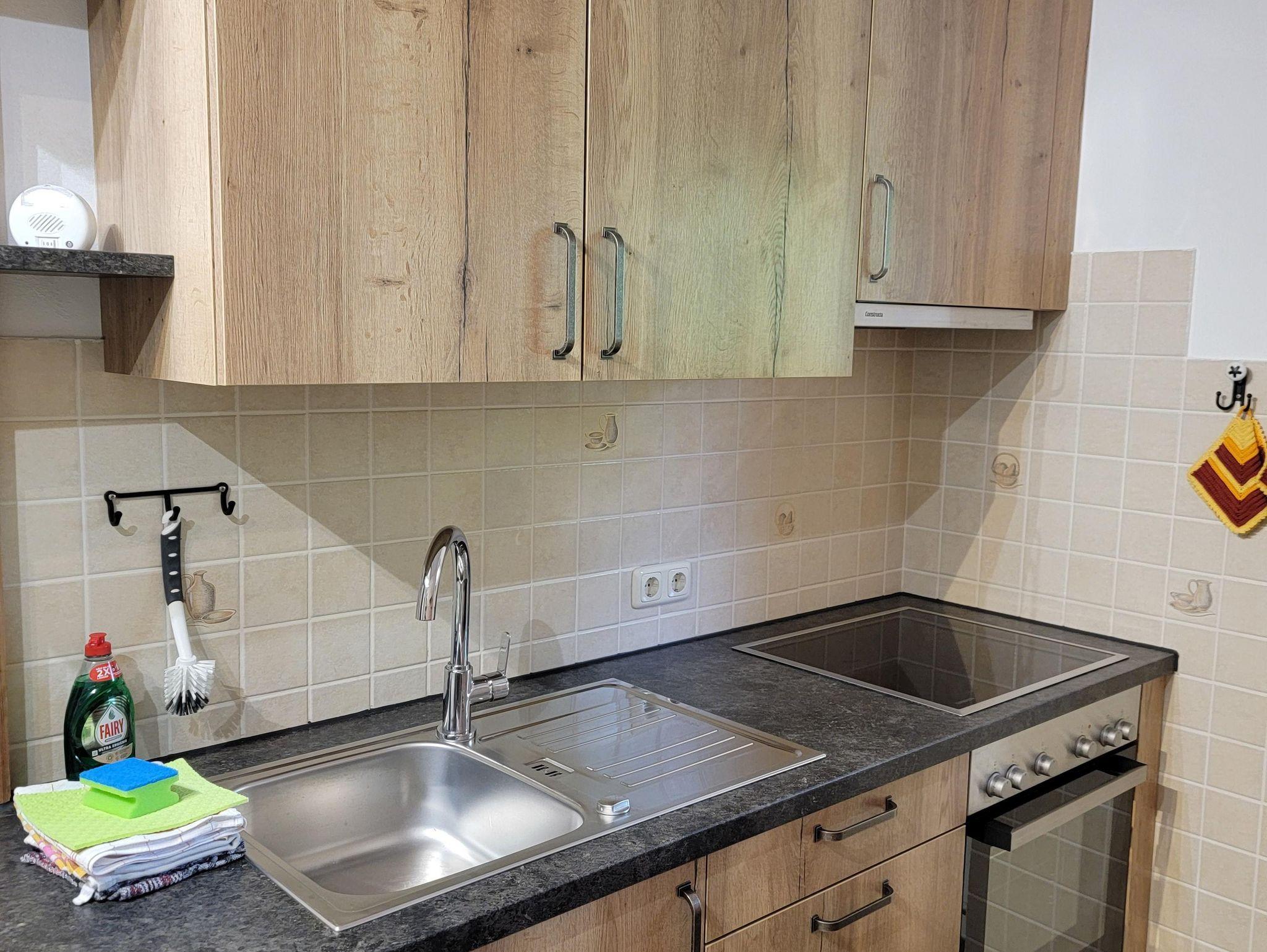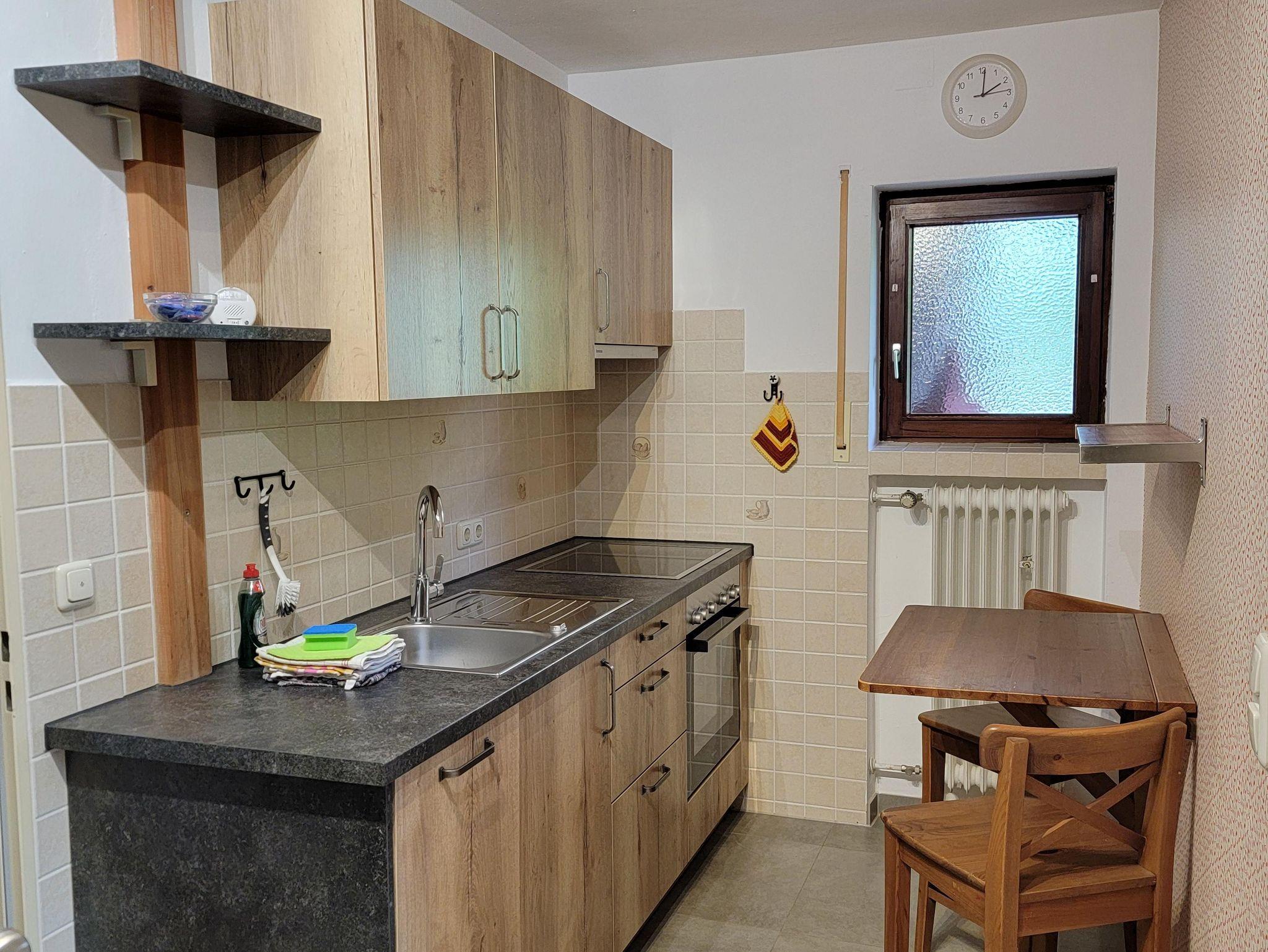 Unsere gemütliche Ferienwohnung ist mit einer Einbauküche mit Backofen und 3-Platten-Herd ausgestattet. Kaffeemaschine, Wasserkocher, Toaster, etc sind vorhanden. Im Wohnzimmer finden Sie eine gemütliche Sitzecke mit Sat-TV. Auf dem Balkon oder der Terrasse können sie ein wunderschönes Panorama genießen.
