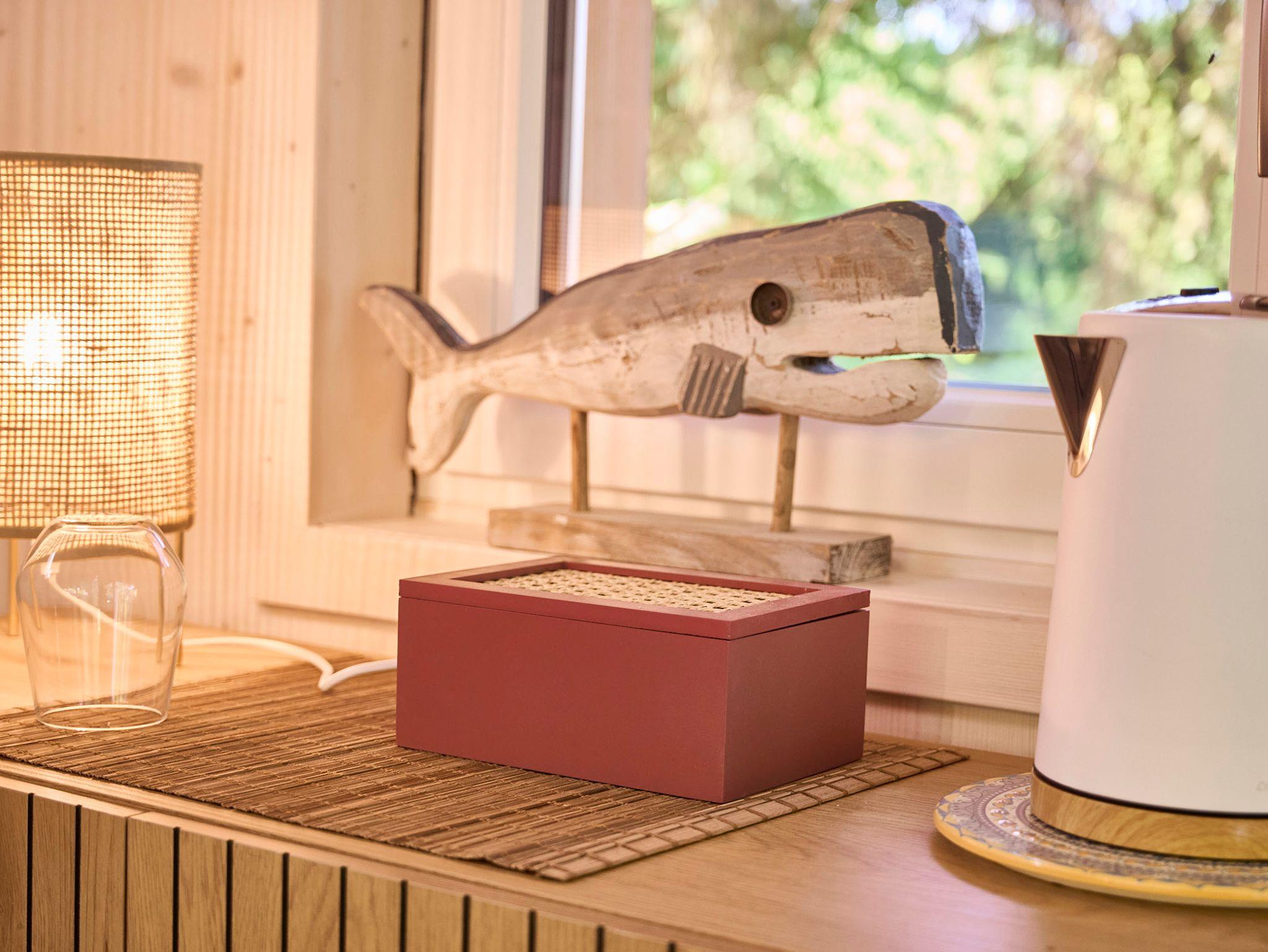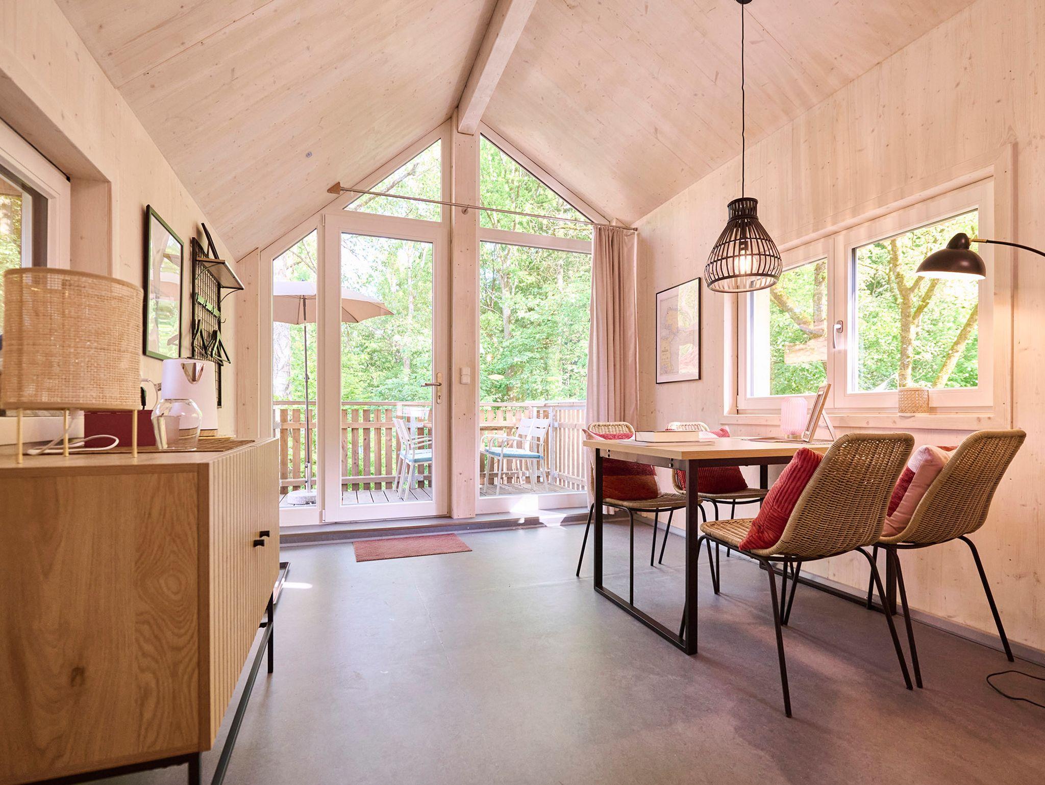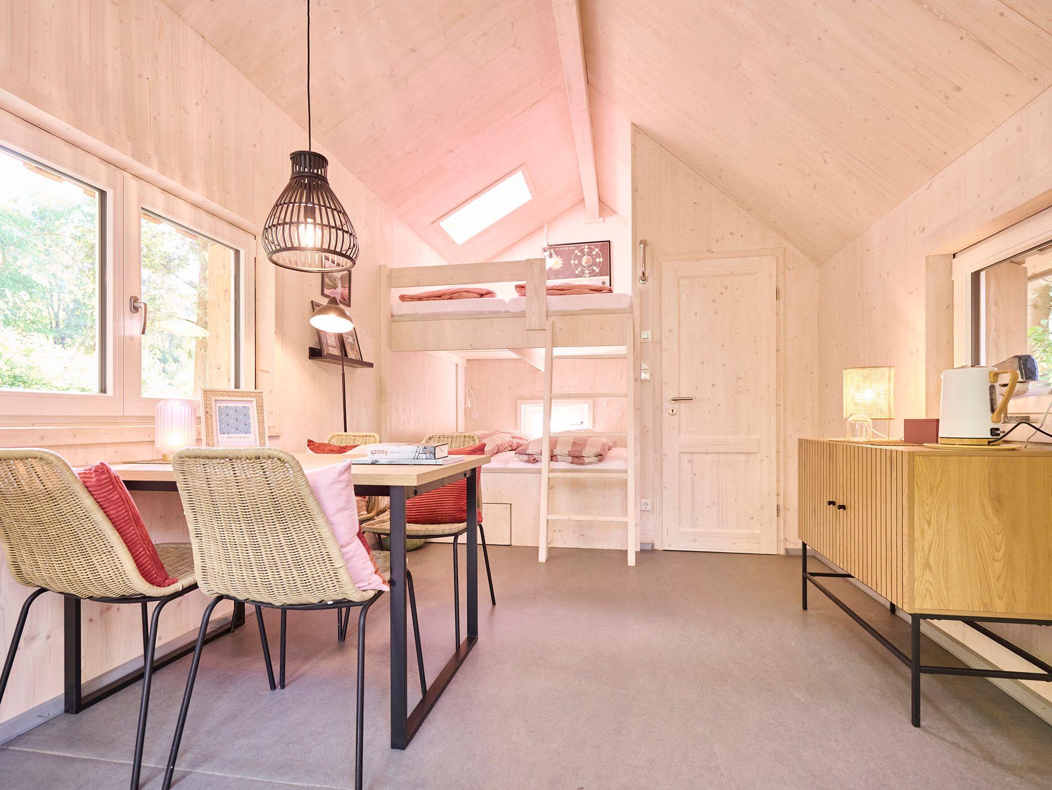 Unser Stelzenhaus Fehmarn ist für vier Personen gedacht, gerne können auch noch Babybett und Hochstuhl auf Anfrage dazu gestellt werden. Die Einrichtung ist naturfarben und schwarz mit schicken, martitimen Details. Der Raum ist ca. 20 qm groß und man kann bei kühlem , nassem Wetter sehr angenehm innen sitzen und den Blick durch das große Panoramafenster genießen. In allen Häusern gibt es Fußbodenheizung, also keine Angst vor der kühleren Jahreszeit. Außerdem gibt es Wasserkocher, Lesestoff, Spiele und Infomaterial.Im Haus gibt es außerdem ein Bad mit Trockentoilette und Waschbecken. Duschen sind im Sanitärblock und im Waldbad (Eintritt inbegriffen). Frühstück kann im Korb angeliefert werden und auf der schönen Terasse genossen werden.