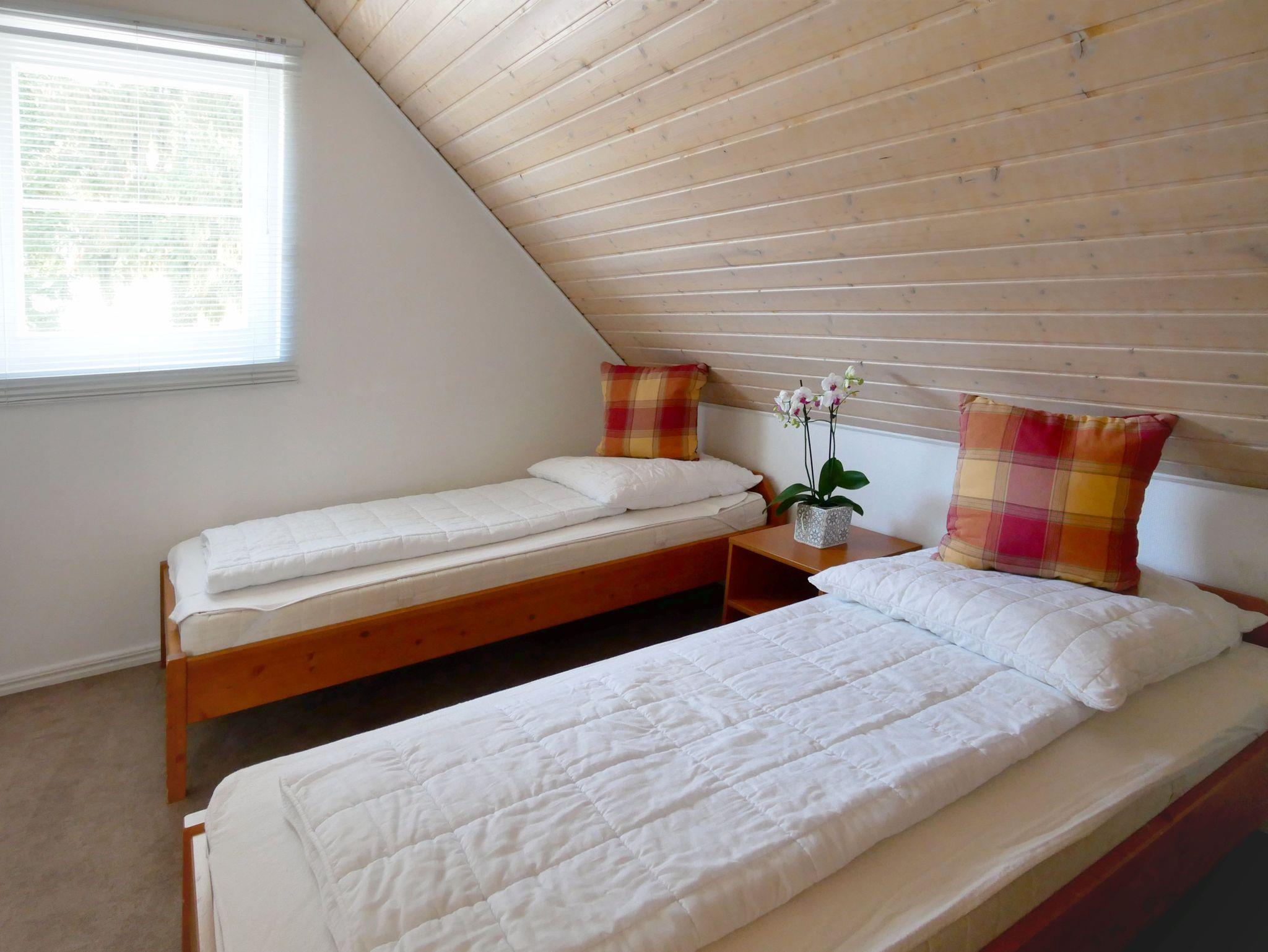 Dieses Reihenhaus (außen) mit 88 m² bietet auf zwei Ebenen Platz für 4+2 Personen mit 2 Schlafzimmern und einer offenen Schlafgalerie (Schlafsofa vorhanden), Sauna, Whirlpool und Kamin.