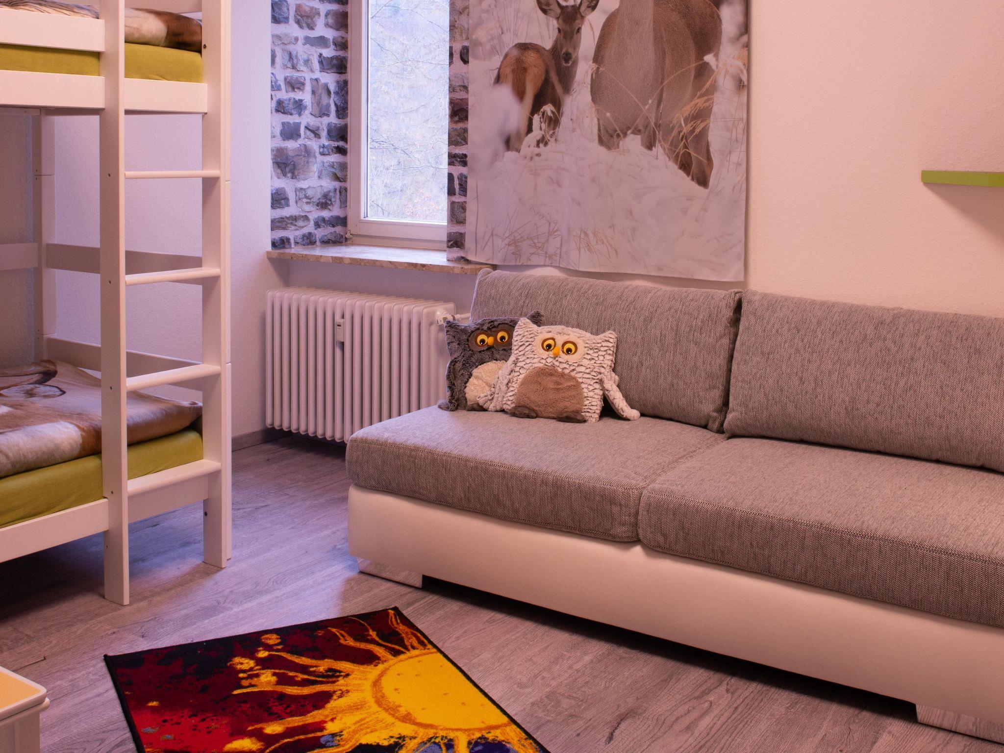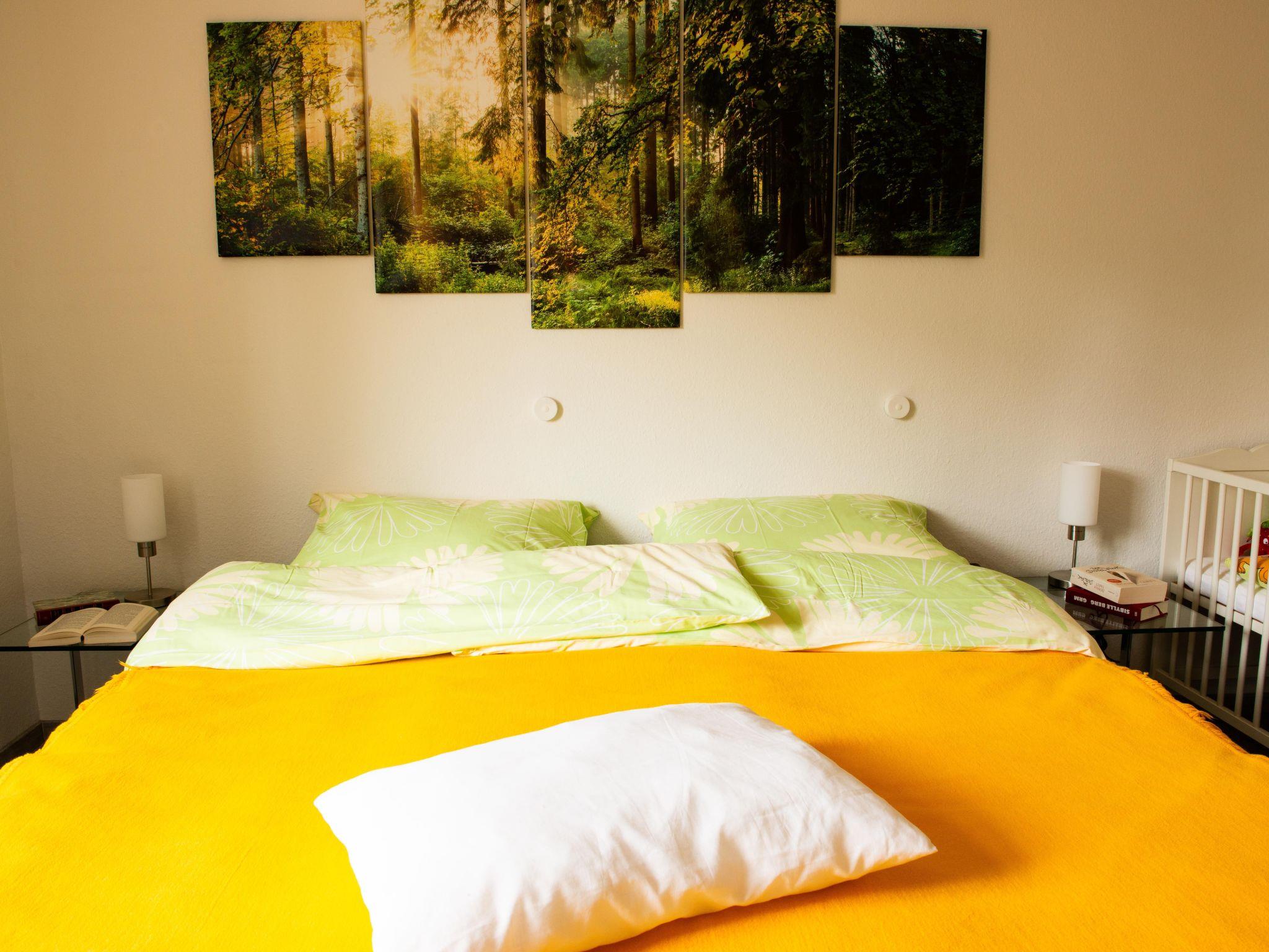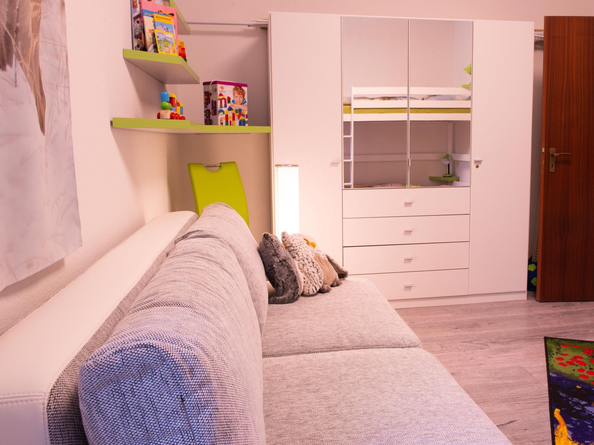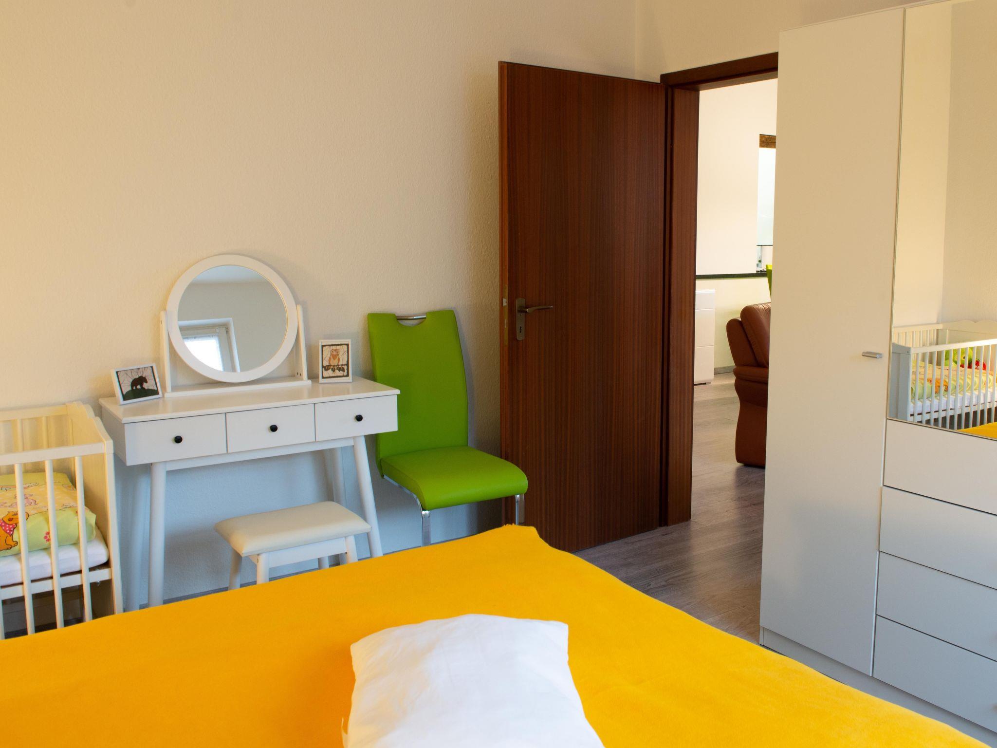 The 95 m² modern flat, renovated in 2021, is located on the first floor of a restored half-timbered house. It offers a large living room with dining table, large satellite TV, CD and DVD player. The bedroom has a double bed (1.80 m x 2.00 m), the second bedroom and children's room has a high-quality sofa bed with topper (1.60 x 2.00 m) and a large bunk bed (each 0.90 m x 2.00 m). There are high-quality children's toys, a colouring board with chalk, children's books and board games. There is also a fully equipped kitchen with cooker, dishwasher, fridge with freezer compartment, various coffee machines, blender, toaster, Sodamax and kettle. The large terrace with a view of the mountains is fully furnished and has a charcoal barbecue at your disposal. The bathroom has a walk-in shower and a washbasin with mirror cabinet. Bed linen is provided. Internet (WLAN) is also available free of charge.