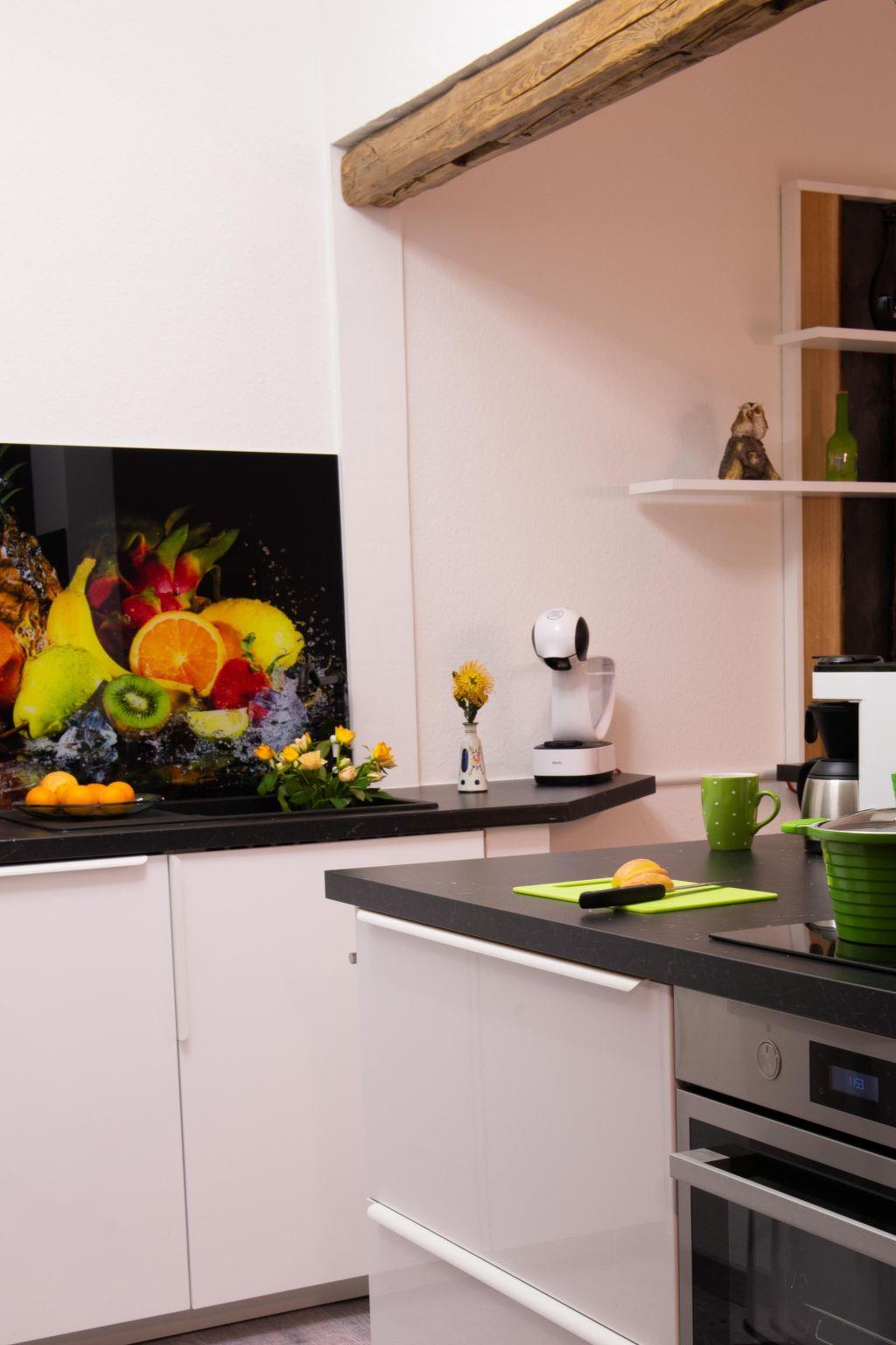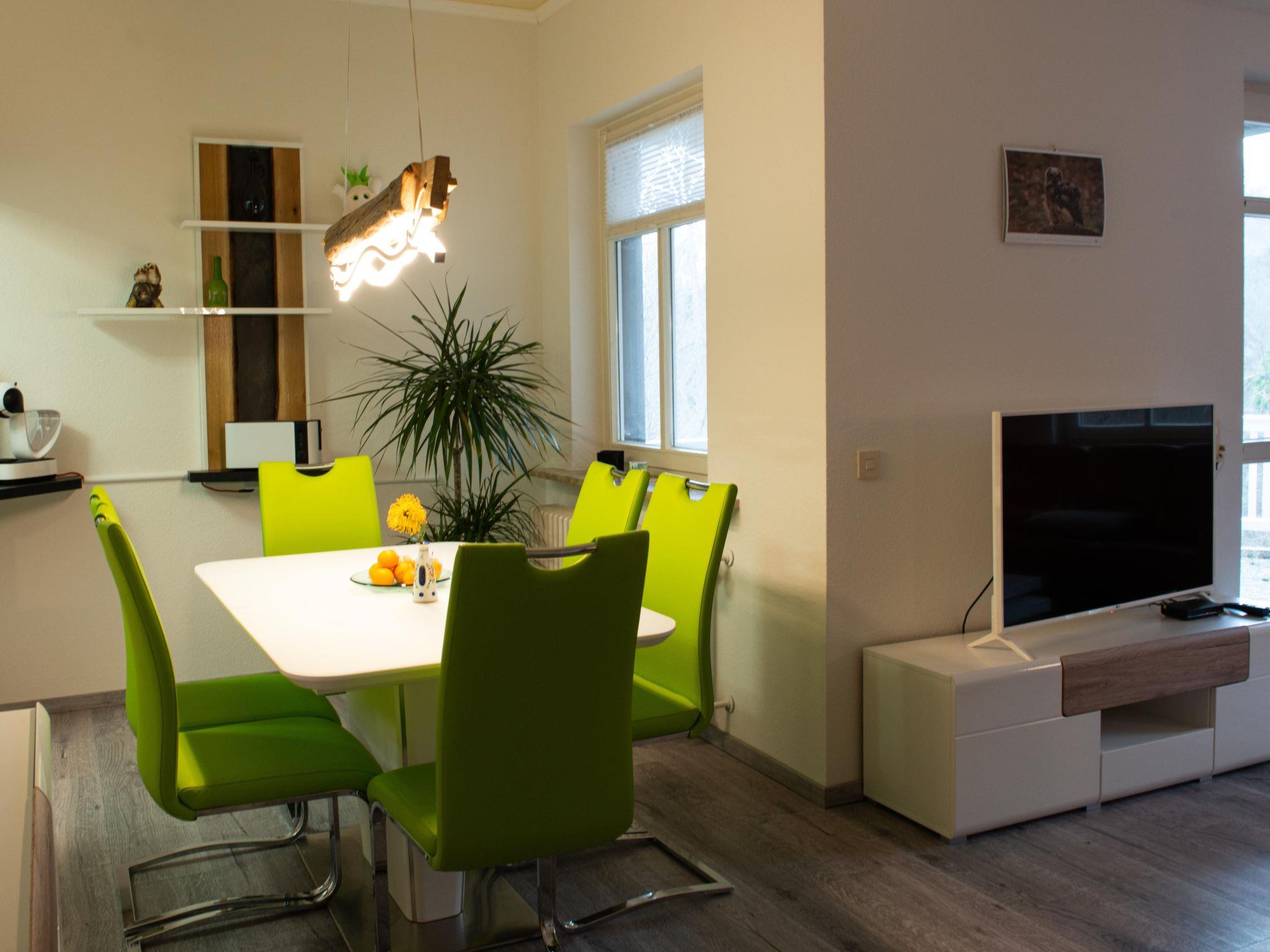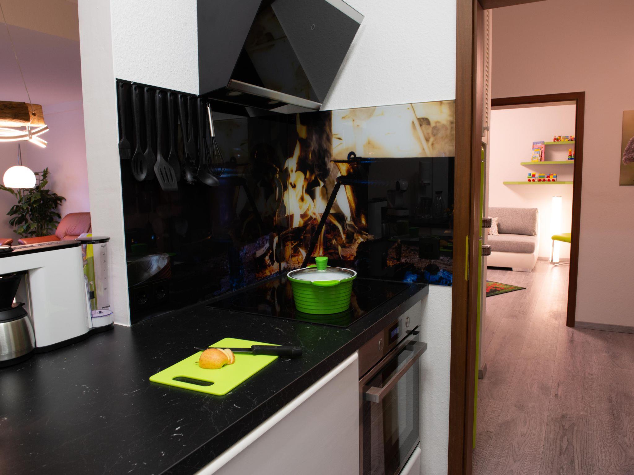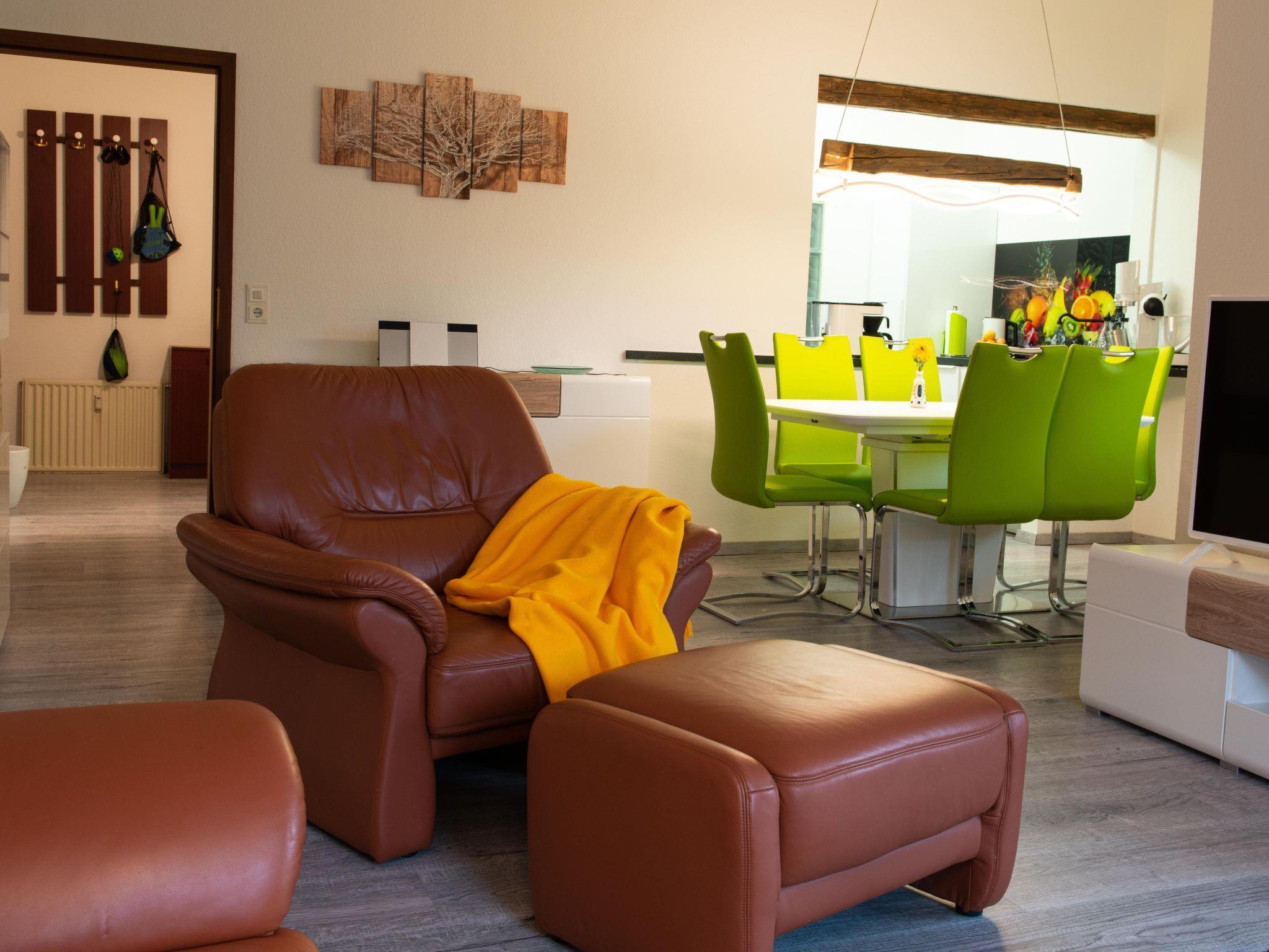The 95 m² modern flat, renovated in 2021, is located on the first floor of a restored half-timbered house. It offers a large living room with dining table, large satellite TV, CD and DVD player. The bedroom has a double bed (1.80 m x 2.00 m), the second bedroom and children's room has a high-quality sofa bed with topper (1.60 x 2.00 m) and a large bunk bed (each 0.90 m x 2.00 m). There are high-quality children's toys, a colouring board with chalk, children's books and board games. There is also a fully equipped kitchen with cooker, dishwasher, fridge with freezer compartment, various coffee machines, blender, toaster, Sodamax and kettle. The large terrace with a view of the mountains is fully furnished and has a charcoal barbecue at your disposal. The bathroom has a walk-in shower and a washbasin with mirror cabinet. Bed linen is provided. Internet (WLAN) is also available free of charge.