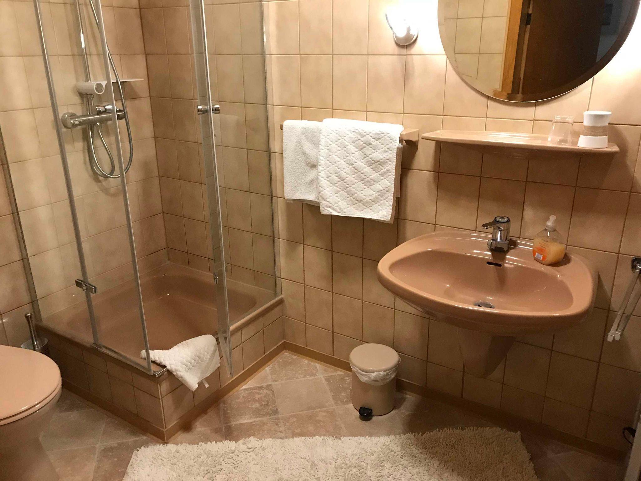 - 2 Bädern mit Dusche/WC bzw. Dusche/WC und Badewanne und Fön