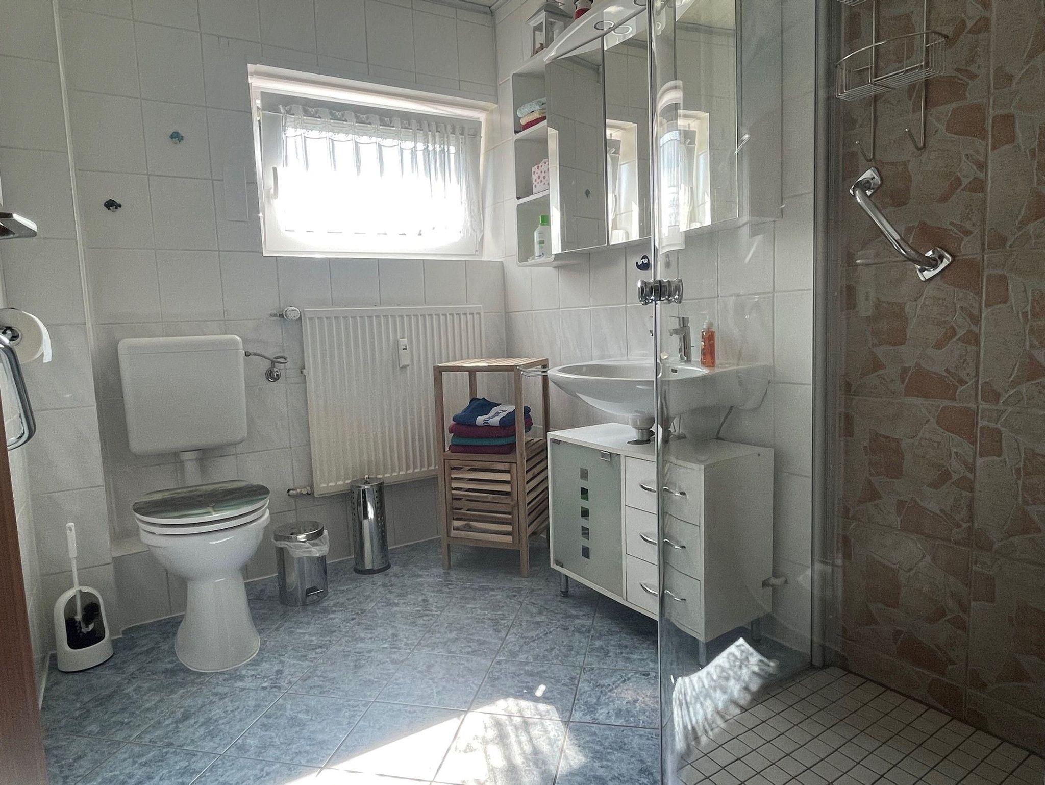 Das Badezimmer ist ausgestattet mit Dusche (flacher Einstieg), Waschbecken und Spiegelschrank.