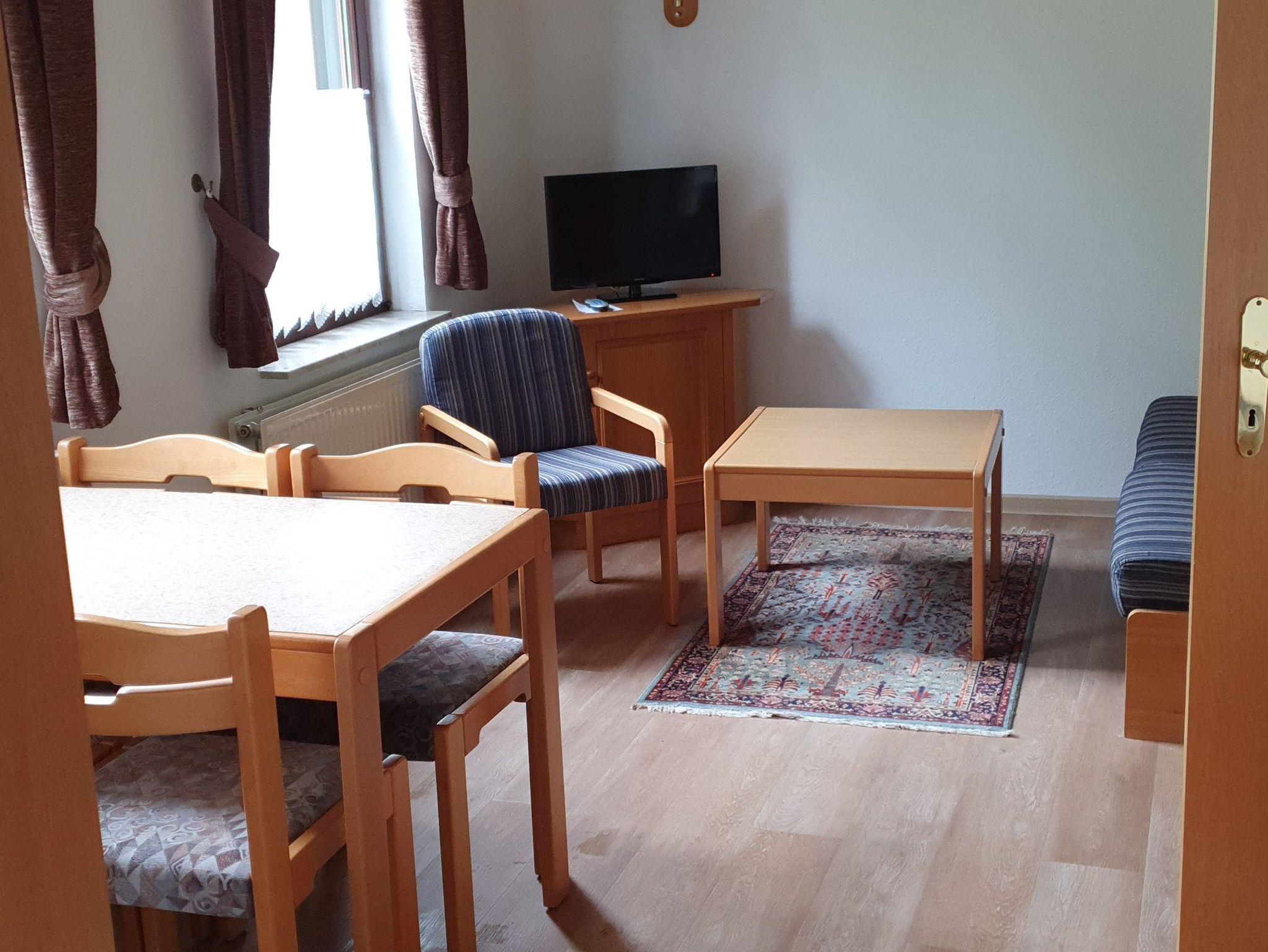 Die Wohnung hat 35 qm Wohnfläche mit Blick in den Vorgarten und zur Straße. Es gibt ein Schlafzimmer mit Doppelbett und eine Doppelschlafcouch im Wohnzimmer. Im Bad gibt es eine Dusche und in der kleinen Küche ist alles zum Kochen vorhanden.