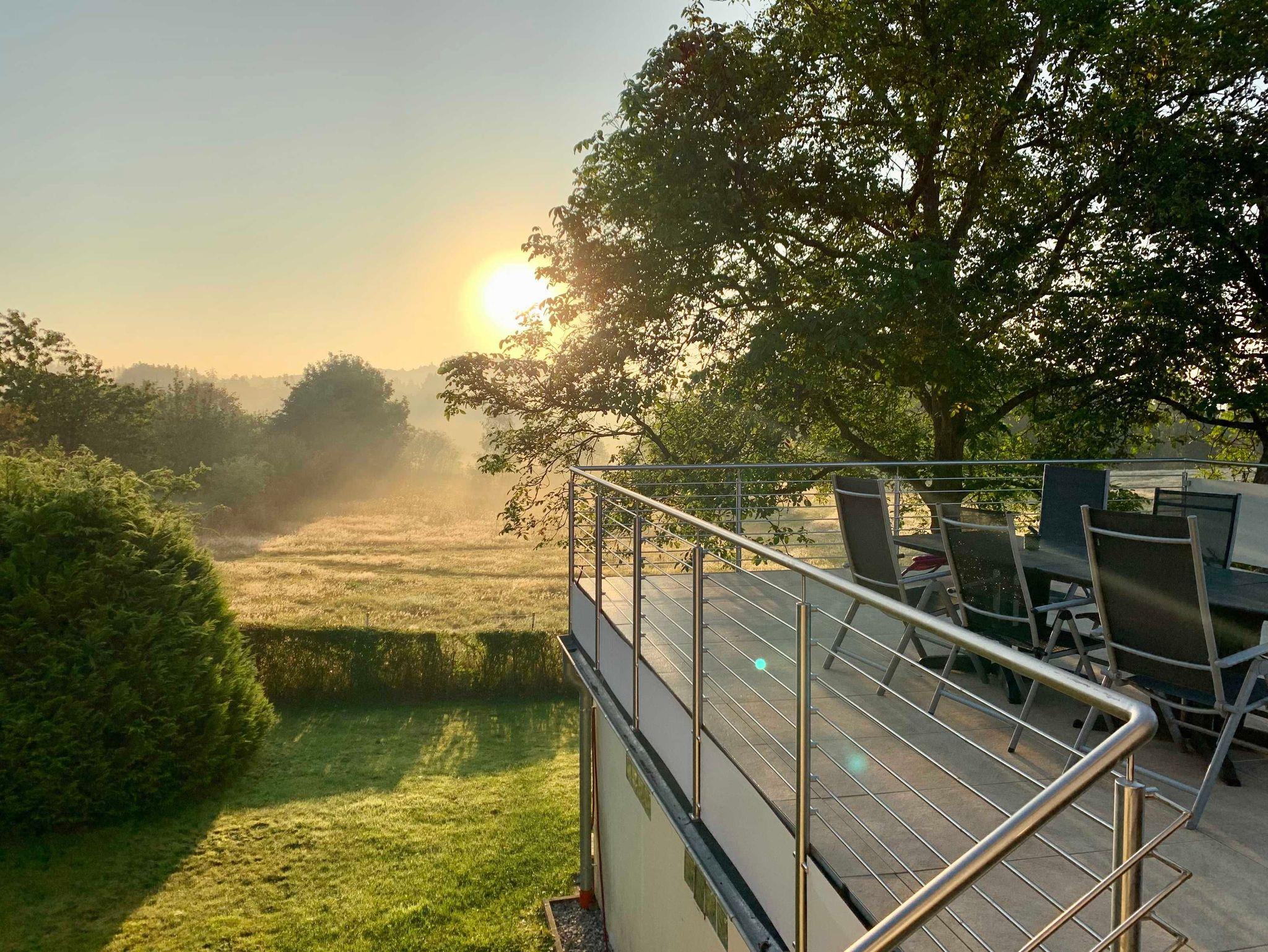 Der schöne großzügige Essbereich ist für 10 Personen eingerichtet und bietet zusätzlich zwei Kinderhochstühle. Vom Essbereich führt der Weg direkt auf den großen Balkon ( > 50 m²) und in den Garten.