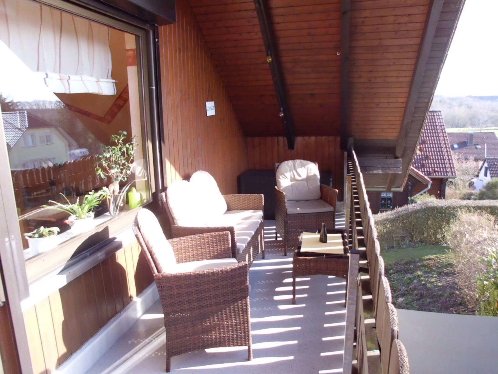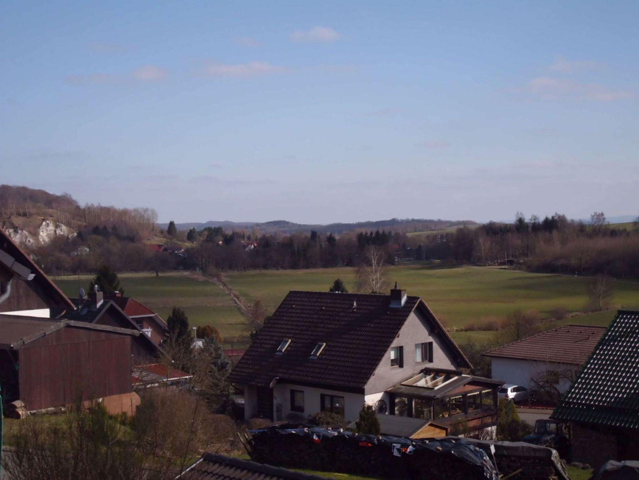 Unser Haus, in dem sich auch die Ferienwohnung Angela befindet, liegt auf einer sanften Anhöhe und hat einen freien Blick über den Ort und das Gips- und Karstgebiet Kranichstein.