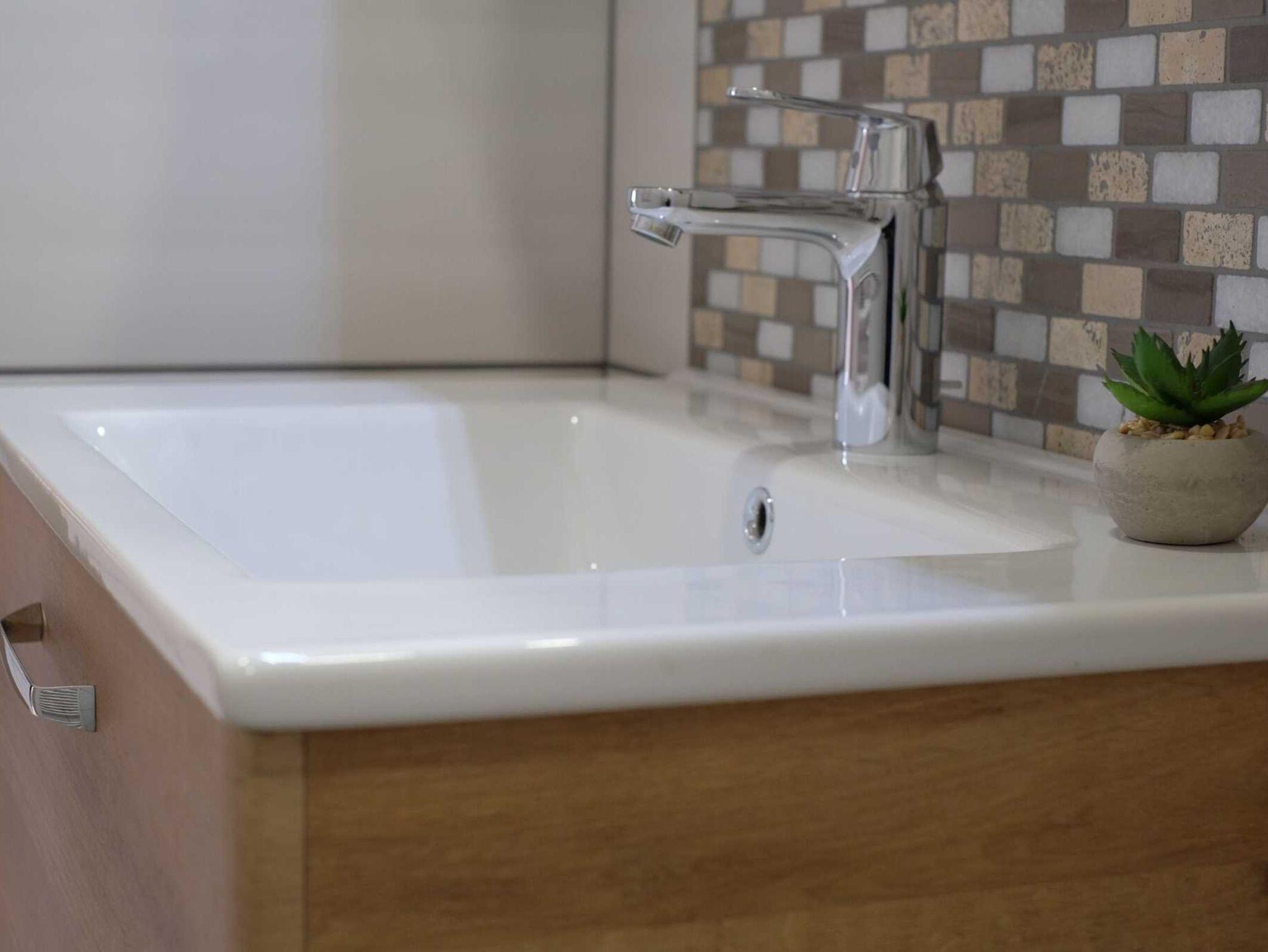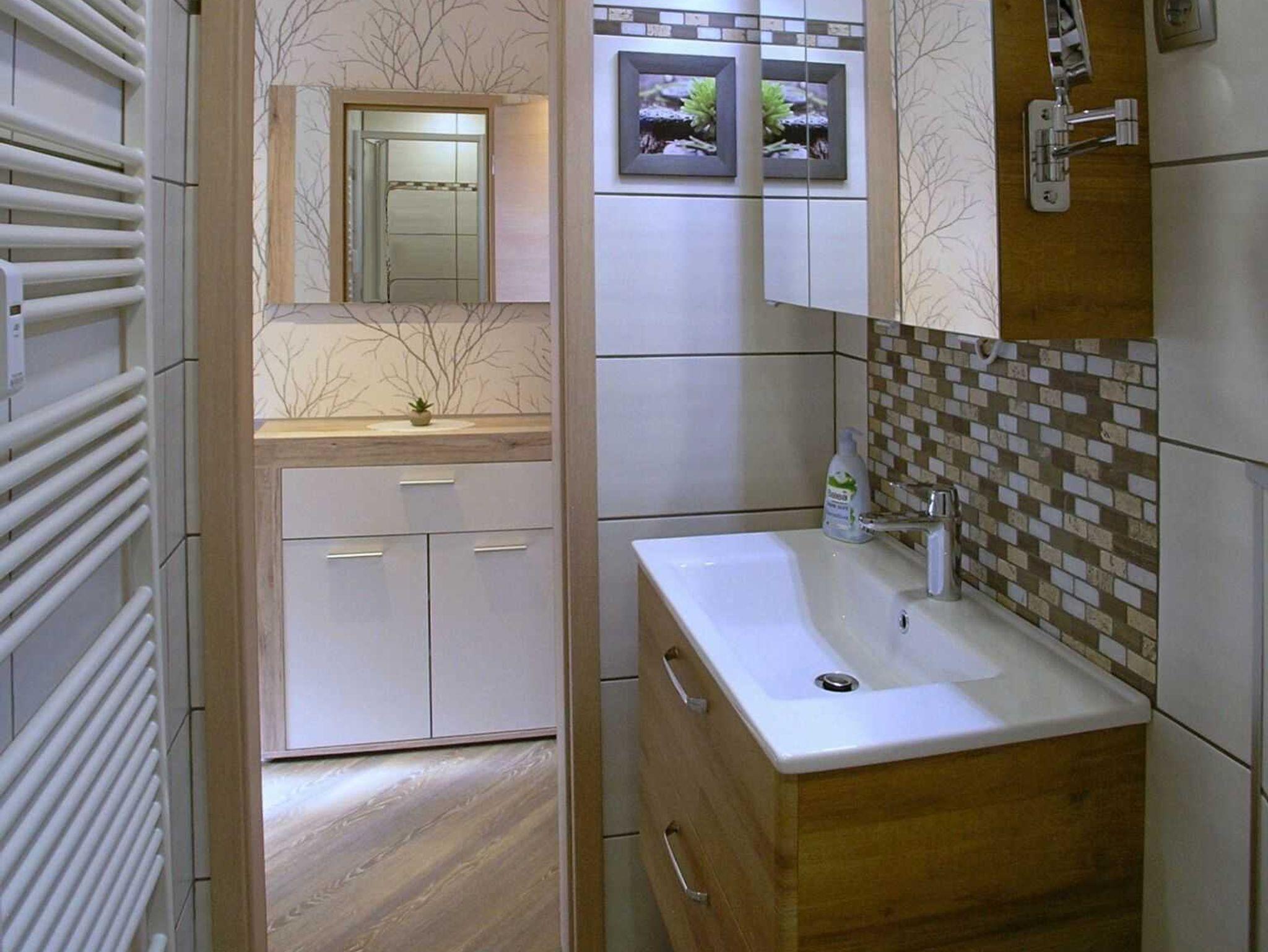 Das neue hochwertige Badezimmer hat eine niedrigschwellige Dusche, einen großzügigen Waschtisch und ein WC