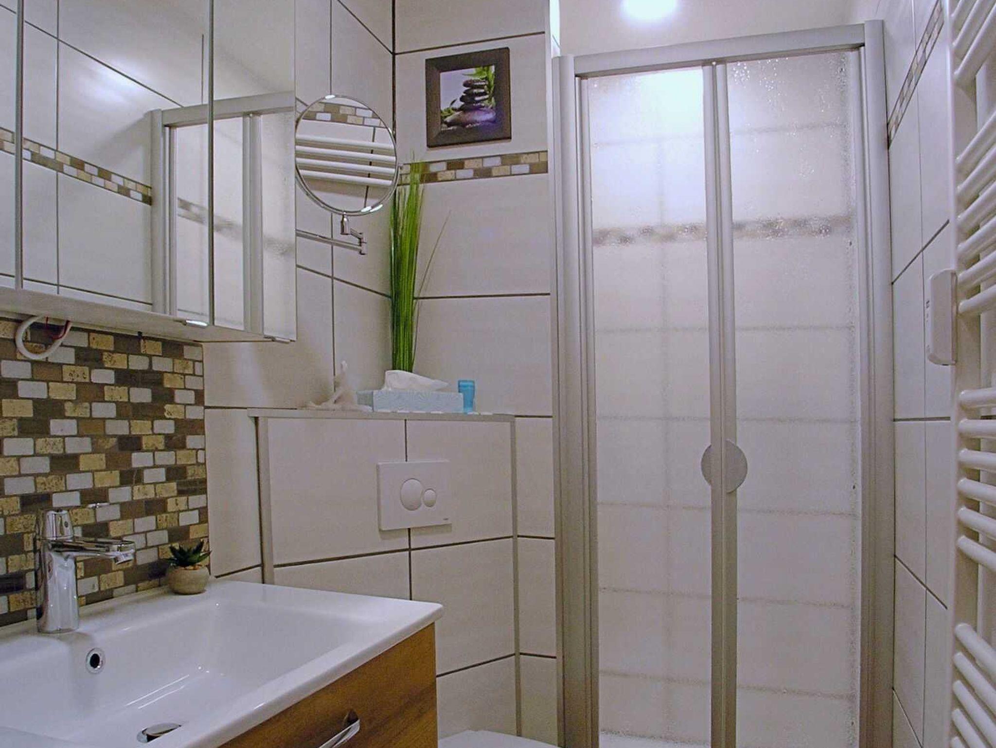 Das neue hochwertige Badezimmer ist eine kleine Wellnessoase. Hier findet man eine niedrigschwellige Dusche, einen großzügigen Waschtisch und ein WC. Bettwäsche und Handtücher sind im Mietpreis bereits enthalten.