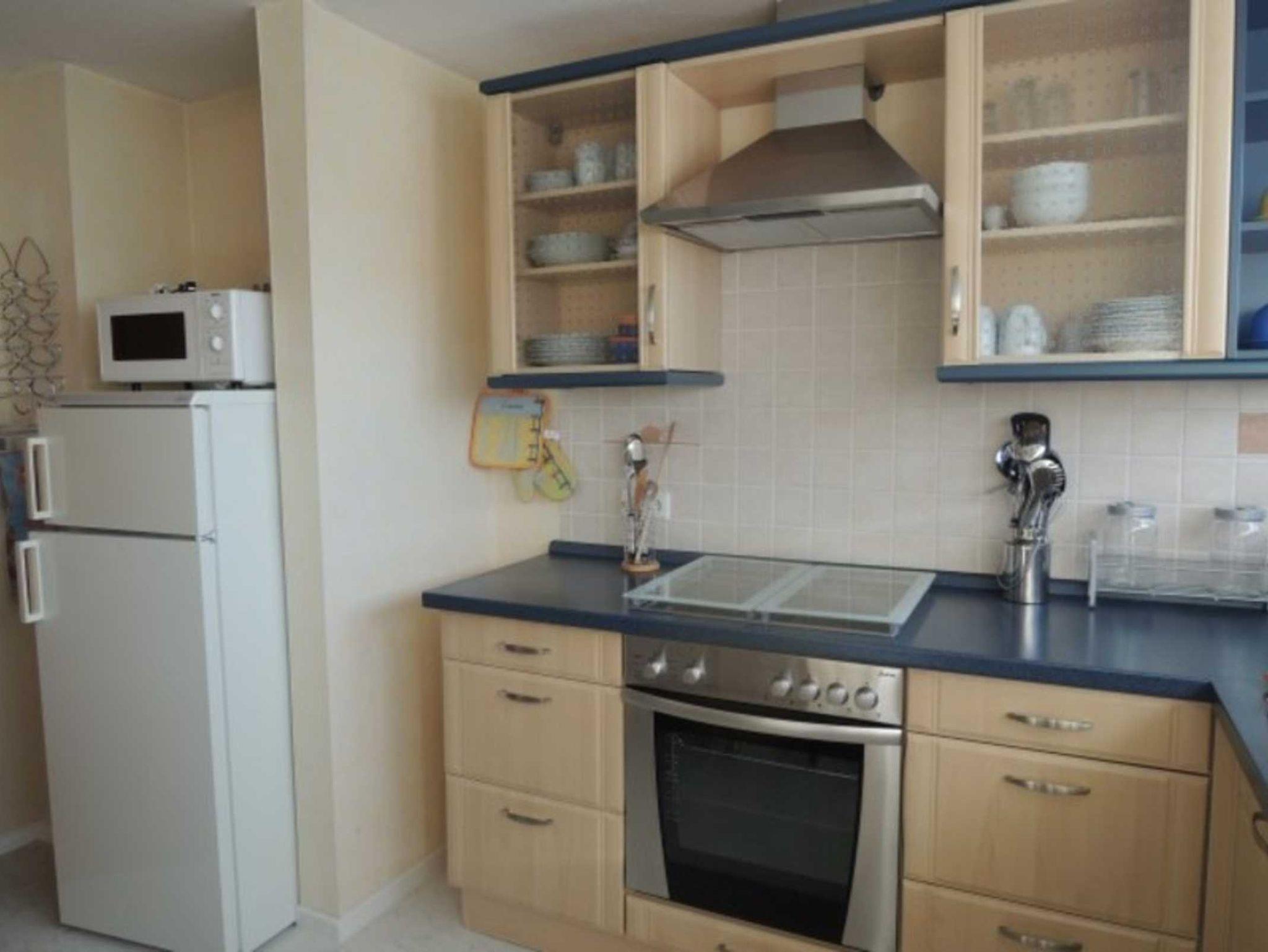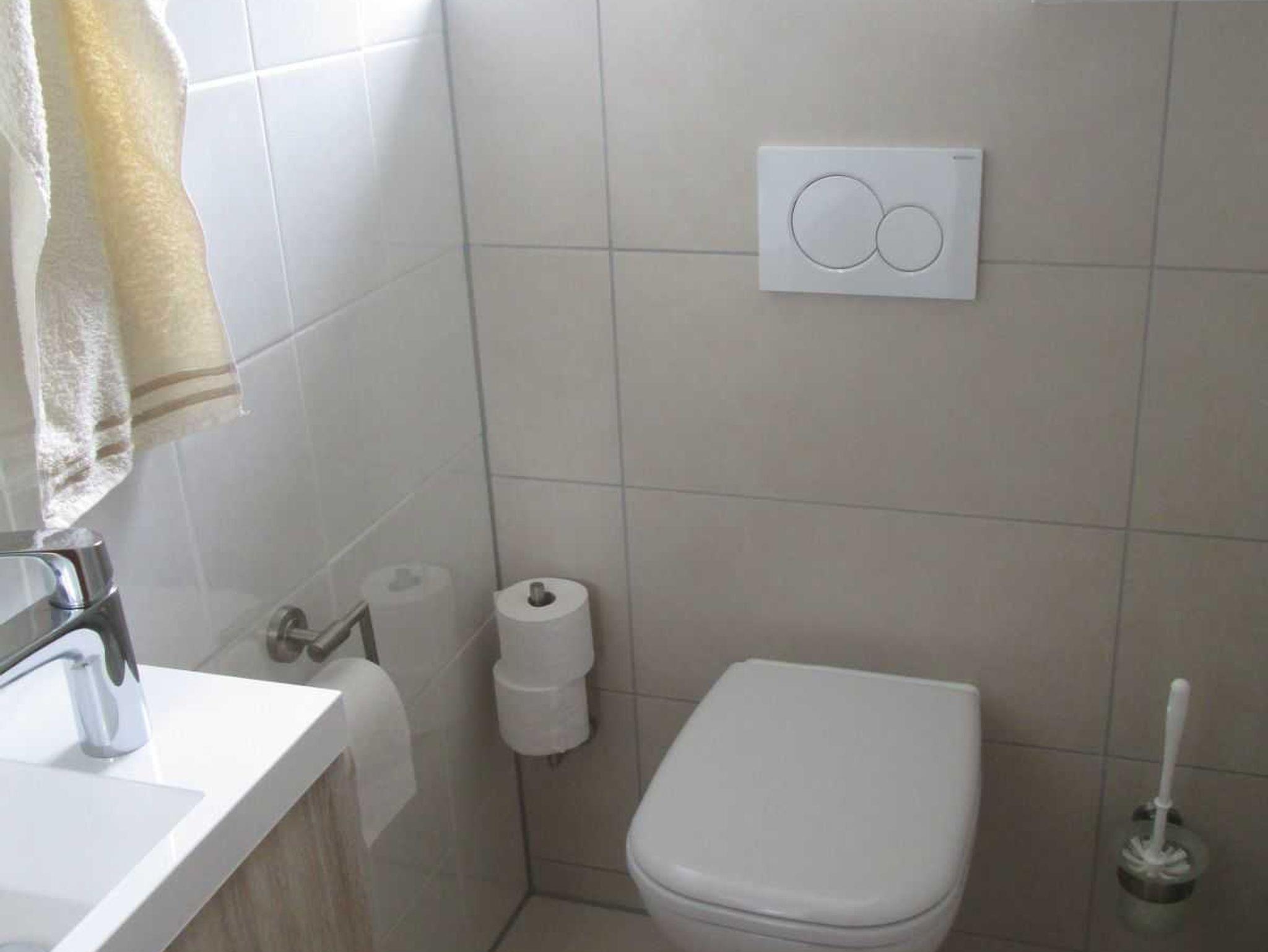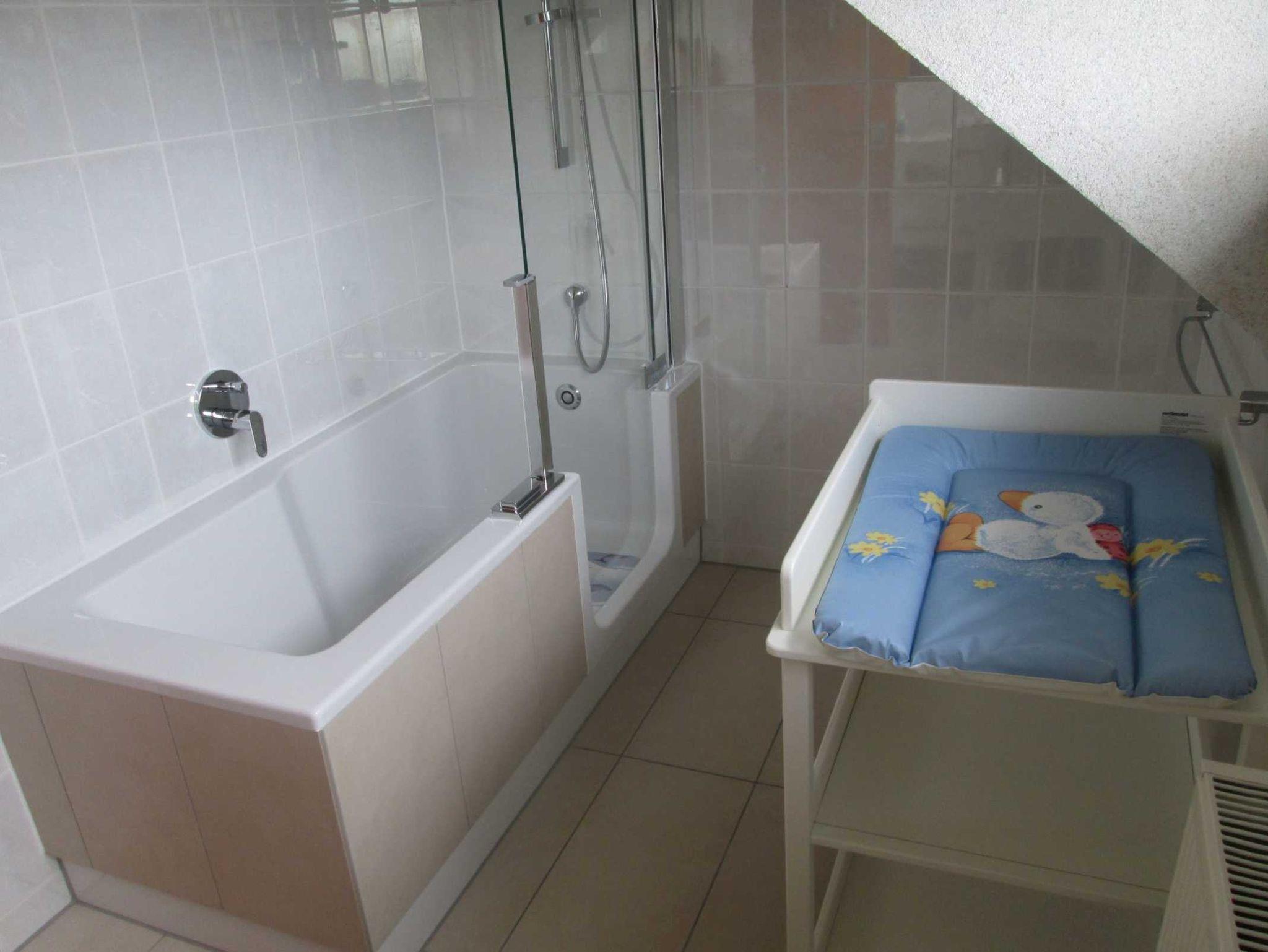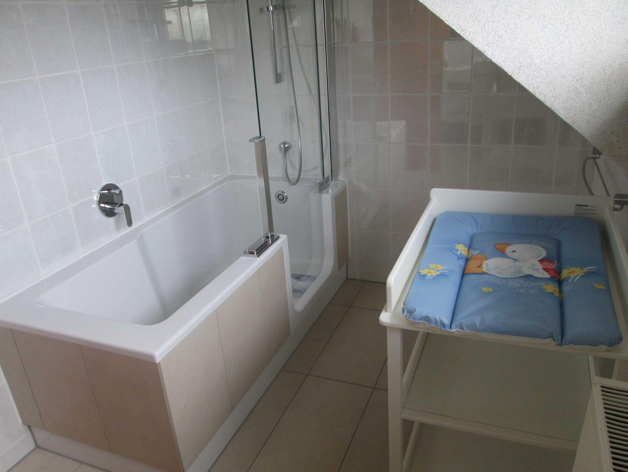 Die moderne Einbauküche ist komplett ausgestattet mit Backofen, Geschirrspüler, Gefriermöglichkeit, Kühlschrank und Mikrowelle. Weiterhin gibt es ein Badezimmer mit Doppelwaschbecken, Duschbadewanne mit Einstieg, Haartrockner sowie ein seperates WC. Waschmaschine ist auf Anfrage vor Ort nutzbar. Ein Hochstuhl für Kinder ist ebenso verfügbar. Bettwäsche und Handtücher werden den Gästen kostenfrei zur Verfügung gestellt.