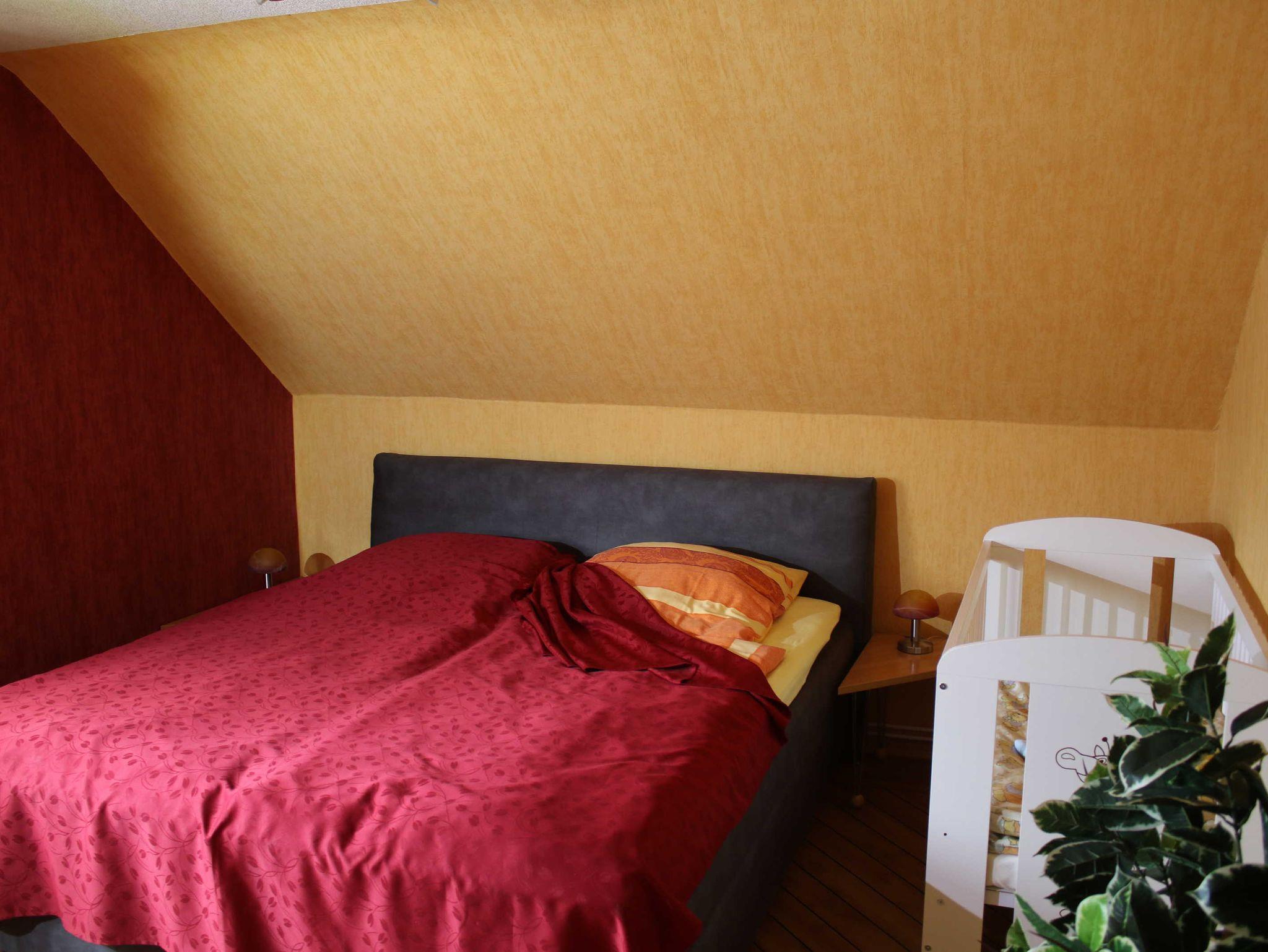 In der Ferienwohnung Meinig gibt es zwei Schlafzimmer, davon ist eines mit einem 1,80 m Boxspringbett und das andere mit einem 1,60 m Doppelbett ausgestattet. Im Wohnzimmer der Ferienwohnung gibt es ein gemütliches Sofa sowie einen Fernseher und eine Stereo-Anlage. Die moderne Einbauküche ist komplett ausgestattet mit Backofen, Gefriermöglichkeit, Kühlschrank und Mikrowelle. Weiterhin gibt es ein Badezimmer mit Duschbadewanne mit Einstieg, sowie ein seperates WC. Waschmaschine steht, auf Anfrage vor Ort zur Verfügung. Ein Kinderbett, Wickeltisch, Kindergeschirr und ein Hochstuhl stehen bereit. Kostenloses W-LAN ist vorhanden.