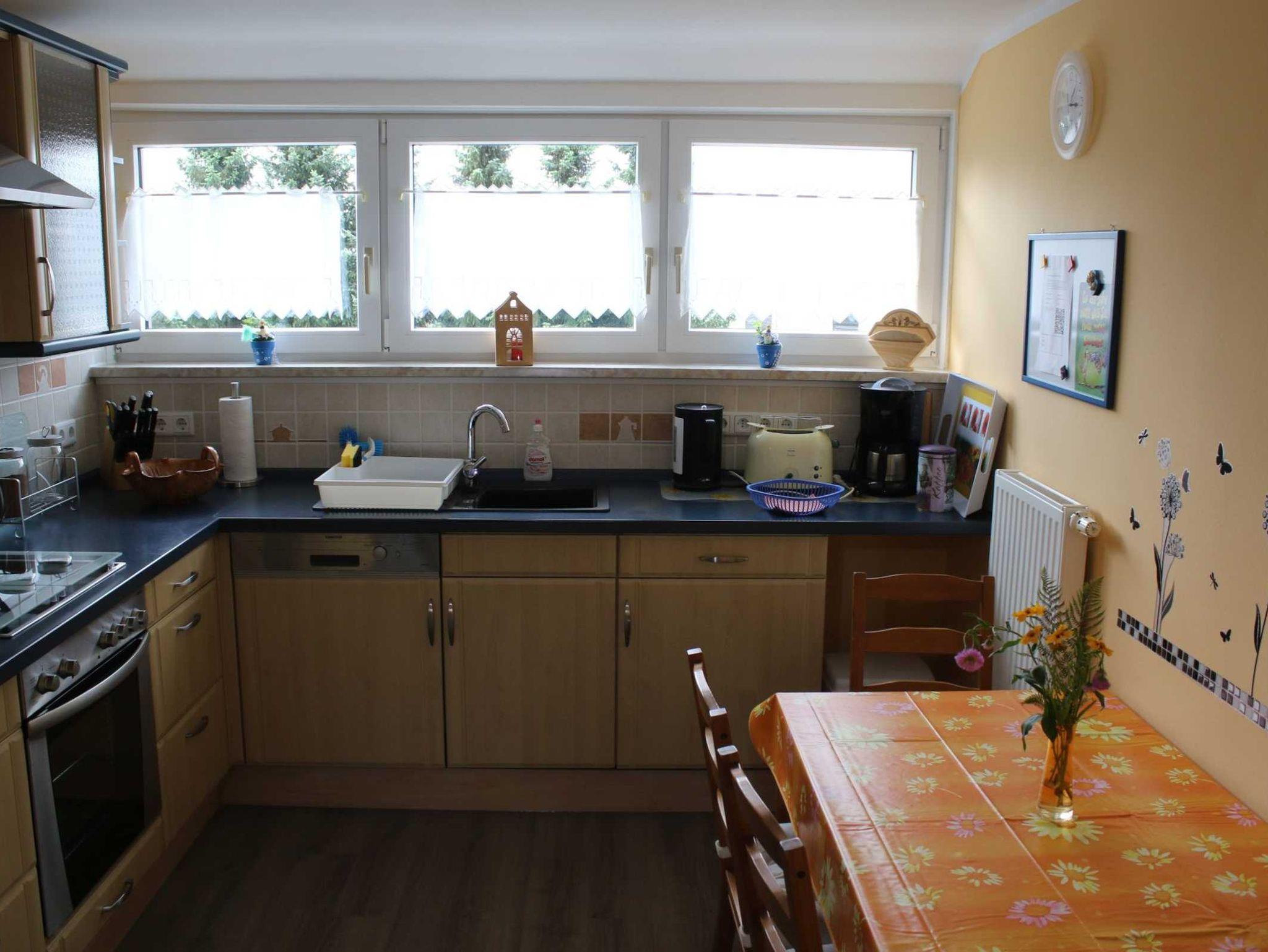 Die moderne Einbauküche ist komplett ausgestattet mit Backofen, Geschirrspüler, Gefriermöglichkeit, Kühlschrank und Mikrowelle. Weiterhin gibt es ein Badezimmer mit Doppelwaschbecken, Badewanne mit Einstieg, Haartrockner und einer Waschmaschine sowie ein seperates WC. Zusätzlich steht den Gästen kostenfreies W-LAN zur Verfügung. Bettwäsche und Handtücher werden den Gästen auch kostenfrei zur Verfügung gestellt. Ein Hochstuhl für Kinder ist verfügbar. Die Ferienwohnung Meinig ist eine Nichtraucher-Wohnung.