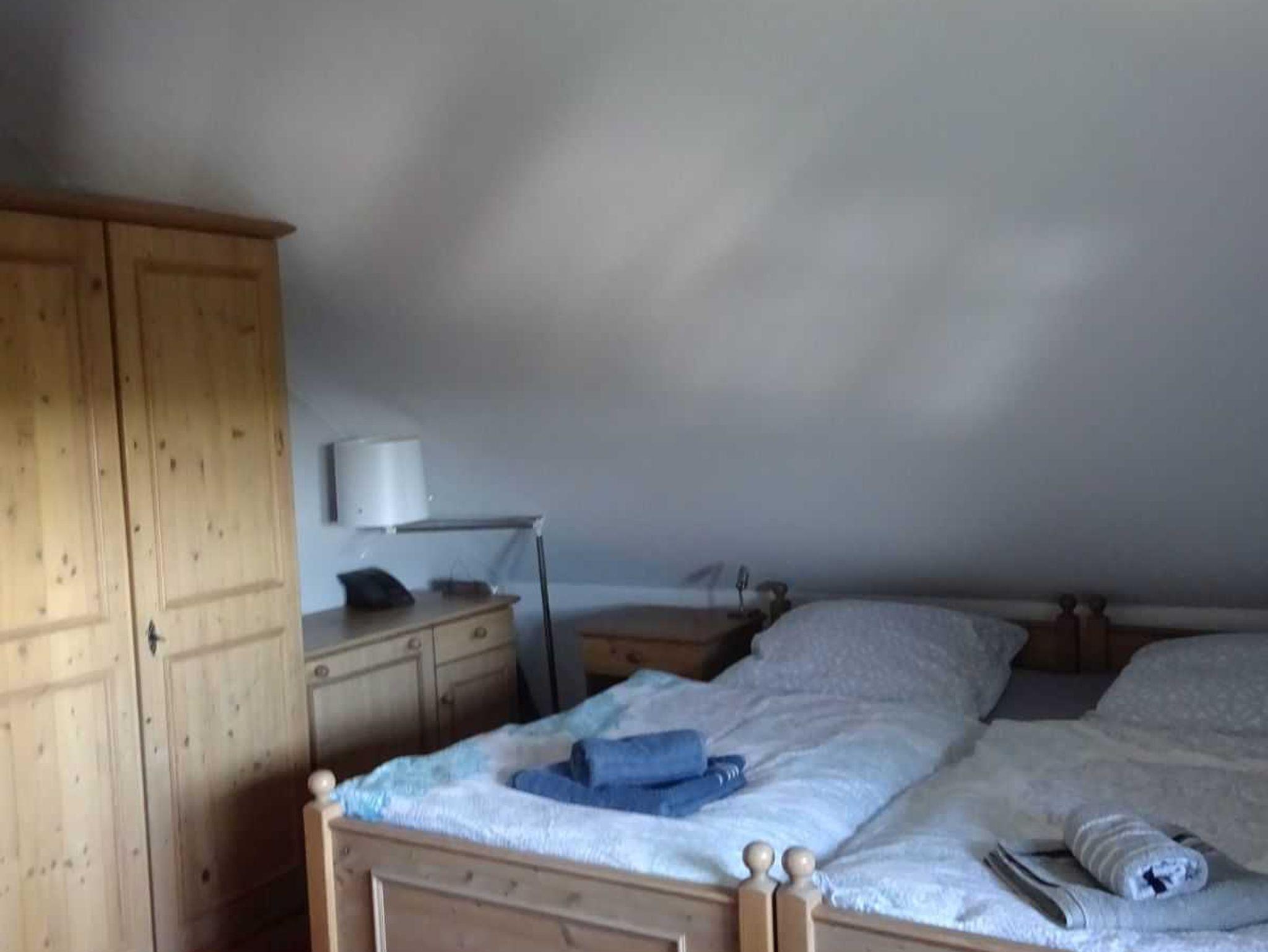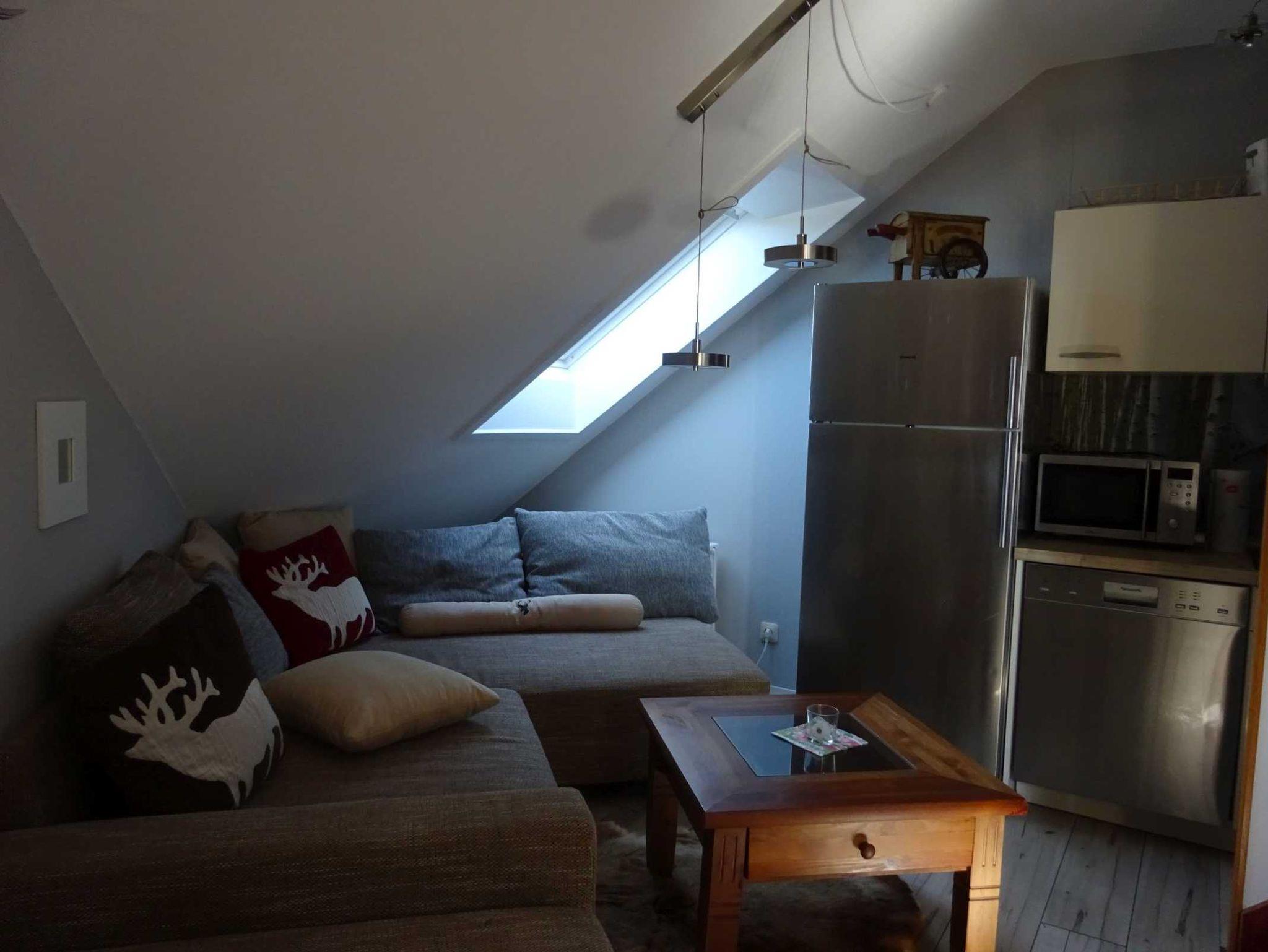 Sie betreten die Wohnung Jagdschlösschen Harz im unteren Wohnbereich und stehen direkt in einem kleinen Flur. Hier befindet sich auch ein großer Schrank. Im unteren Wohnbereicch befindet sich das Wohnzimmer mit Ausziehcouch für 2 Personen, ein LED-TV mit Netflix, ein Radio, die komplett ausgestattete Küchenzeile, ein Esstisch, der Südbalkon sowie das Badezimmer mit Dusche. Im oberen Wohnbereich, den Sie über die Treppe neben der Küchenzeile erreichen, liegt das Schlafzimmer mit einem gemütlichen Doppelbett sowie einer weiteren Schlafmöglichkeit für ein Kind. Des Weiteren befindet sich in diesem Zimmer auch ein Schreibtisch sowie ein zweiter Fernseher und ein weiteres Radio.