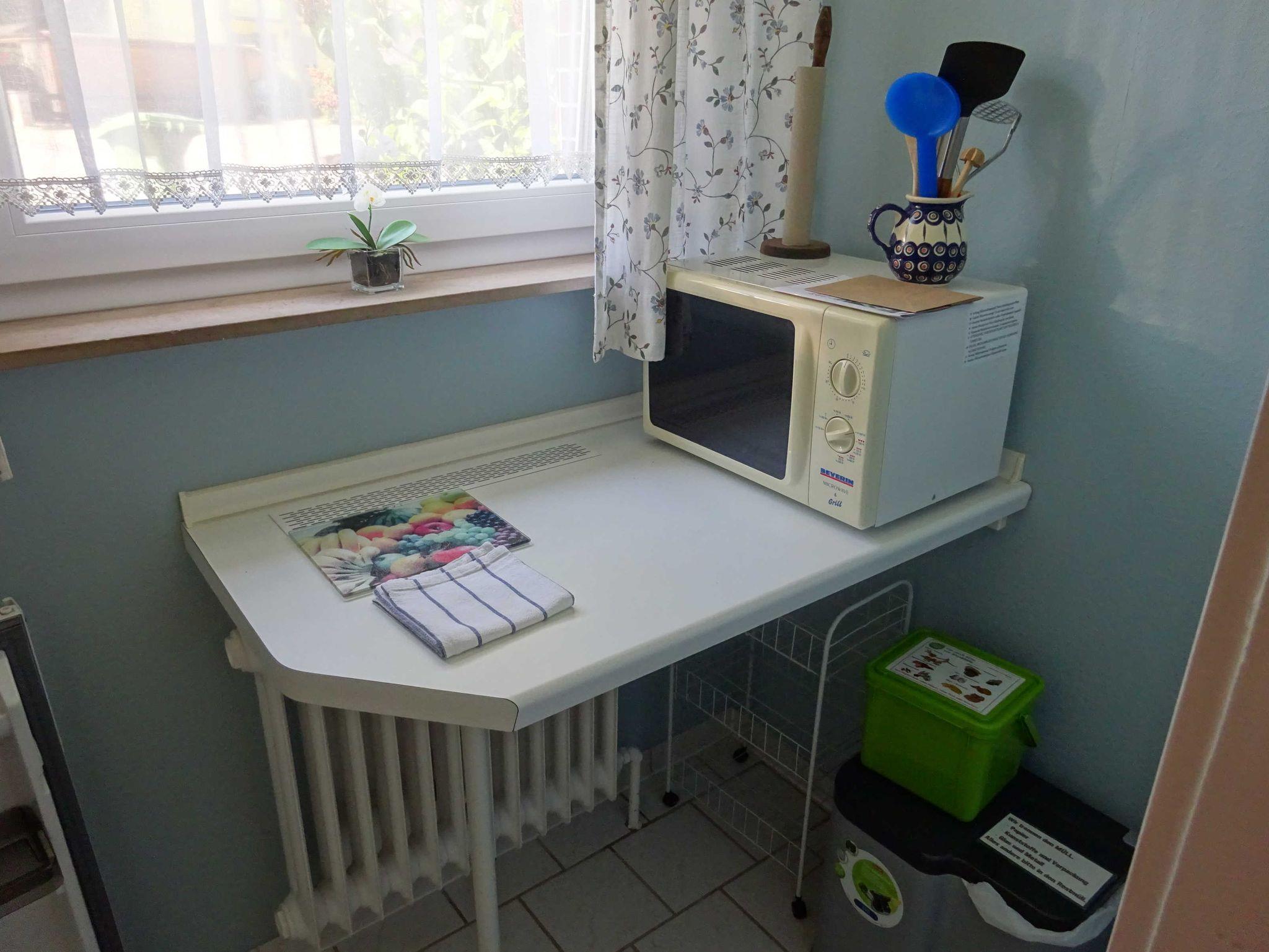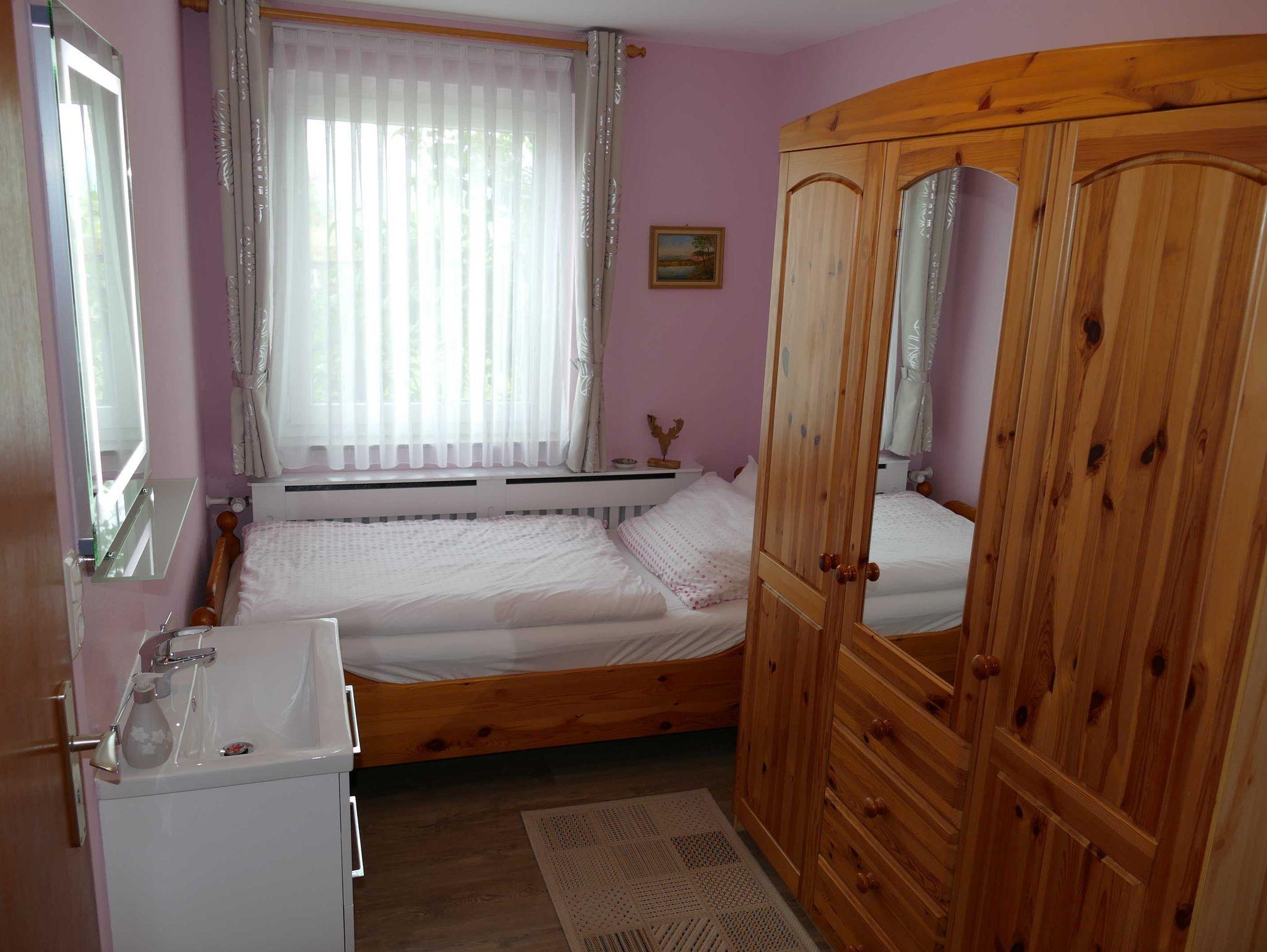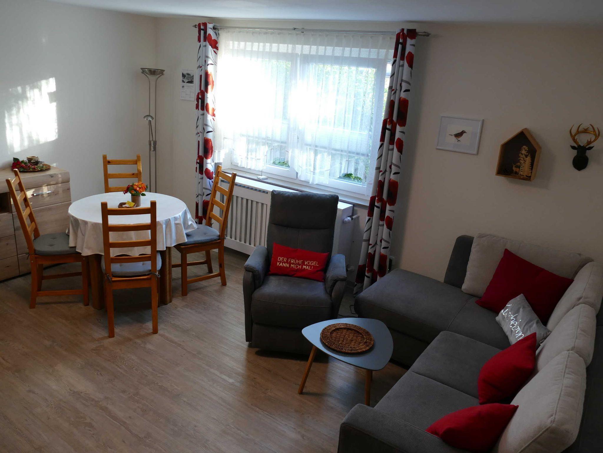 Nichtraucher-Ferienwohnung, ca. 43 m², parterre, Schlafzimmer mit 2 Einzelbetten, Wohnzimmer mit Schlafcouch und Essecke, Sat-TV, Pantry-Küche, kleines Badezimmer mit Dusche/WC (Haarföhn sowie 2 Bademäntel vorhanden). Die Küche wurde im Frühjahr 2024 renoviert.