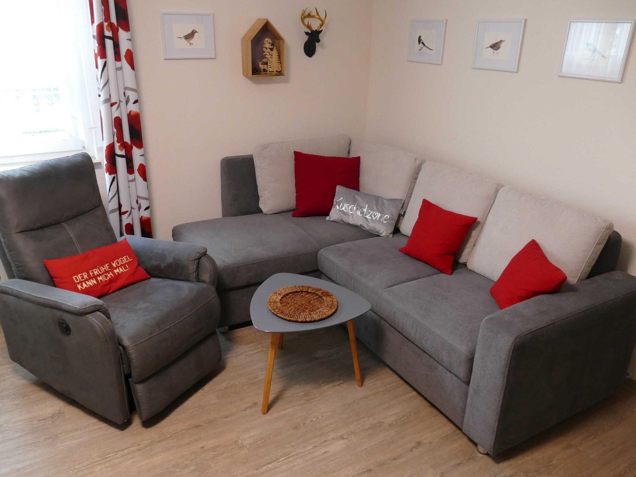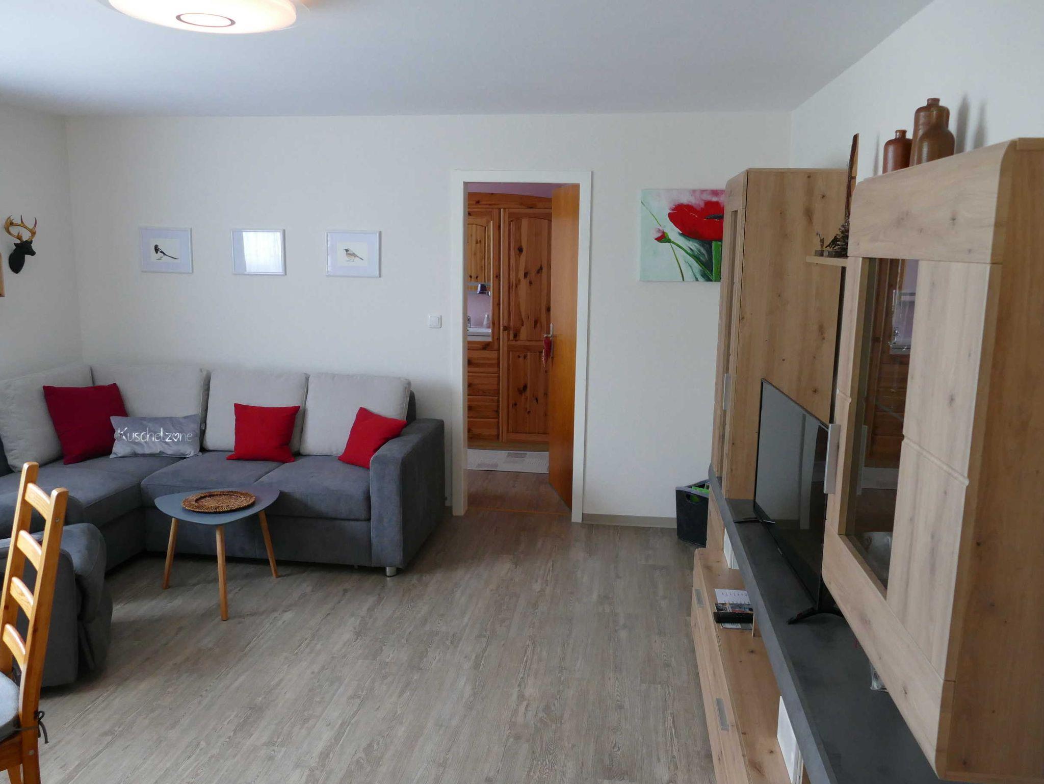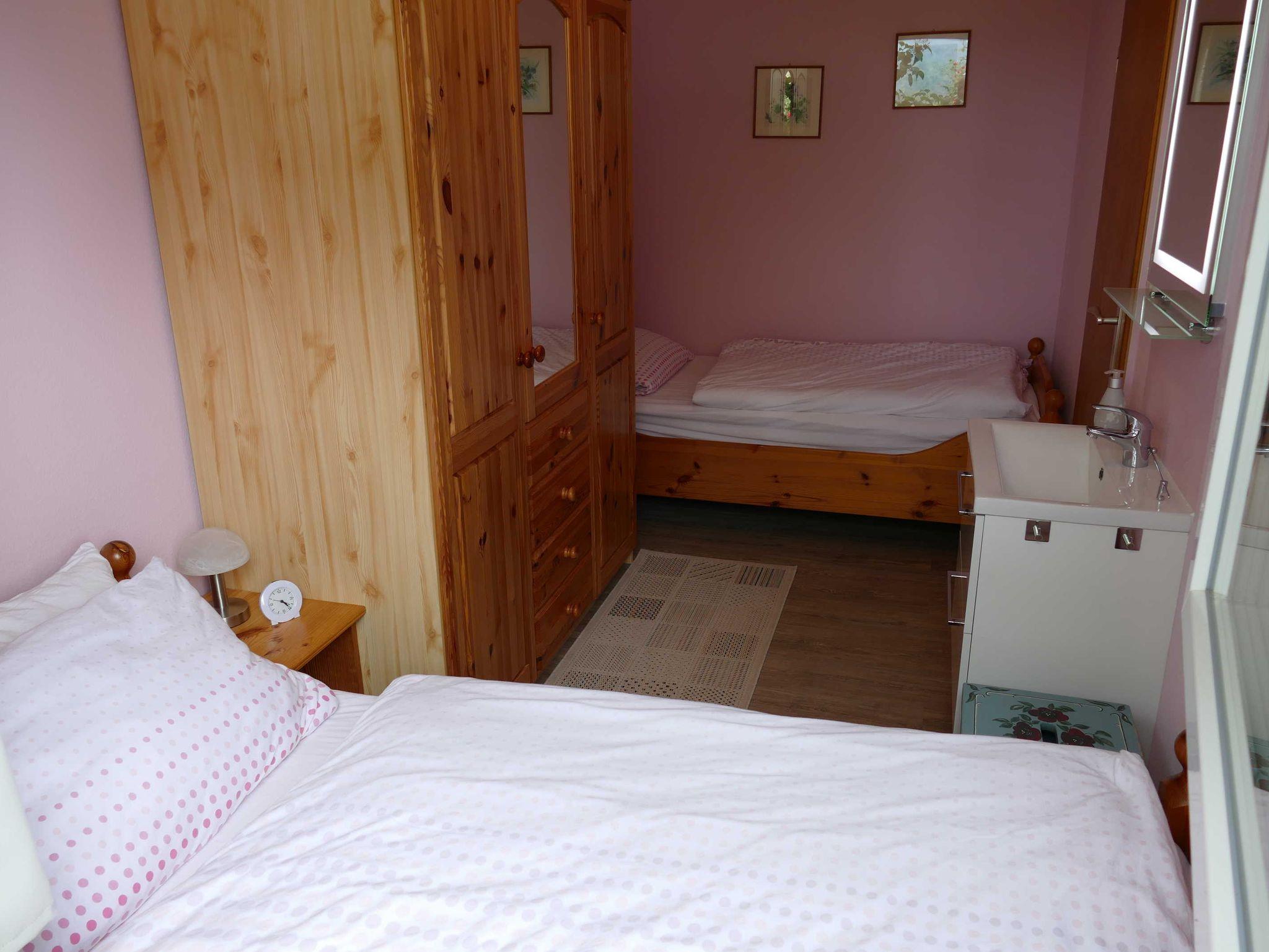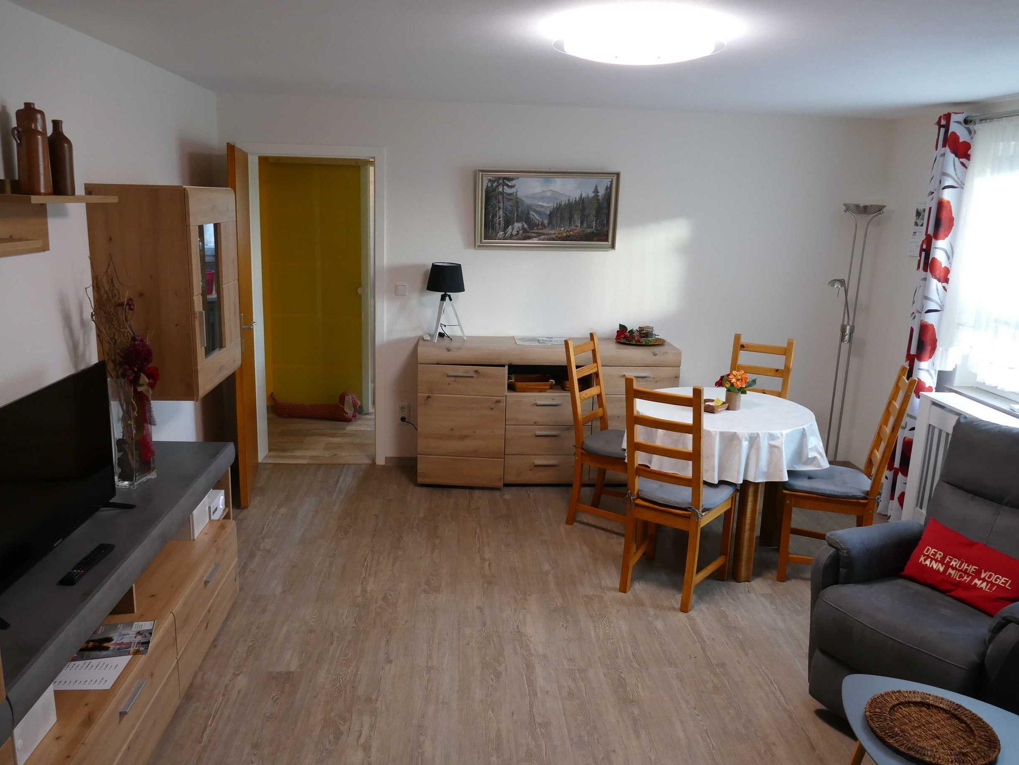 Nichtraucher-Ferienwohnung, ca. 43 m², parterre, Schlafzimmer mit 2 Einzelbetten, Wohnzimmer mit Schlafcouch und Essecke, Sat-TV, Pantry-Küche, kleines Badezimmer mit Dusche/WC (Haarföhn sowie 2 Bademäntel vorhanden). Die Küche wurde im Frühjahr 2024 renoviert.