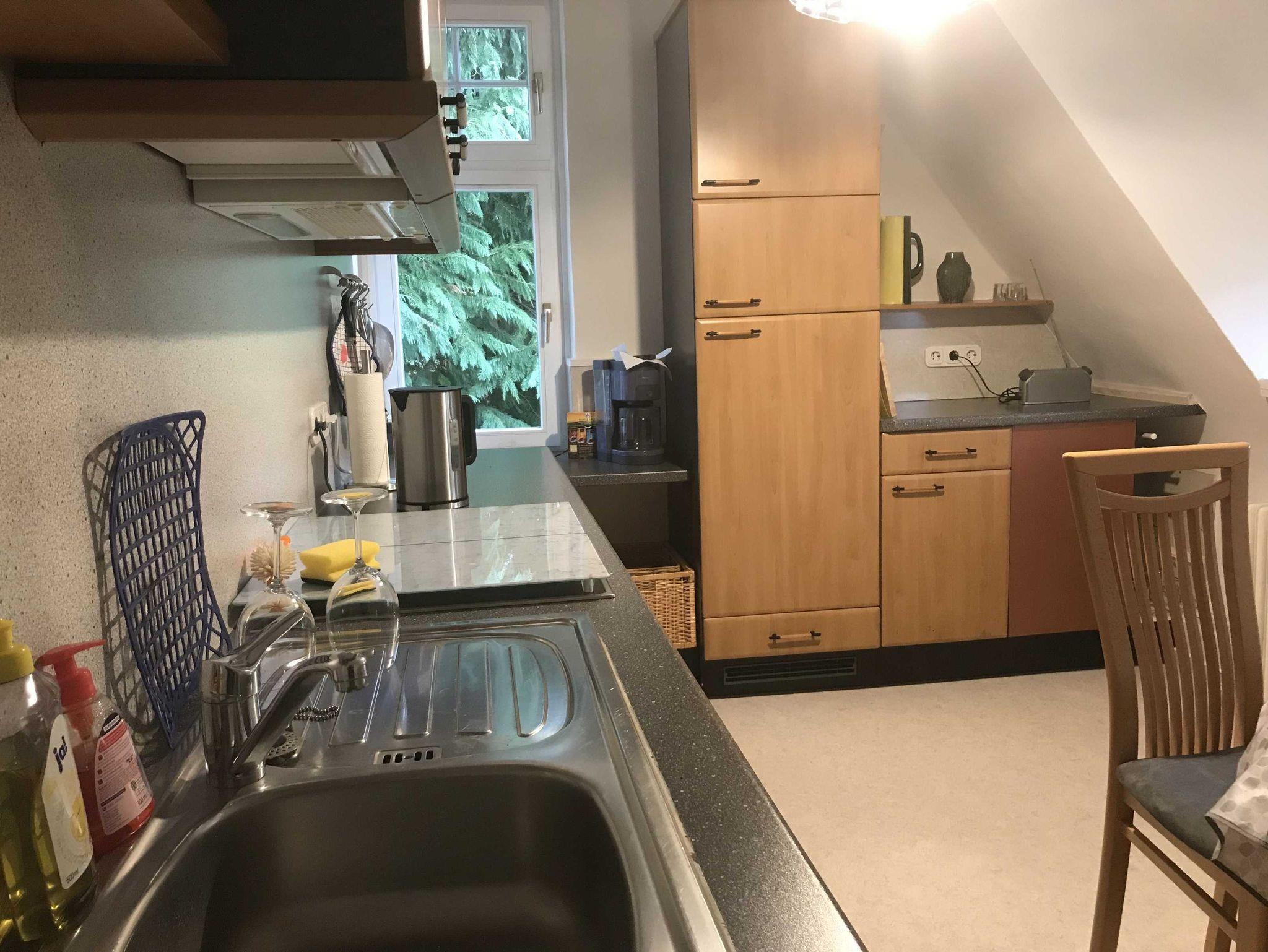 In der großen Wohnküche finden 6 Personen am großzügigen Esstisch Platz. Spülmaschine, Herd mit Ceranfeld, Dunstabzugshaube, Kühlschrank mit Tiefkühlfach, Mikrowelle, Kaffeemaschine, Wasserkocher und Toaster sind vorhanden.