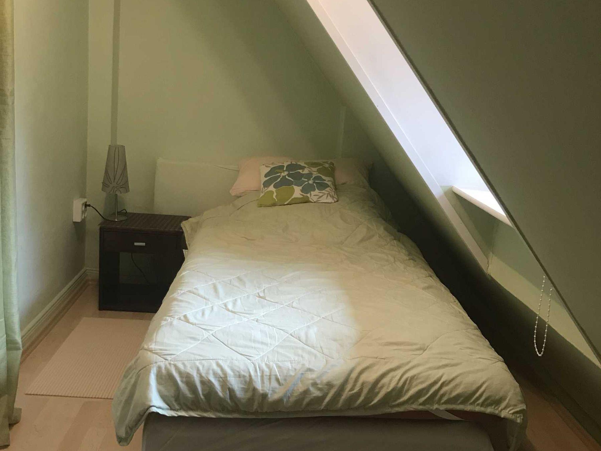 An das Schlafzimmer mit Doppelbett grenzt ein mittels Vorhang abgetrenntes Einzelzimmer mit TV. Das zweite Schlafzimmer mit Einzelbett hat ein angrenzendes Badezimmer mit Badewanne und WC.