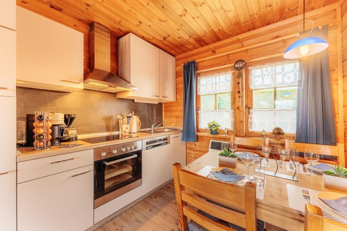 Die offene an den Wohnbereich angrenzende Küche mit dem Essplatz ist mit