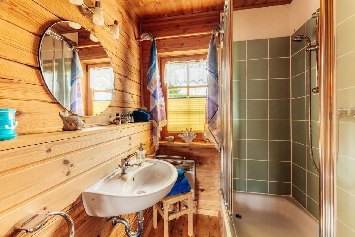 Das Badezimmer verfügt über eine Dusche.