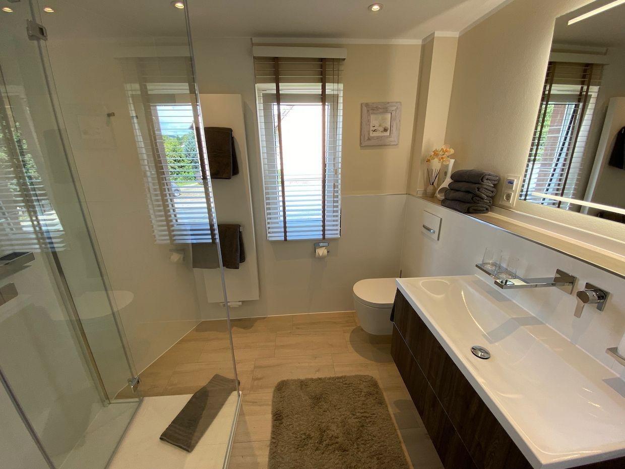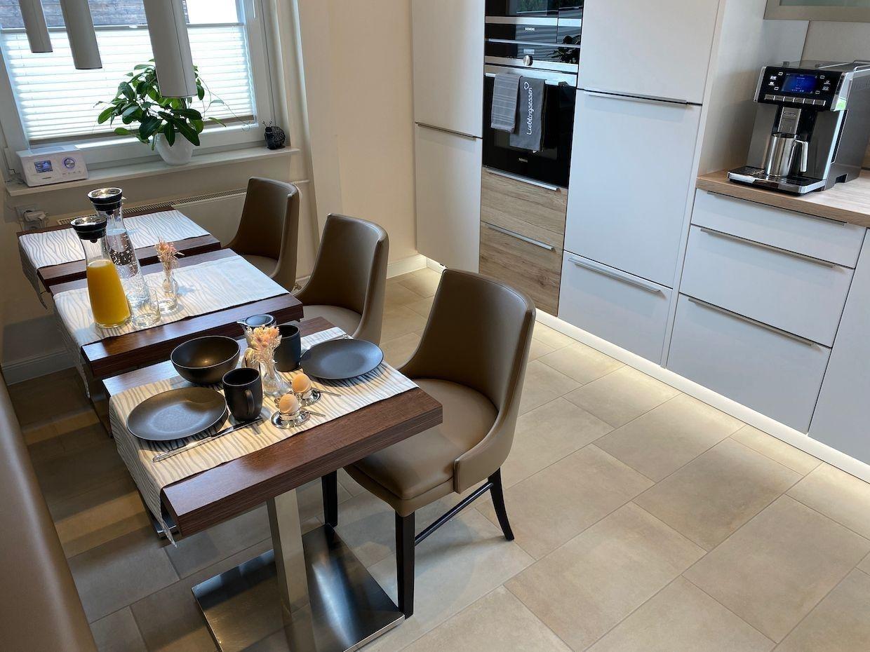 Den Feriengästen steht sowohl eine Garage mit automatischem Sektionaltor, ein Carport als auch ein eigener Parkplatz direkt vor dem Haus zur Verfügung. Beim Eintreten in das neue Feriendomizil führt der Weg durch einen Flur direkt in die luxuriöse und moderne Küche, wo Sie bei einem Glas Sekt oder Tässchen Kaffee zunächst einmal ankommen können.