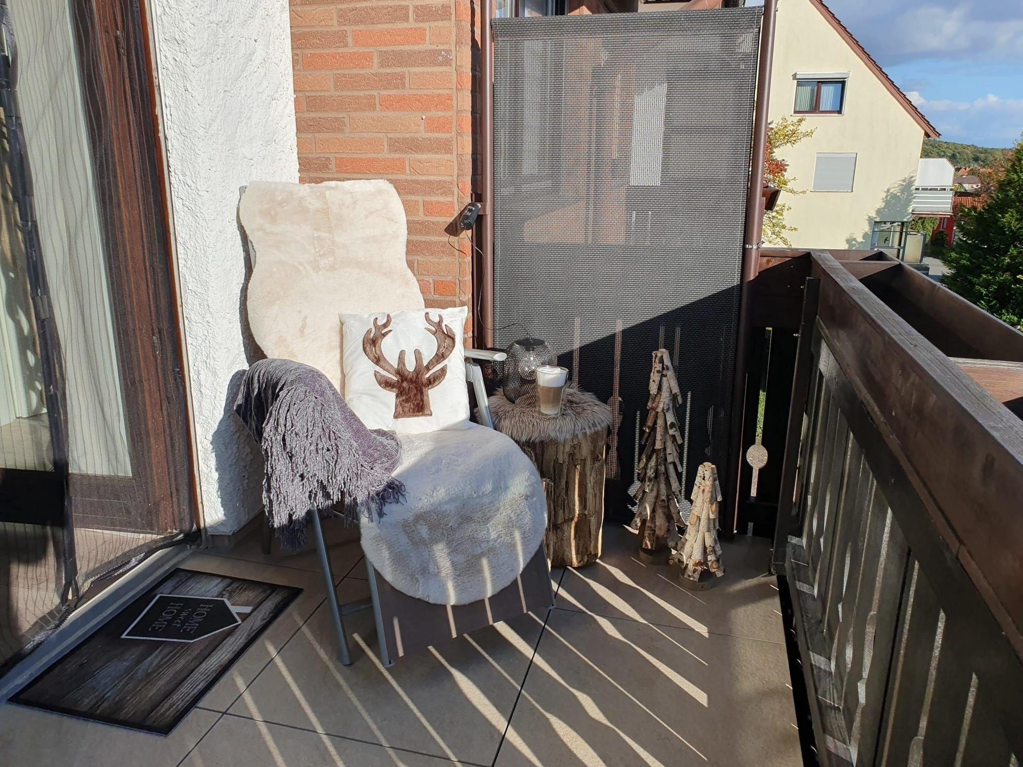 Genieße den sonnigen Südbalkon mit gemütlichen Balkonmöbeln – ideal zum Entspannen und Sonnen. Eine elektrische Markise sorgt bei Bedarf für angenehmen Schatten.
