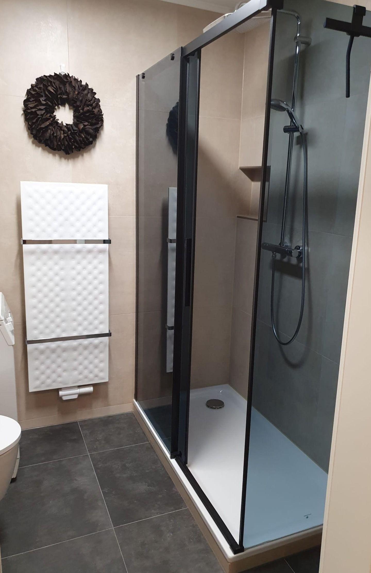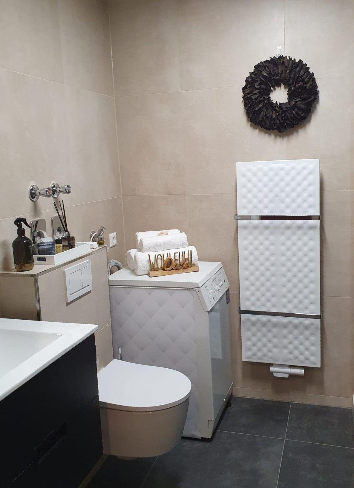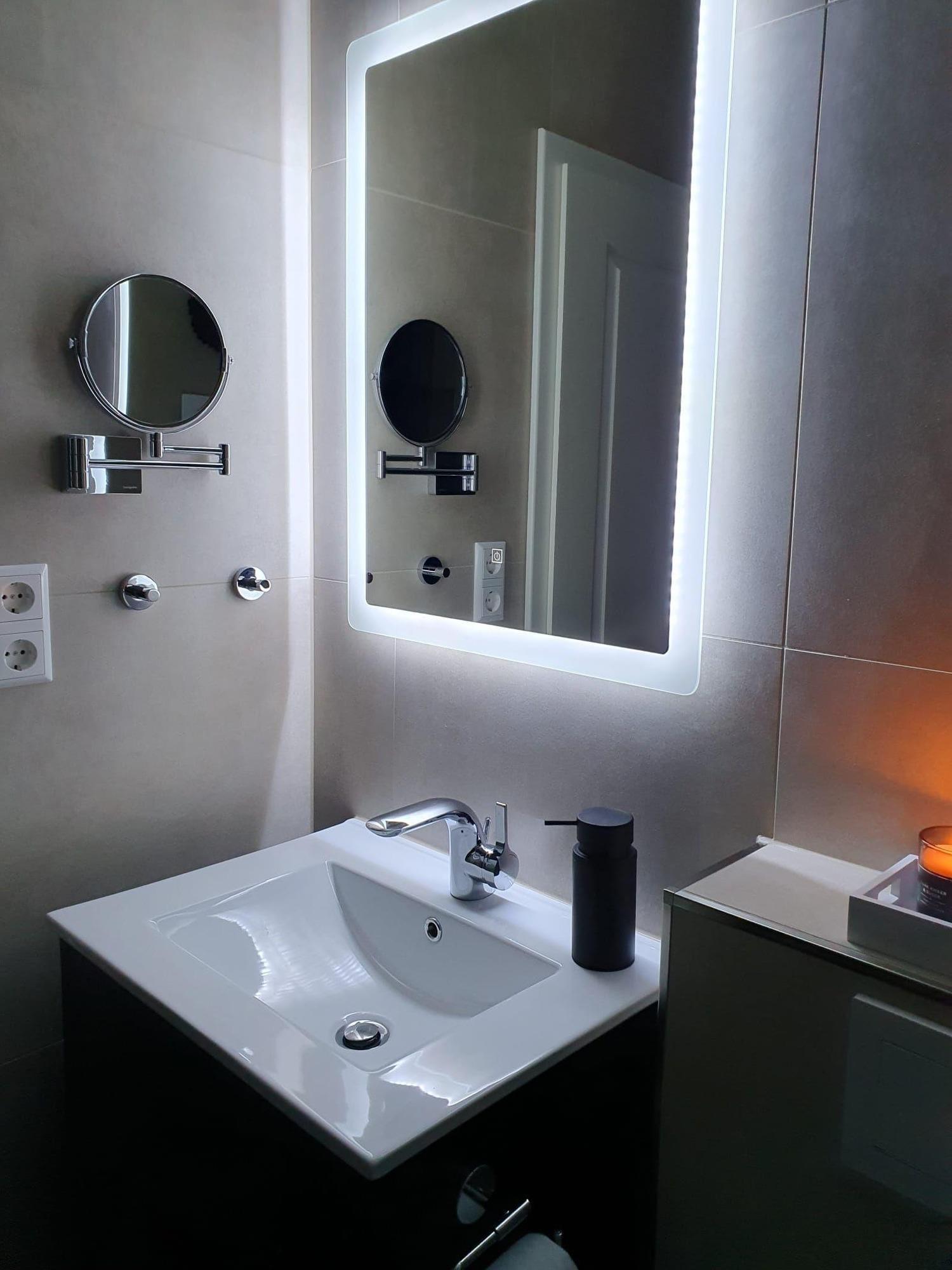 Modernes Bad mit bodennaher Regendusche, WC mit Spartaste, beleuchtetem Spiegel, Kosmetikspiegel, Haartrockner, Hotel-Duschgel & -Seife, Kosmetikeimer, Hand- & Duschtücher, Zahnputzbecher, Toilettenpapier und Badvorleger.