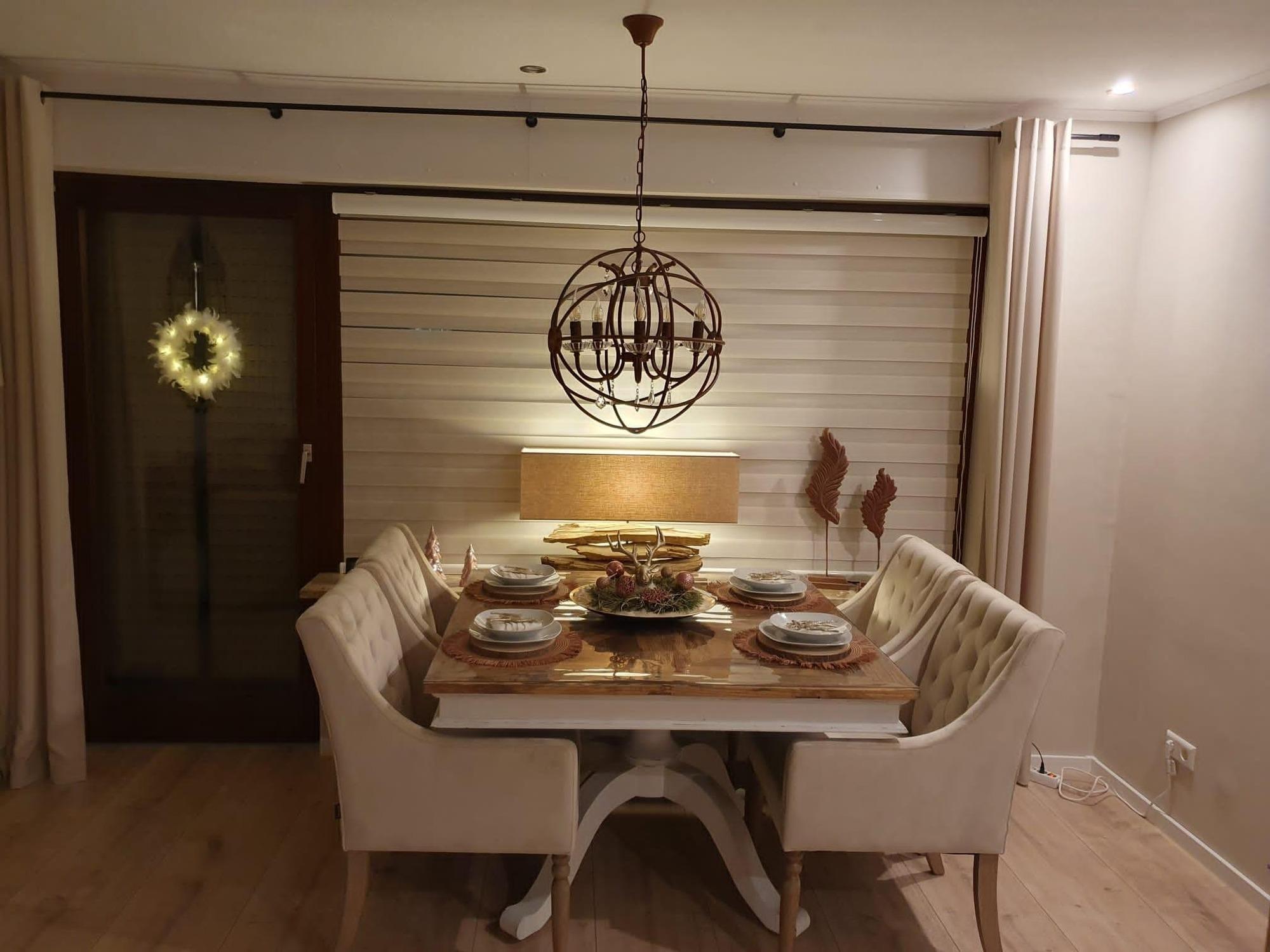 Gemütlich eingerichtet mit King-Size-Bett (1,80 m × 2,00 m, offenes Fußende), Sofa mit Couchtisch, Essbereich mit Tisch und Stühlen, 55-Zoll-Smart-TV (Netflix), Highboard und Kleiderschrank. Elektrische Außenrollläden und eine Balkontür mit Fliegengitter sorgen für zusätzlichen Komfort.