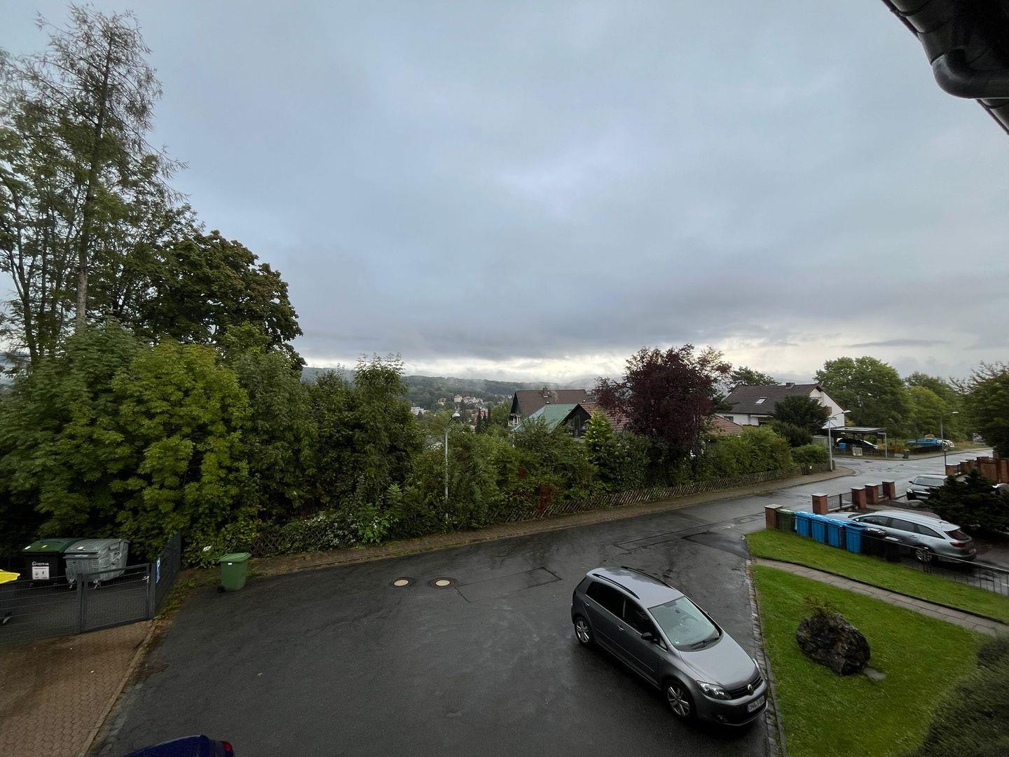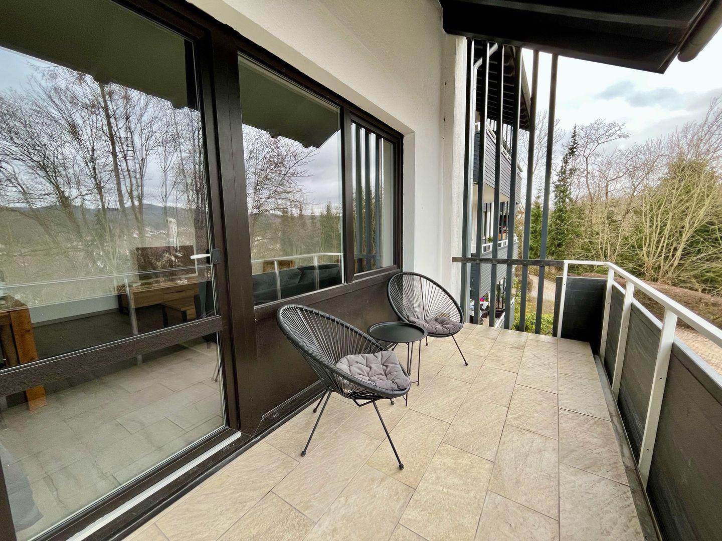 Im Wohnzimmer findest Du eine gemütliche Schlafcouch (1,60 x 2,00 m), einen Fernseher sowie einen Esstisch mit vier Stühlen. WLAN steht kostenlos zur Verfügung. Vom Wohnzimmer aus hast Du Zugang zum Balkon, der einen schönen Blick auf den Ravensberg und den Ort bietet.