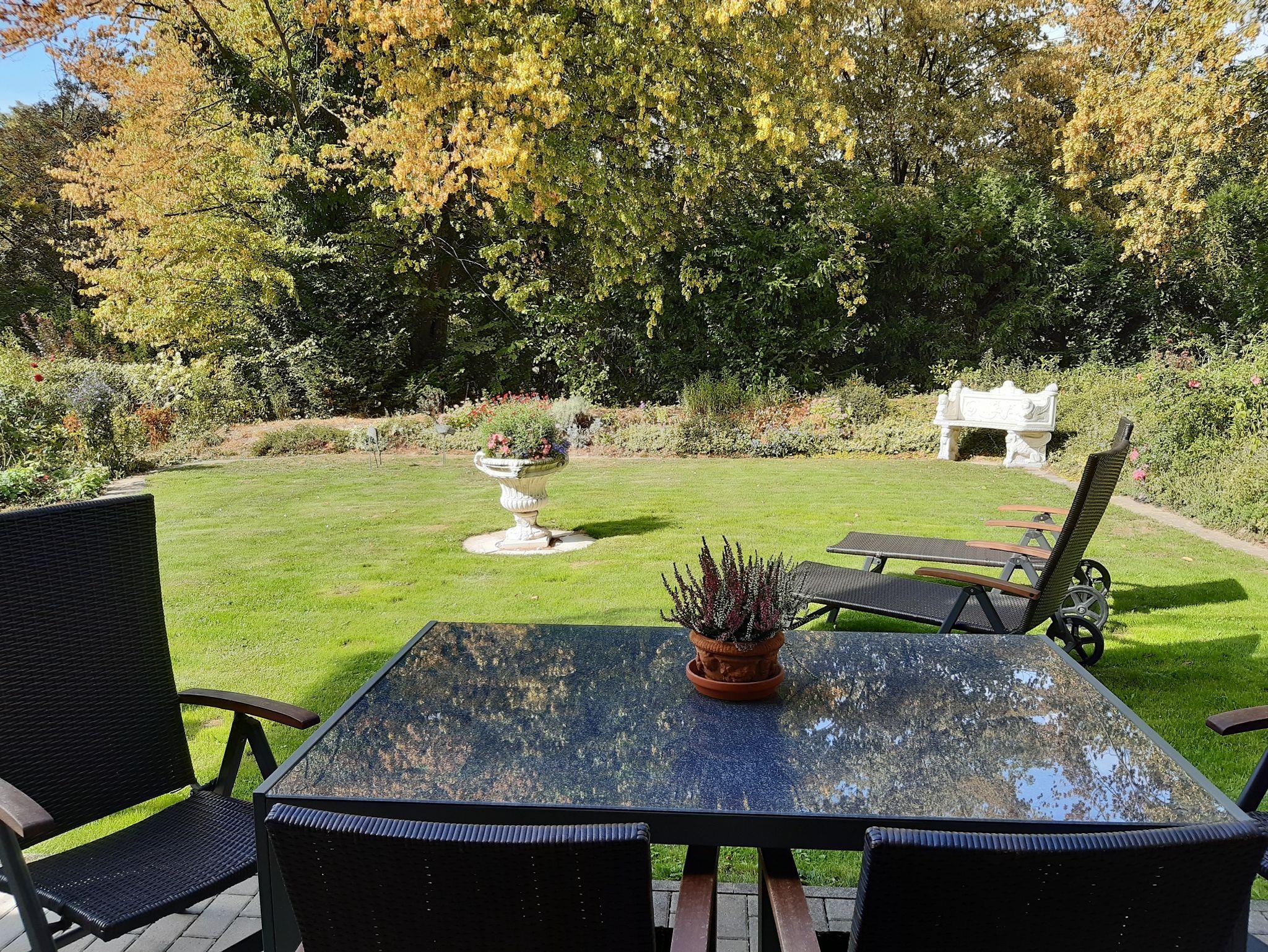 Über die eigene Terrasse, durch den eigenen Garten direkt in den Kurpark!