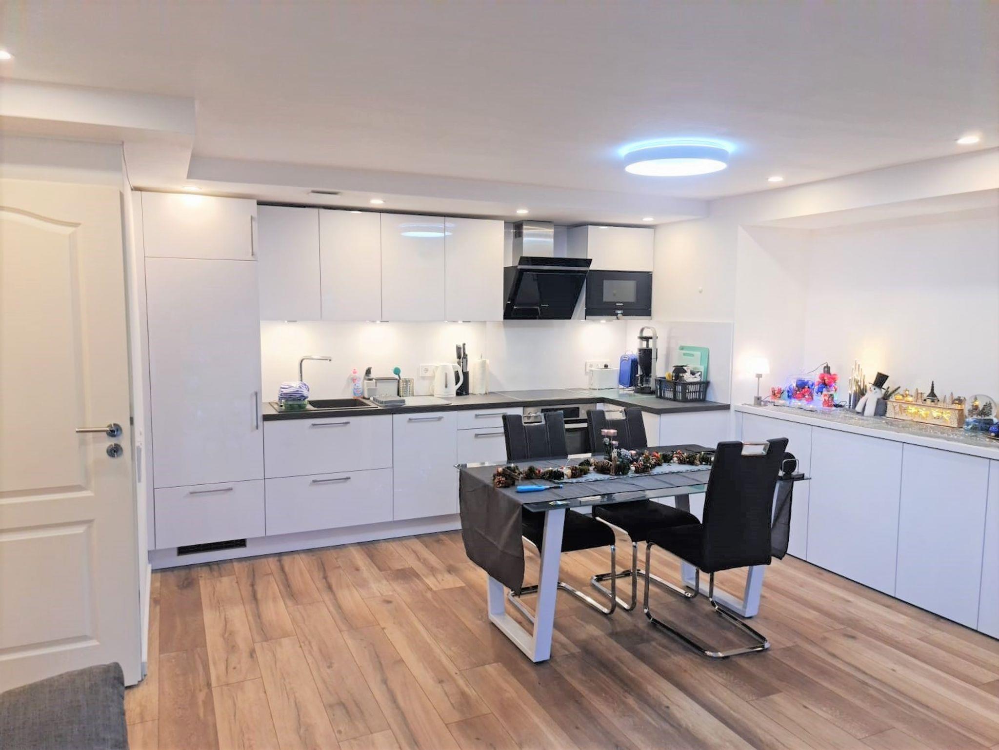 großer Wohn-/Speiseraum mit moderner Komplettküche inkl. Geschirrspüler, Mikrowelle etc.;