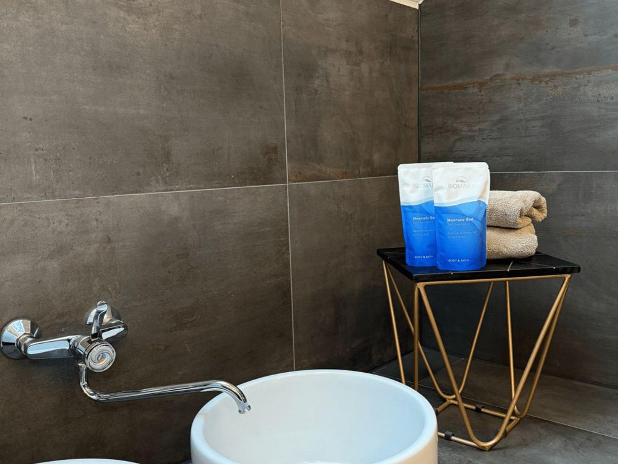 Ein besonderes Detail: das in das Bad integrierte Fußbecken. Ob nach einem Spaziergang durch den Kurpark oder einer Fahrradtour – hier finden müde Füße wohltuende Erleichterung.