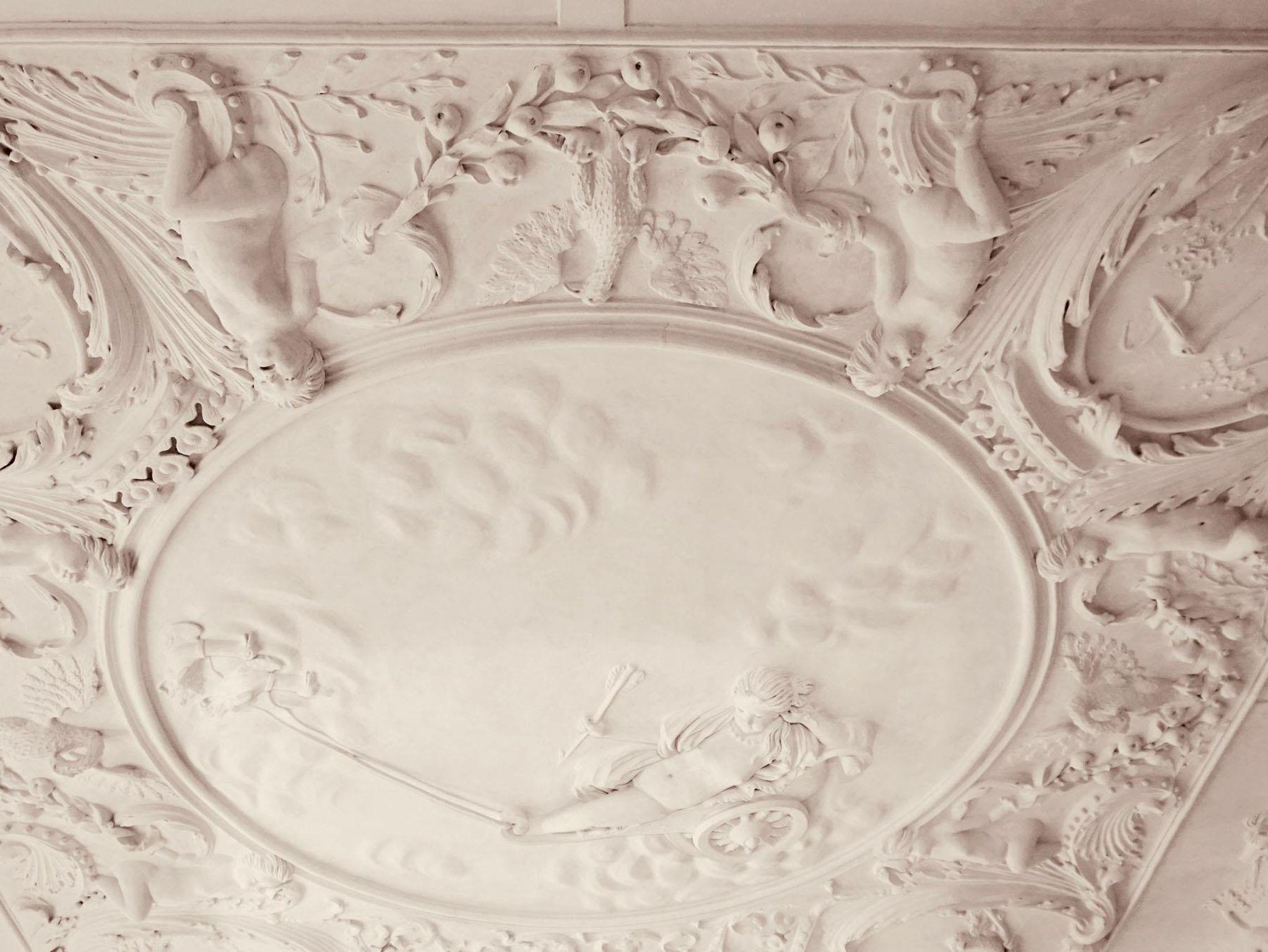 In der schmuckvollsten Suite des Schlosses wohnte die Herrschaft von Prossen von jeher. Zeugnisse der historischen Bedeutung des Barocksaals sind seine kunstvollen Wandbemalungen und die aufwendig restaurierte Felderdielung. Gekrönt wird der Raum von einer hervorragend erhaltenen figuren- und ornamentreichen Stuckdecke aus dem Hochbarock. Der große Balkon zeigt gen Süden zum Schlosspark und zur Elbe hin. Die einstige Kemenate beherbergt nun die voll ausgestattete Küche mit Nespresso-Kapselmaschine. Das Bad ist in einem originellen Separee angeordnet. Im Schlafgemach, das einst wohl als Musikkabinett diente, ruhen Sie im romantischen Doppelbett unter historischen Stuckaturen und genießen ebenfalls herrliche Ausblicke auf die eindrucksvolle Umgebung.