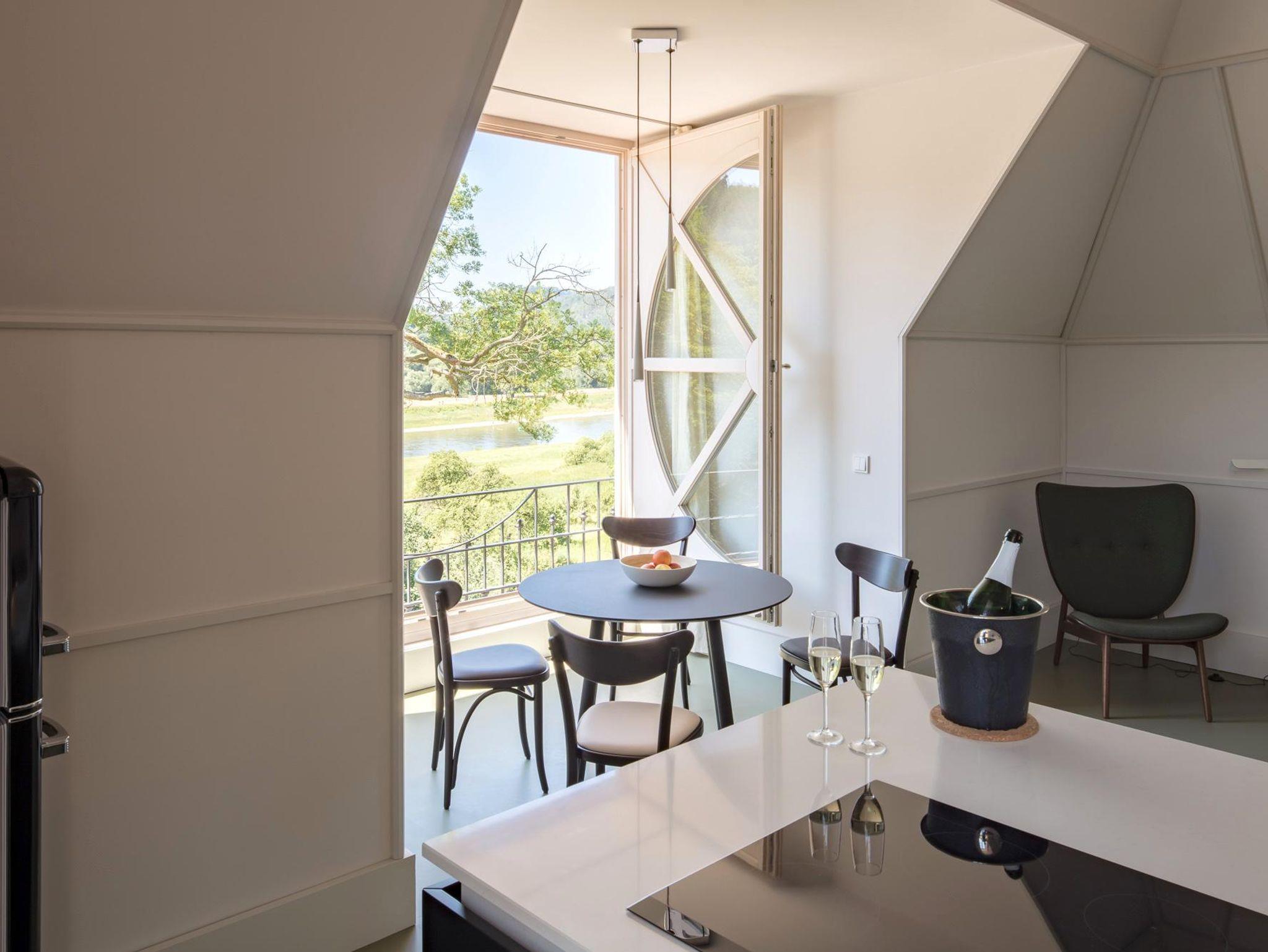 Durch das große, charakteristische Rundfenster genießen Sie unverstellte Blicke auf den majestätischen Lilienstein und die Festung Königstein. Hoch oben im Südgiebel erwartet Sie ein großzügiger, privater Wohnbereich, der Ihnen alle Annehmlichkeiten bietet – hier können Sie kochen, essen und ausruhen. Dachschrägen und sichtbare Kehlbalken geben dem Raum ein besonderes Flair. Im separaten Schlafgemach und auf der Schlafgalerie über dem Wohnsalon stehen Betten für insgesamt drei bis vier Personen zur Verfügung. Der Wohnsalon bietet zudem die Möglichkeit der Aufbettung für eine Person. Die modern eingerichtete Suite verbindet stilvollen Wohnkomfort und fantastischen Ausblick in alle Richtungen zu einem eindrücklichen Erlebnis.