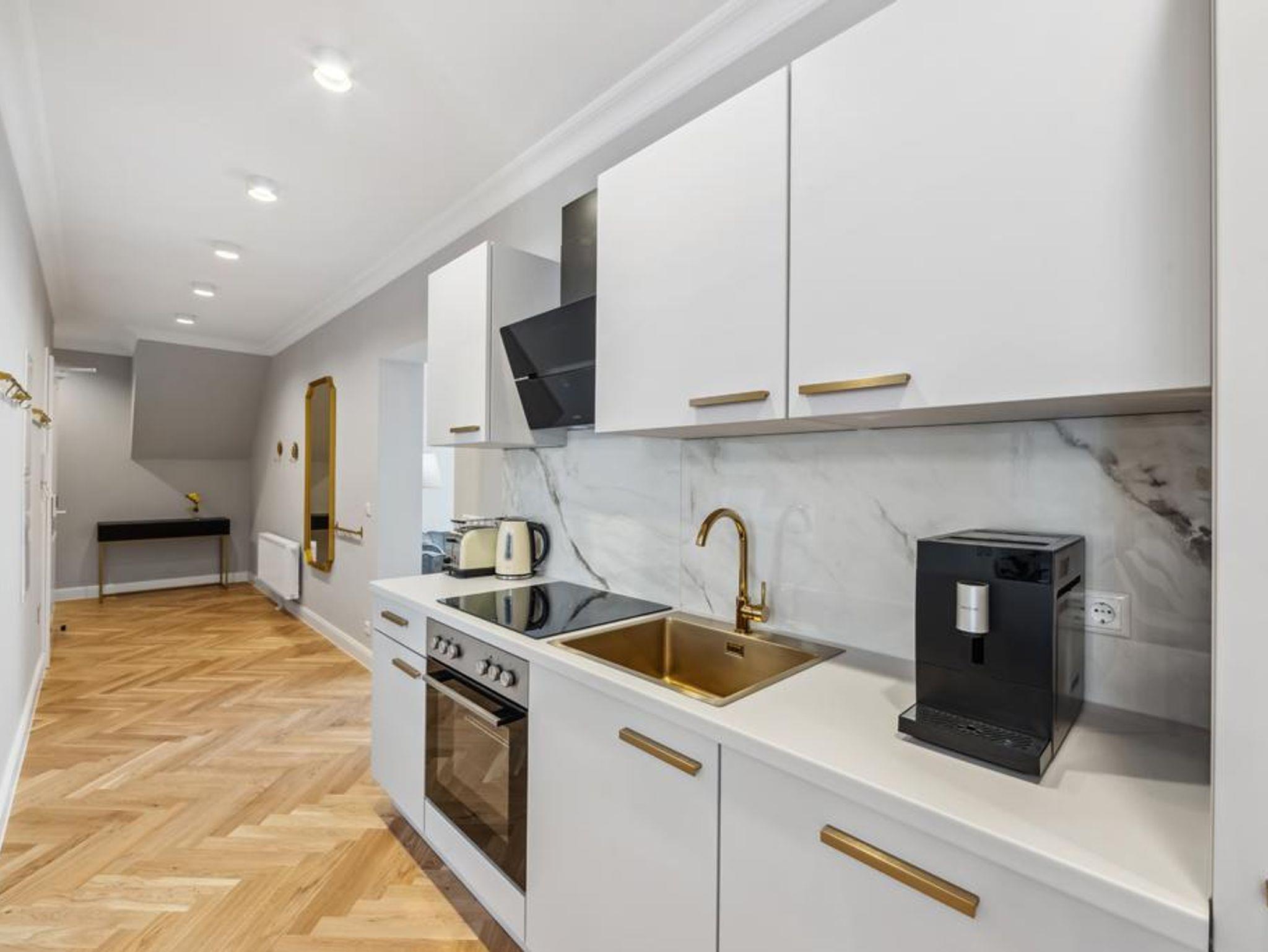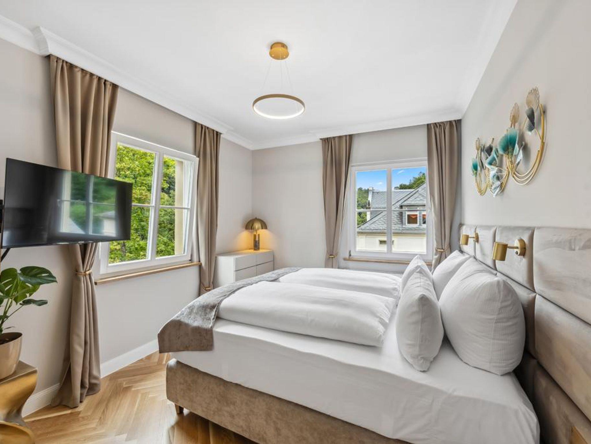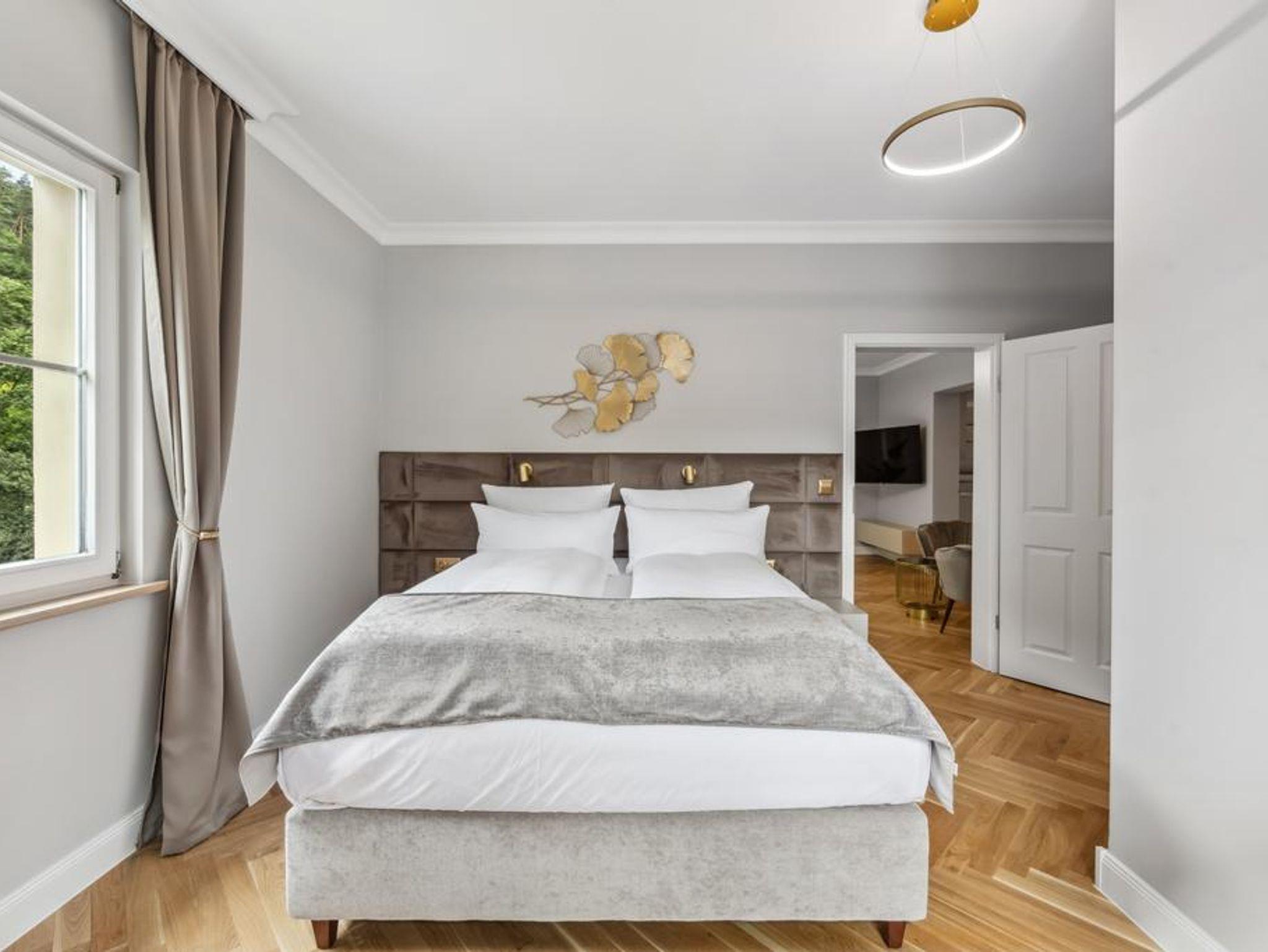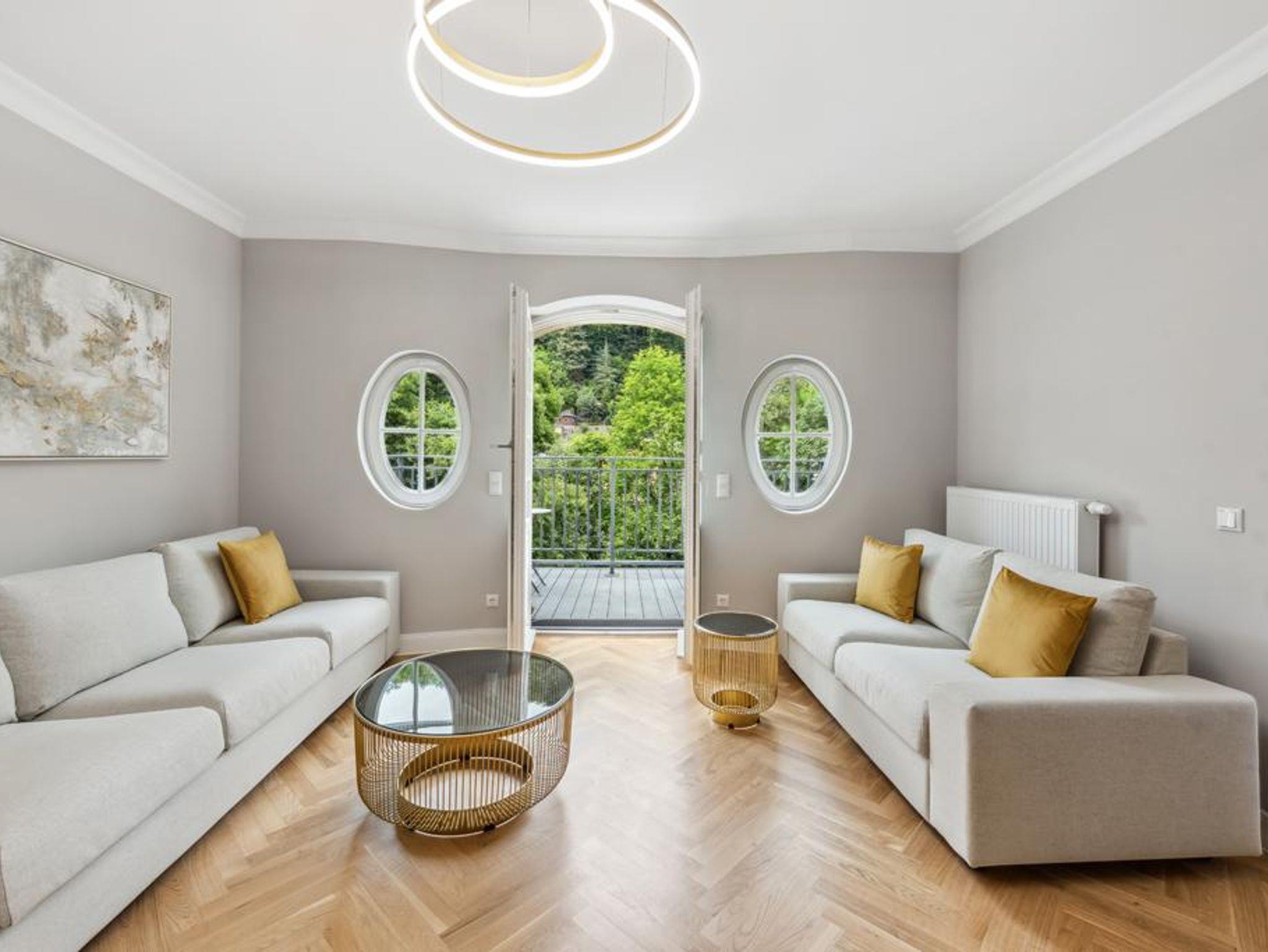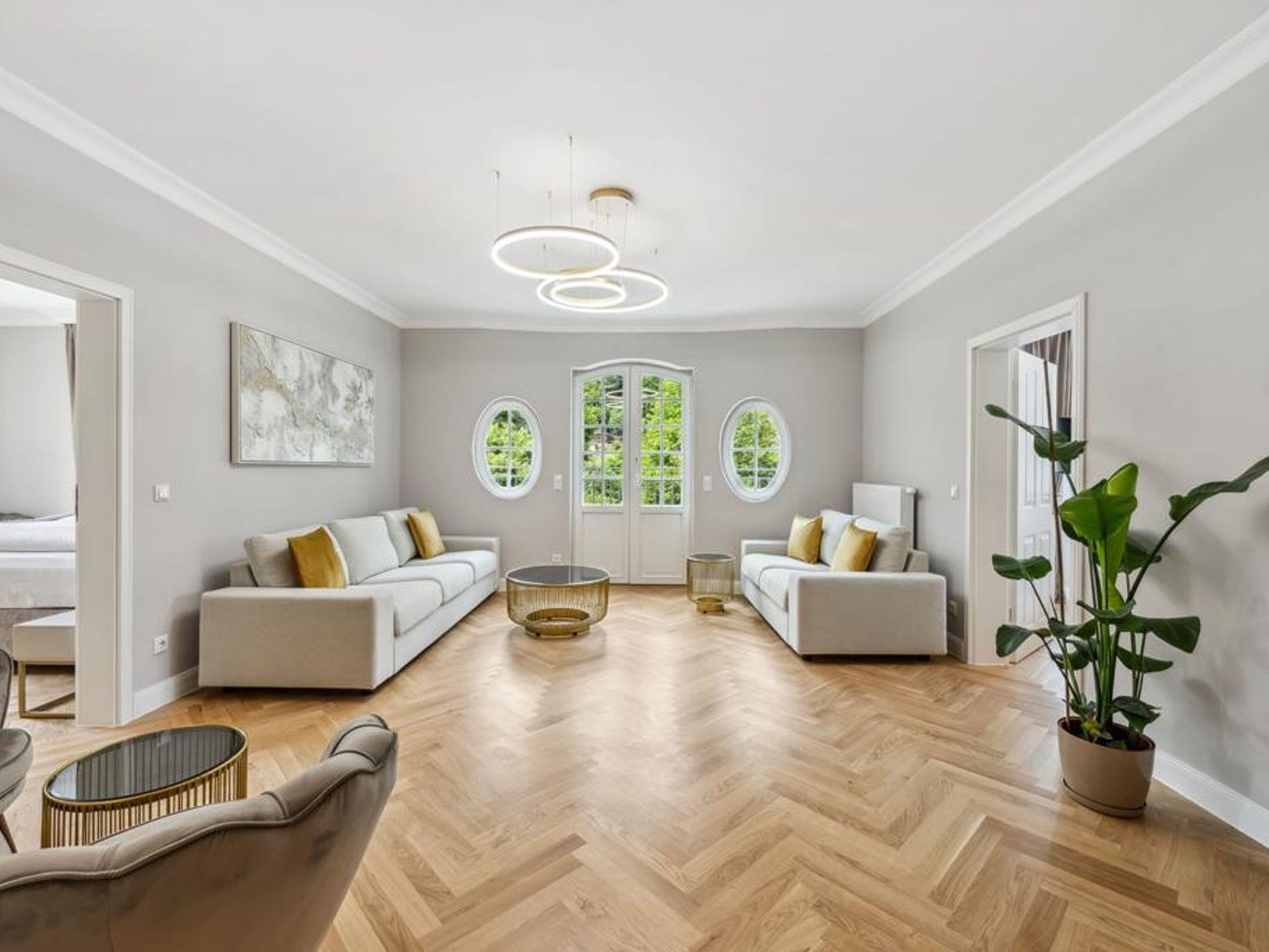 Genießen Sie hochwertige Boxspringbetten, luxuriöse Bettwäsche, elegantes Fischgrätenparkett und eine private Sauna. Entspannen Sie auf Ihrem Balkon. Historischer Charme trifft modernen Luxus - Ihr neues Zuhause fernab von Zuhause.
