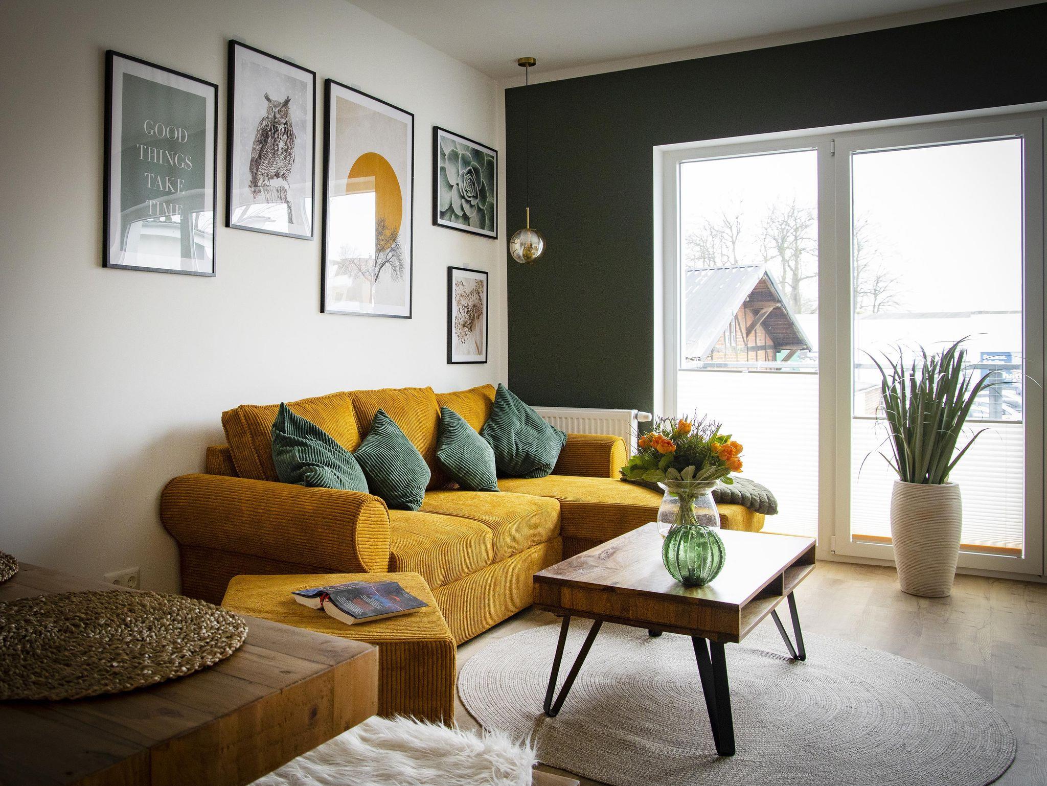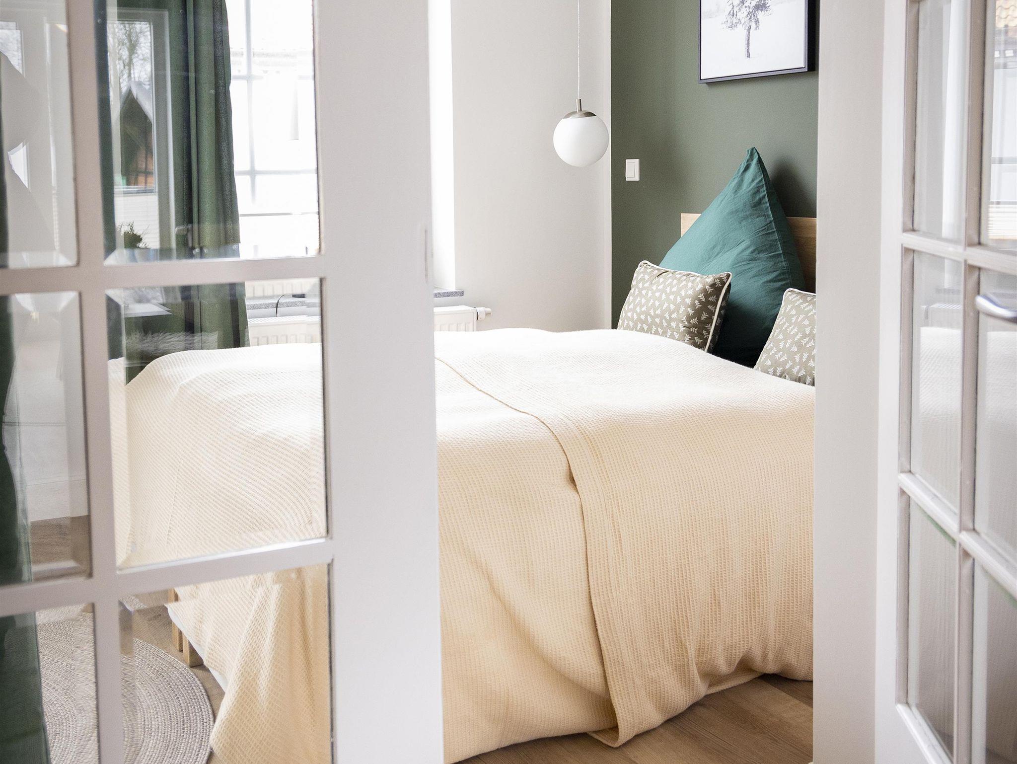 Die Ausstattung ist grundsätzlich für sechs Personen vorhanden. Für eine erwachsene Person oder 2 Kinder kann die moderne Schlafcouch mit einer Liegefläche von 2 m x 1,4 m im Wohnzimmer genutzt werden. Zwei Personen schlafen im Queen Size Bett (160cm) im Schlafzimmer.