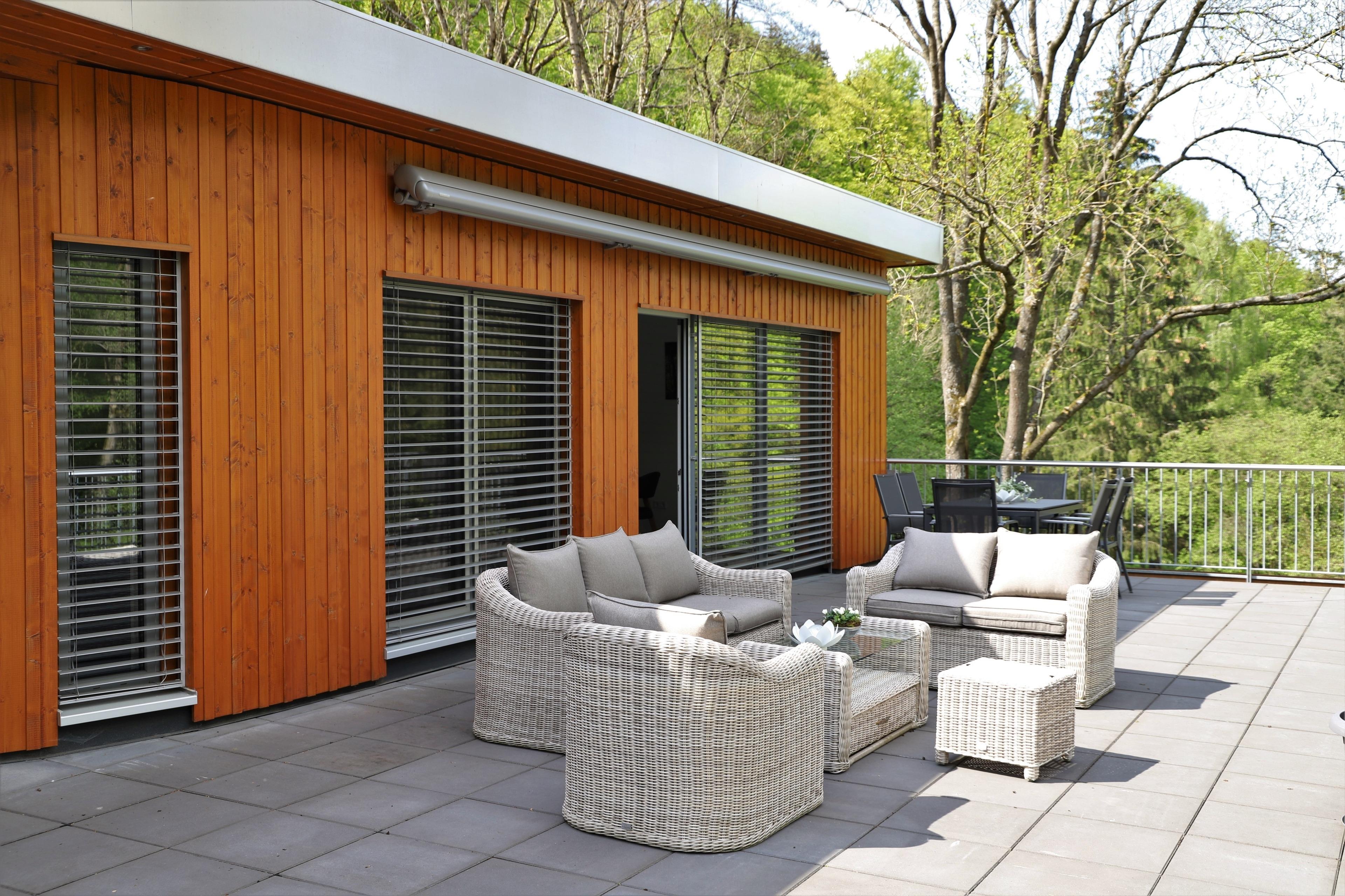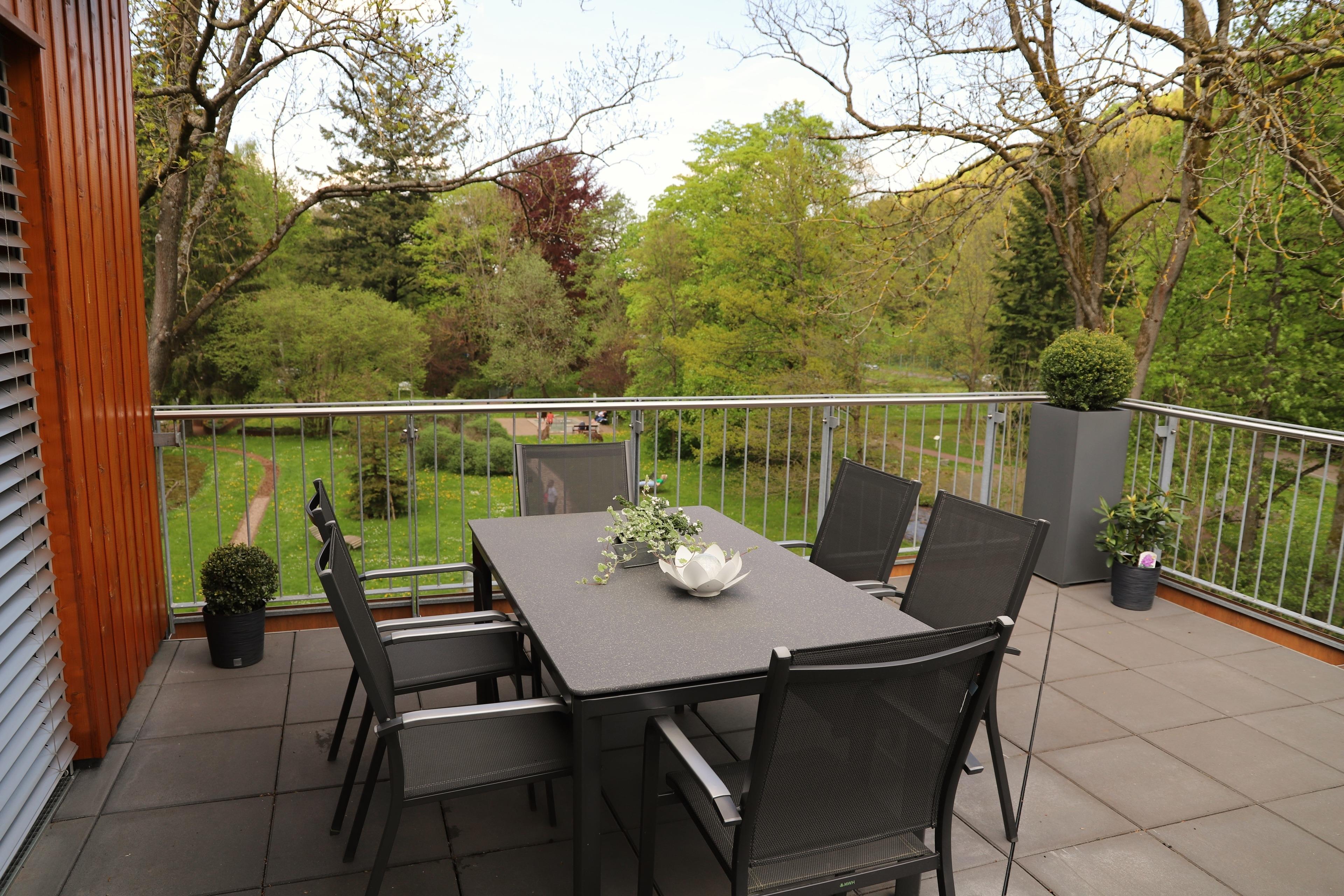 1 Bad mit Badewanne und 1 Bad mit Dusche stehen zur Verfügung. Die Wohnung bietet außerdem eine möblierte 73 m² große Dachterrasse mit Blick auf die Kneipp-Kuranlage und umliegende Wanderwege. Die offene Küche ist mit Backofen, Tellerwärmer, Mikrowelle, Herd, Kühl-Gefrierkombi, Kaffeevollautomat, Wasserkocher, Toaster, Kochgeschirr, Essgeschirr, Besteck und mit Gläsern ausgestattet. Eine Waschmaschine und ein Wäschetrockner wie auch ein Bügeleisen sind vorhanden. Auf der gemütlichen Couch können Filme auf einem 66 Zoll TV-Gerät geschaut werden. Das Licht am Abend kann individuell mit Fernbedienungen geregelt werden. Gaststätten, Cafés, Bäckereien mit Frühstücksmöglichkeiten und Geschäfte gibt es im Stadtzentrum, welches ca. 900 m entfernt ist.