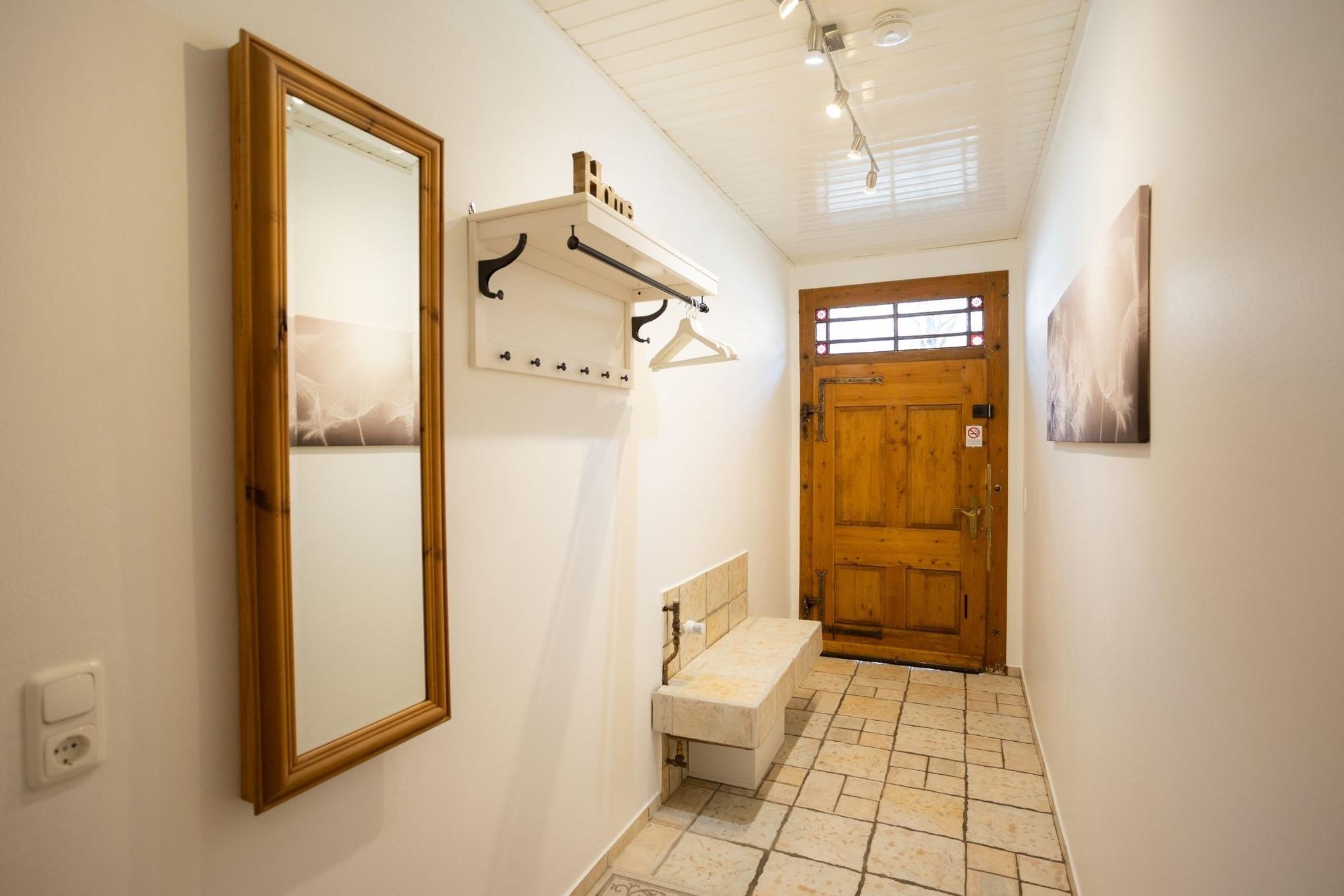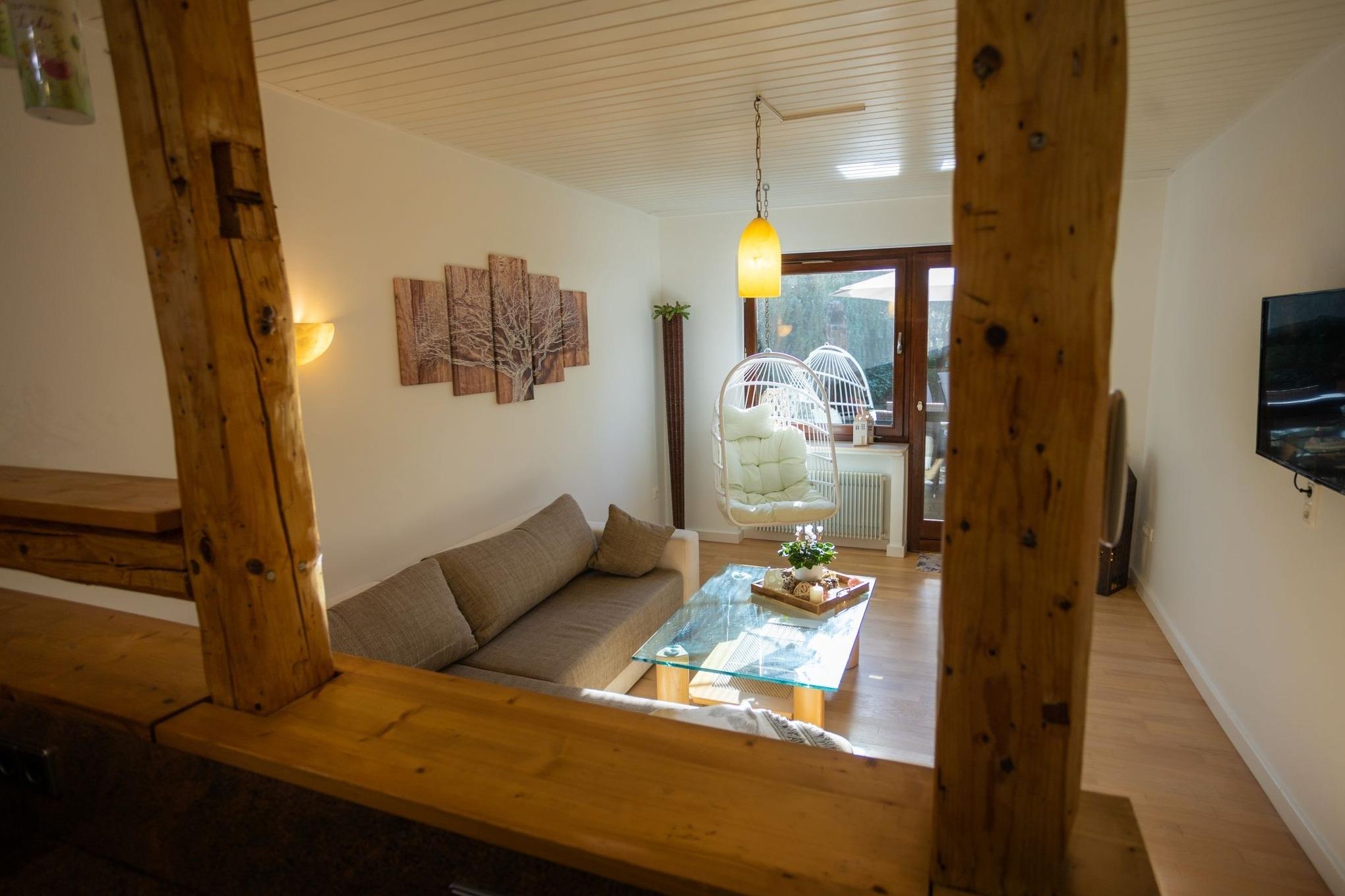 Fachwerkwohnung mit romantischem Privatgarten im Dorfzentrum. 2 Schlafzimmer, 2 Homeofficeplätze mit schnellem Gratis-WLAN, Smart-TV, kostenlose Parkplätze.