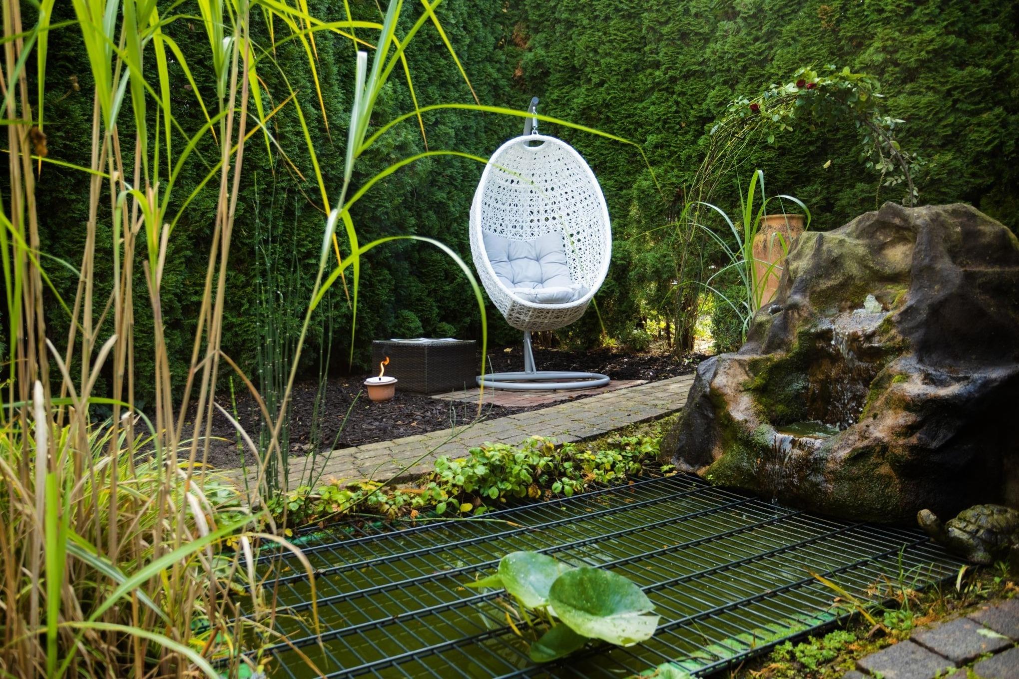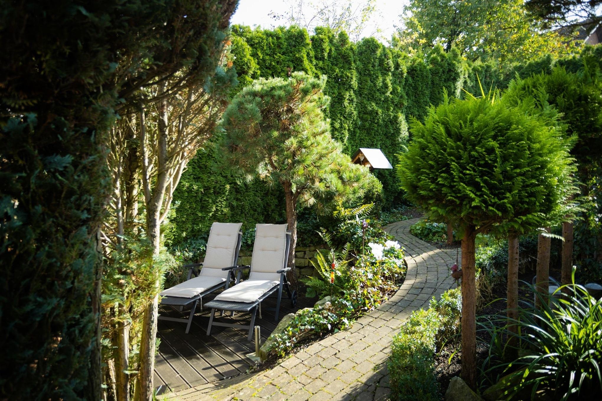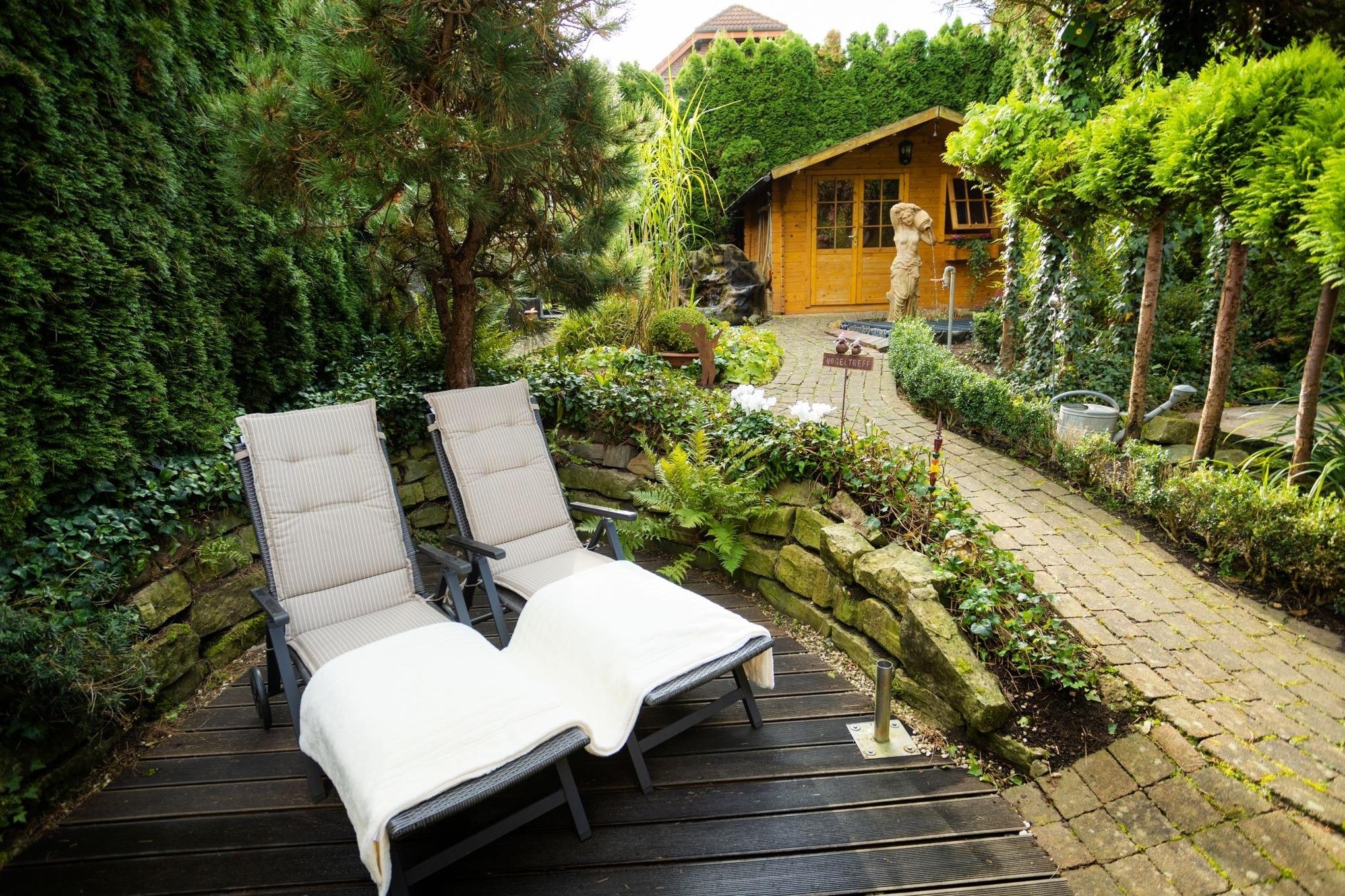 Das Besondere: Der Garten mit Terrasse, zwei kleinen Teichen und dem leisen Plätschern von Wasser. Hier entsteht sofort eine Atmosphäre, die Ruhe schenkt – mitten in Bad Wünnenberg und doch ganz privat.