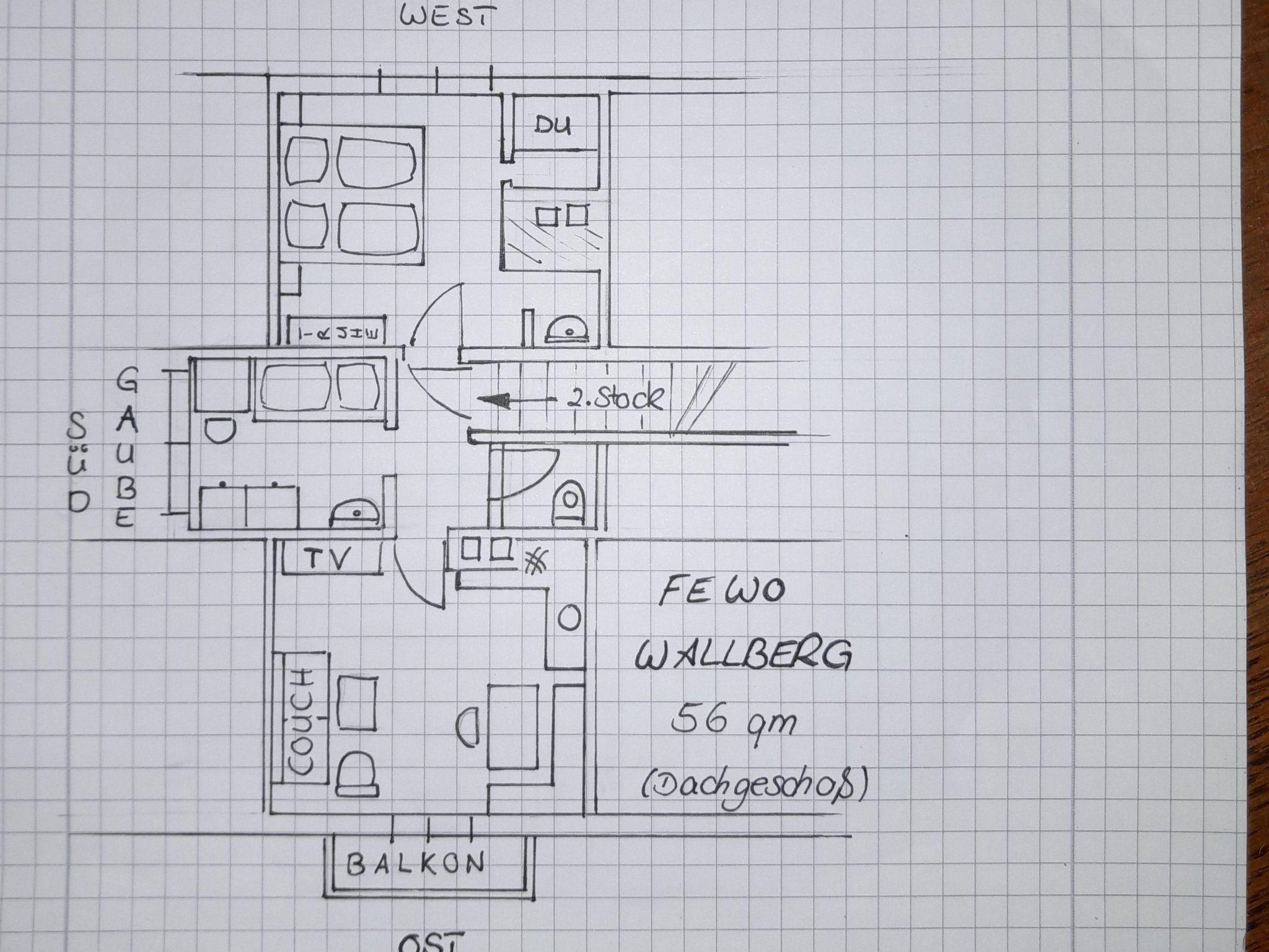 Unsere heimelige Ferienwohnung Wallberg mit ca. 56 qm befindet sich im 2. Stock (Dachgeschoss, Teppichböden).