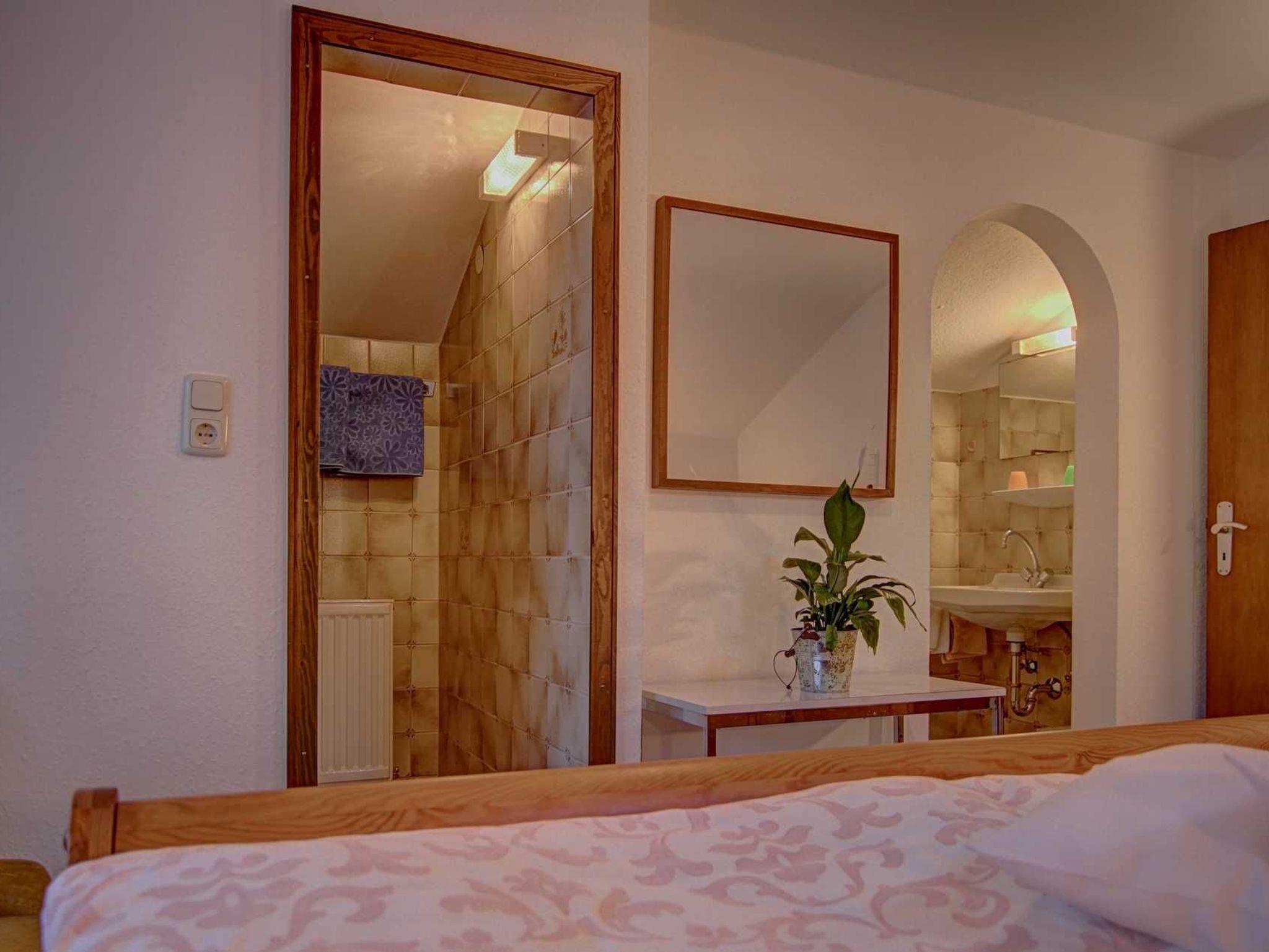 Schlafzimmer mit Doppelbett inklusive Duschecke und