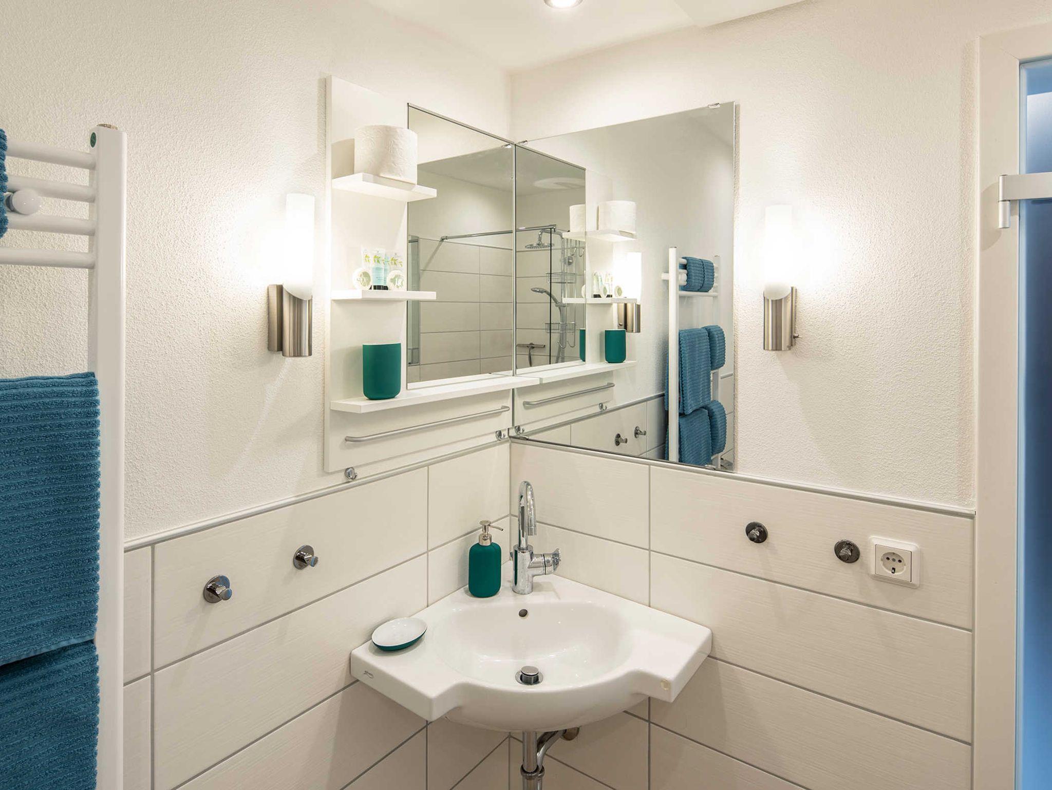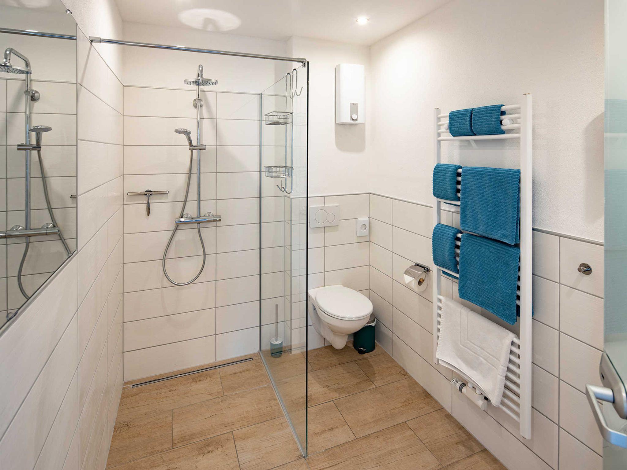 Das Badezimmer ist modernster Standard und verfügt über eine bodenebene Dusche.