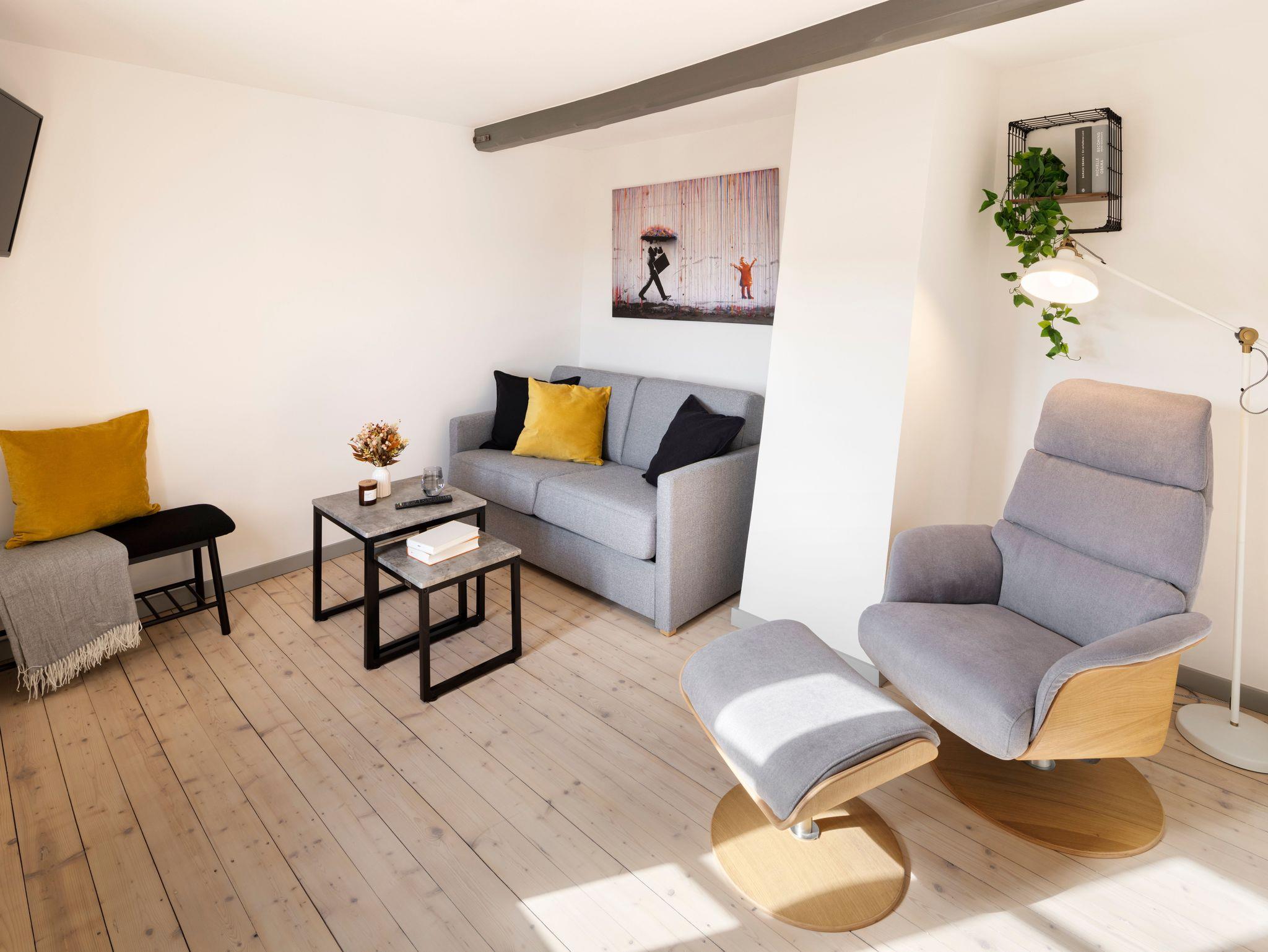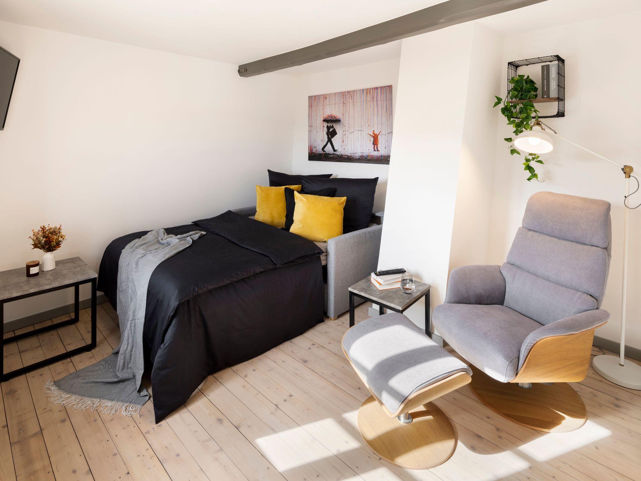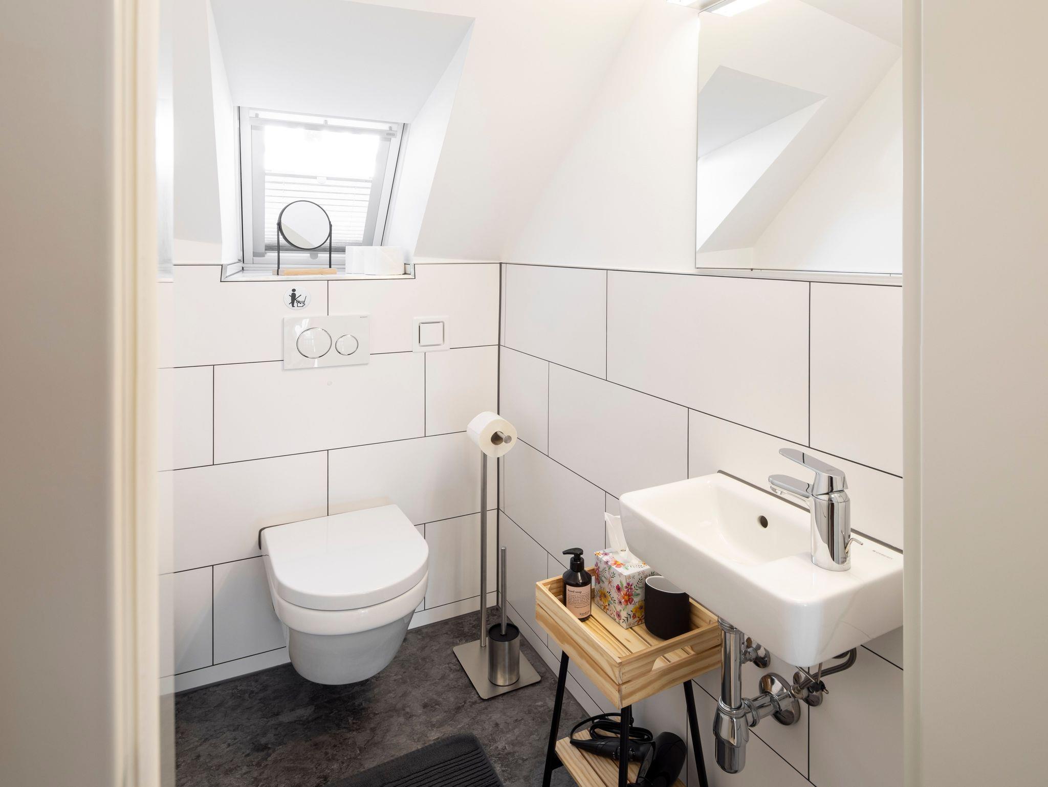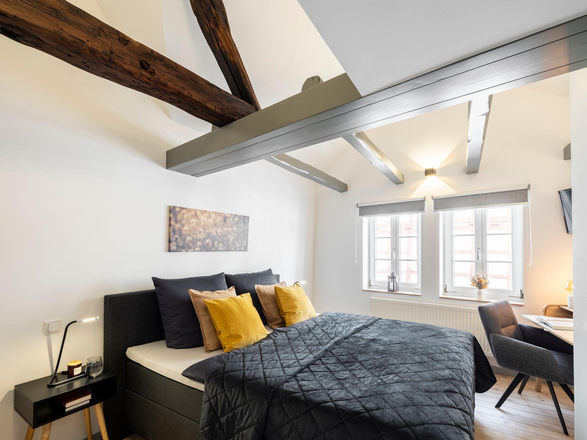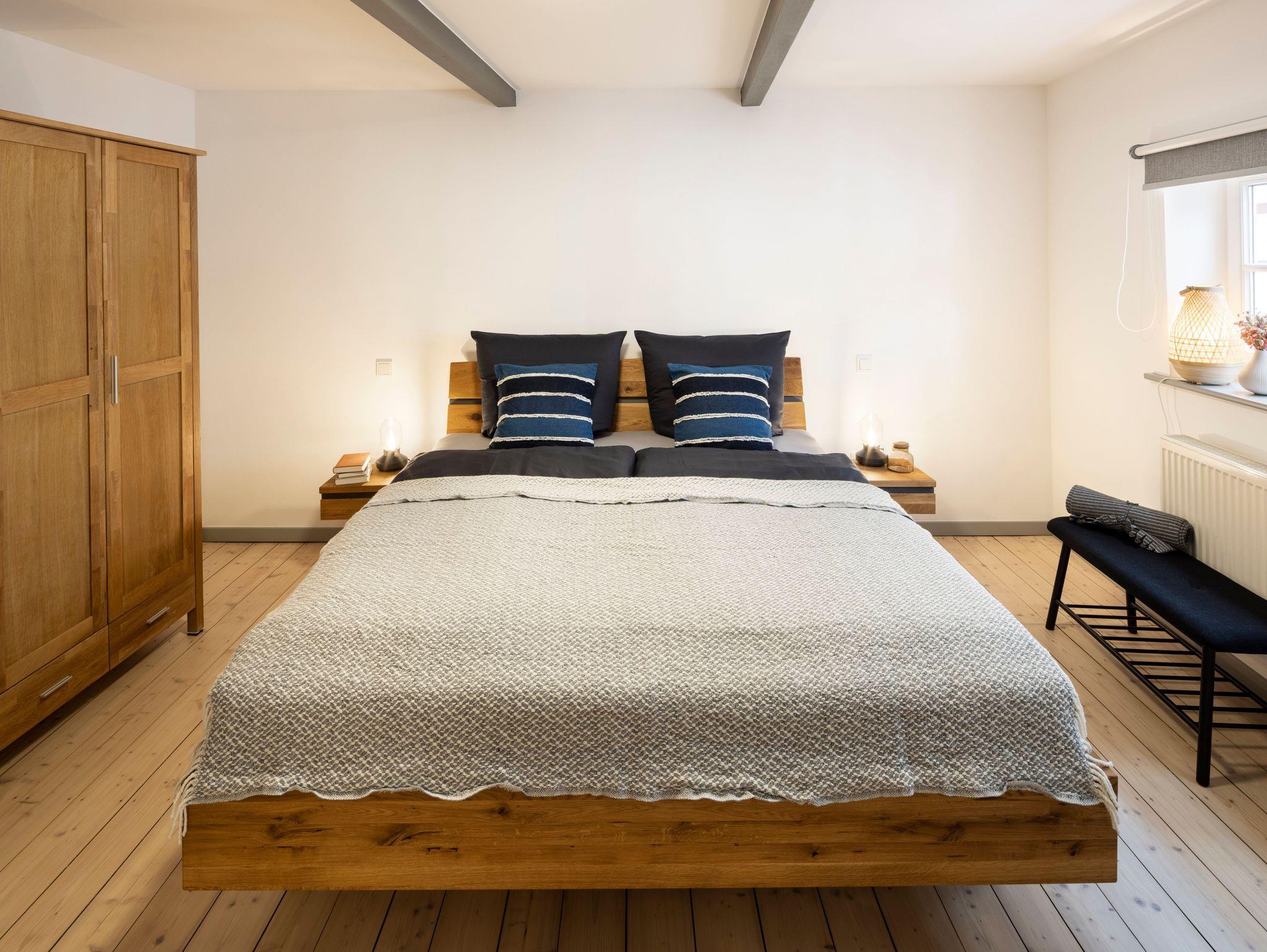 Der „Master Bedroom“, im zweiten Obergeschoss, ist sicher das Schlafzimmer mit dem firsthohen Dachausbau, der durch die liebevoll sanierten Balken ein ganz besonderes Flair versprüht. Hier lässt es sich prima schlafen in dem Eichenholz-Bett mit 1,80 m Breite und wenn es doch mal nötig ist, an dem schicken Schreibtisch auch arbeiten. Ein weiteres kleines Zimmer, das mit einem Schlafsofa (140 x 200m) eingerichtet ist, bietet einen gemütlichen Rückzugsort. Auch in dieser Etage gibt es ein separates WC und einen kleinen Raum, der mit einer Dusche ausgestattet ist.