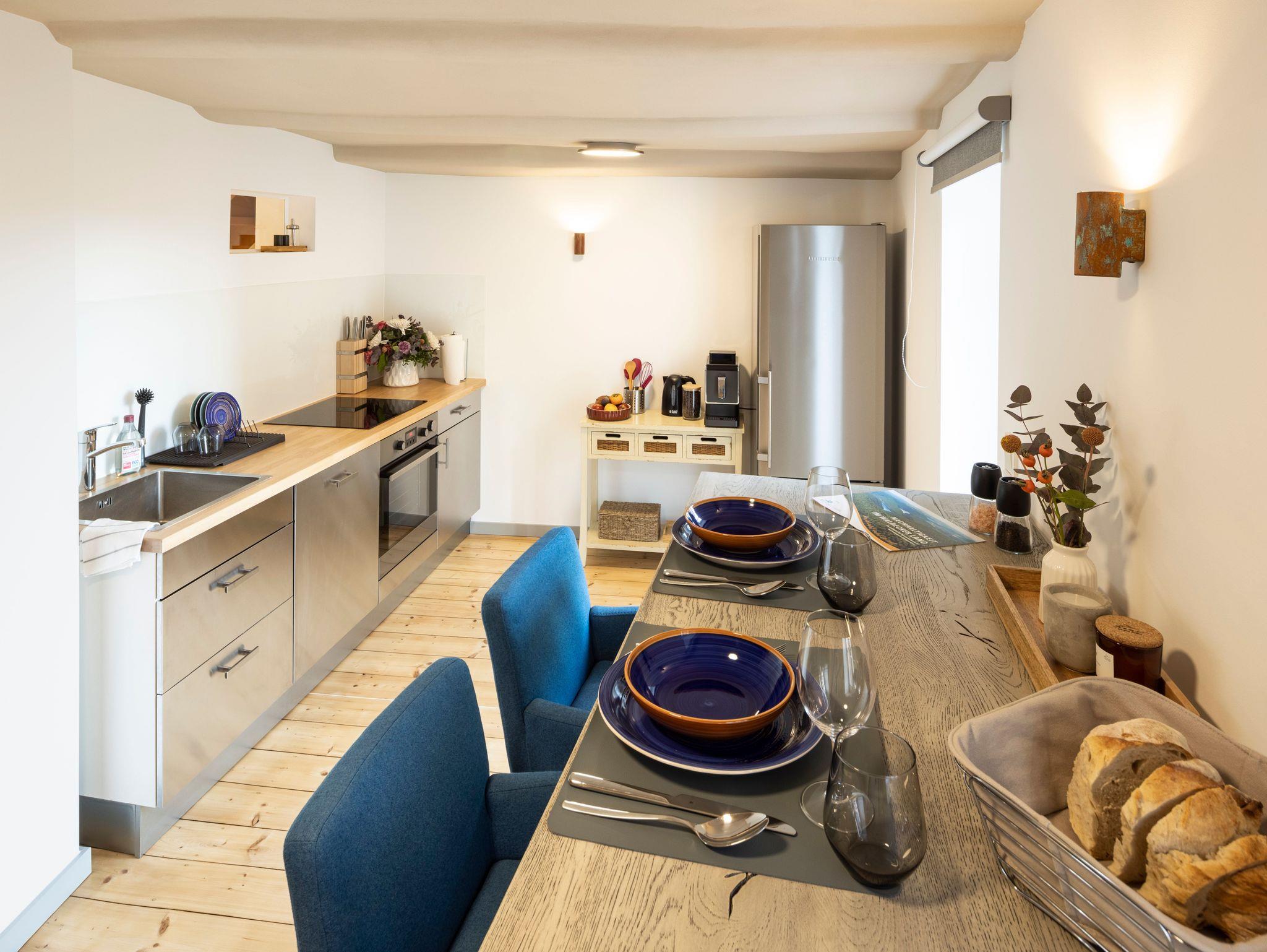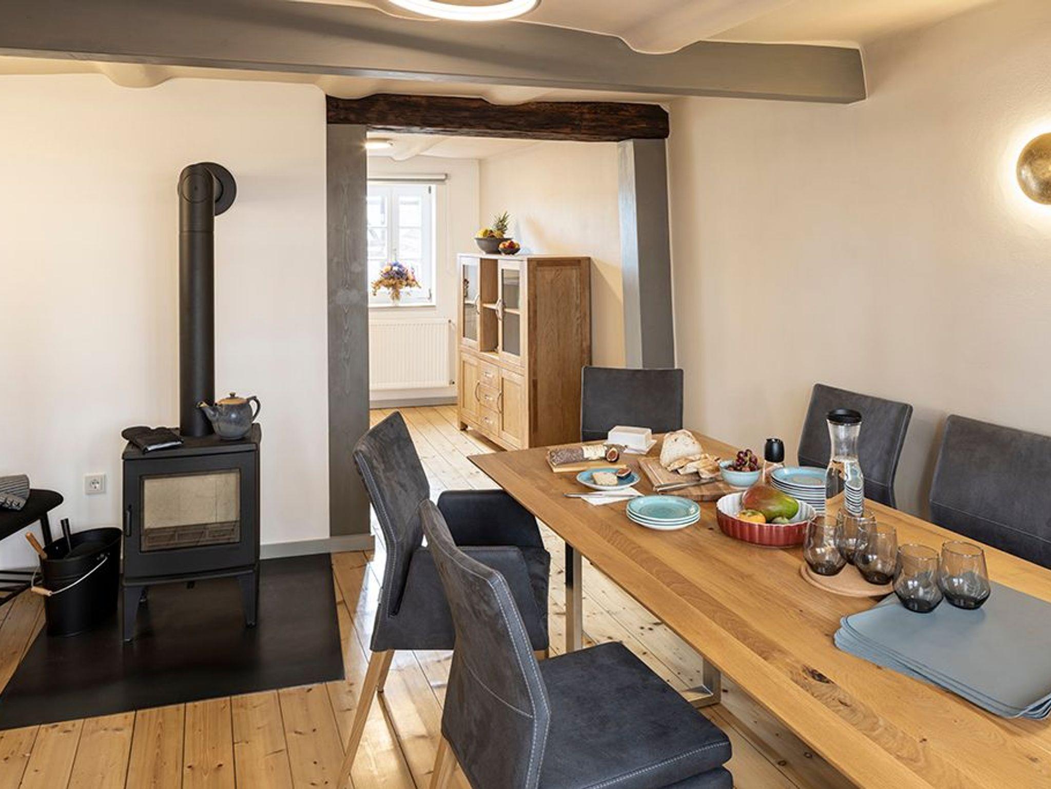 Betritt man das Haus, gelangt man über ein paar Stufen man auf der rechten Seite in das urige Wohn-/Esszimmer. Der große Holztisch lädt zum Spielen, Essen oder geselligem Beisammensein ein. Der Kaminofen gibt in den kälteren Monaten die besondere, kuschelige Gemütlichkeit. Direkt angrenzend befindet sich die komplett ausgestattete Küche. Mit Spülmaschine, E-Herd, großem Stand-Kühl-Gefrierschrank, einem Kaffee-Vollautomaten und vielen weiteren Ausstattungsdetails lädt sie auch im Urlaub ? nicht nur Kochprofis ? zum Kochen oder Frühstückvorbereiten ein. Ein kleiner Stehtisch mit zwei Hockern bietet neben der großen Arbeitsfläche zusätzlichen Platz zum Anrichten oder einfach für den Snack zu zweit.