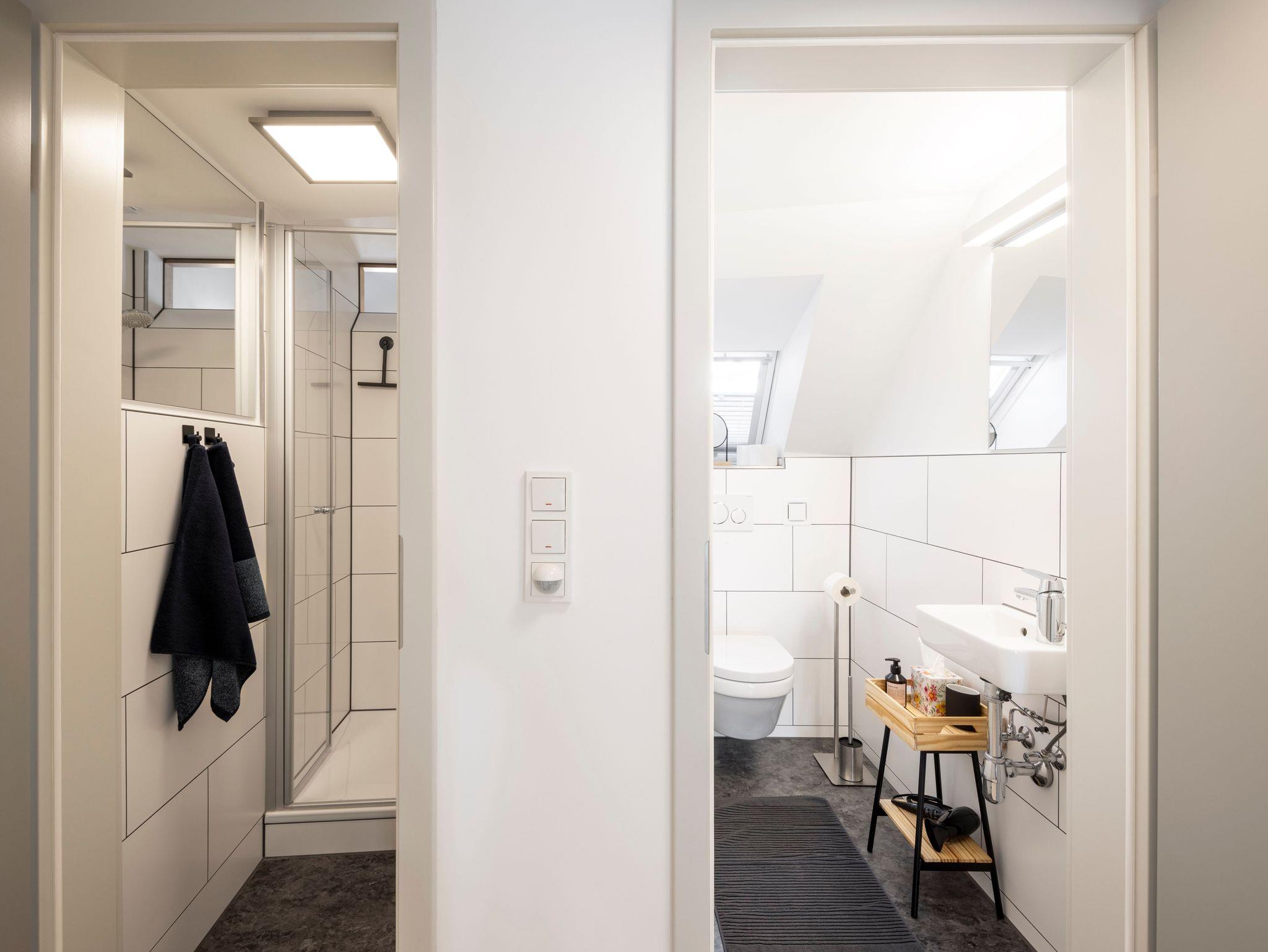 Im ersten Obergeschoss befinden sich ein größeres Schlafzimmer mit einem Boxspring-Bett (180×200 m) und ein etwas kleineres Schlafzimmer mit einem Bett für ein bis zwei Personen mit den Maßen 140x200m. Mit viel architektonischem Einfallsreichtum wurde auf dieser Etage ein separates WC mit Handwaschbecken und eine separate Dusche platziert. Die beiden kleinen Räume sind praktischerweise jeweils mit Schiebtüren versehen.