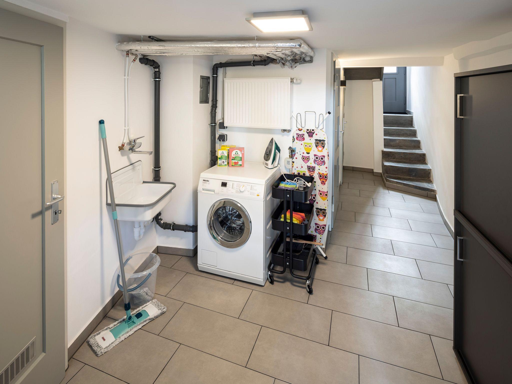 Das Kellergeschoss, das man entweder durch den Flur oder aber über die Eingangstür vom Hinterhof erreicht, ist funktional ausgestattet. Hier befindet sich die Waschmaschine, Platz zum Wäschetrocknen oder zum Abstellen der Fahrräder oder des Kinderwagens.